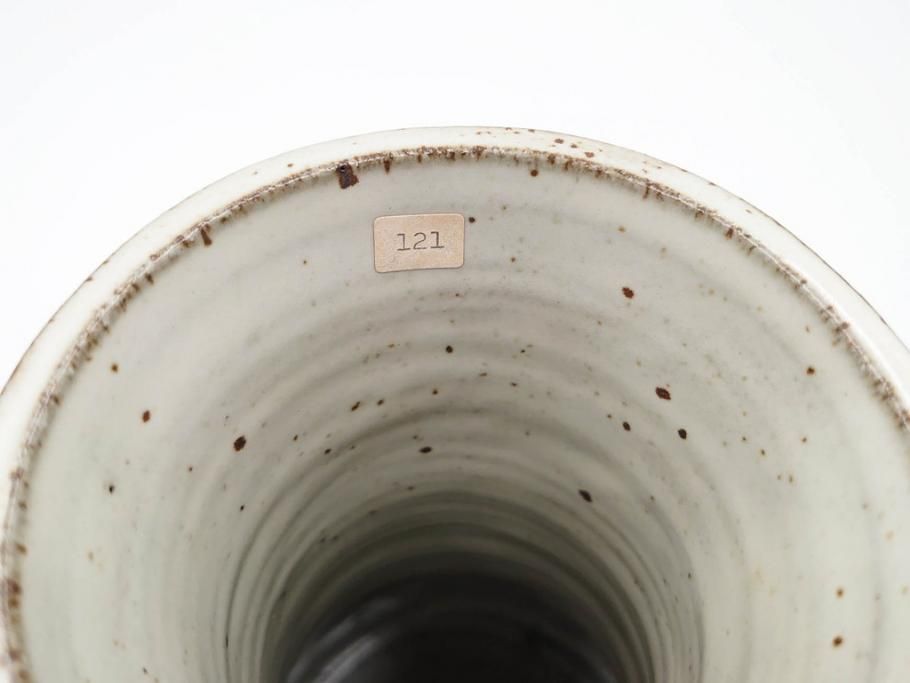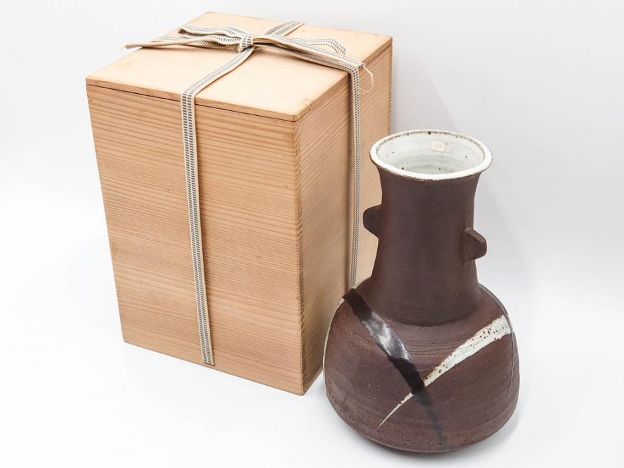 1981年作 ジャネット・リーチ(Janet Leach) 耳付花瓶 赤地白流釉 バーナード・リーチ夫人 高さ 約26cm 落ち着いた色合いとモダンなデザインが上質な雰囲気を演出する花瓶(J・L、花生、花入、花器、フラワーベース)(R-084493)