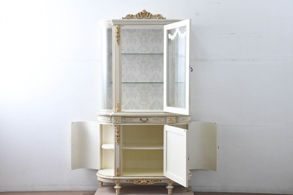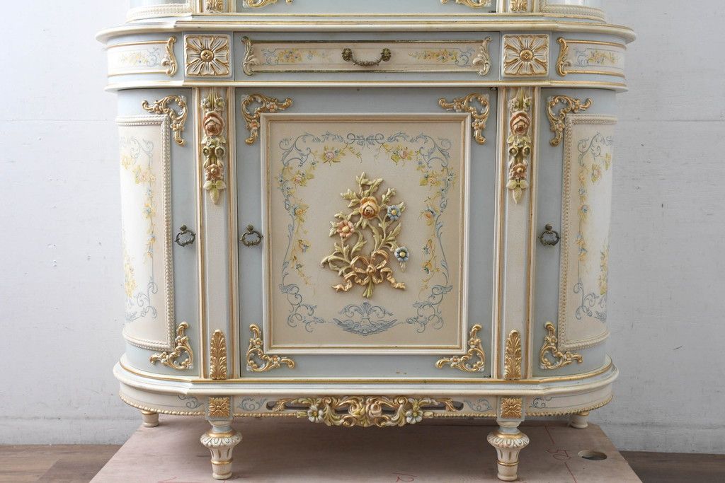 店舗什器 > 中古 イタリア高級家具 ロココ調 Mario Colciago&Figli(マリオ・コルチャゴ) Fratelli Origgi(フラテッリ・オリッジ) 曲線を活かした優雅なフォルムと装飾が魅力的なガラスキャビネット(キュリオケース、ガラスケース、ショーケース、飾り棚、Rガラス、曲げガラス、店舗什器)(定価約180万円)(R-084512)