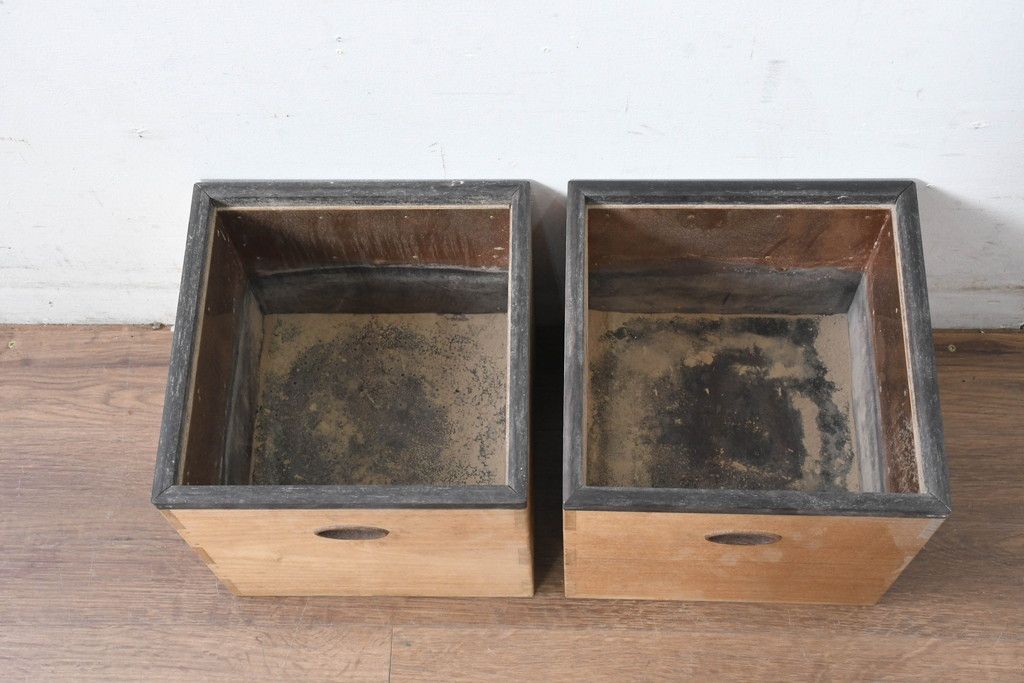 和製ビンテージ 黒柿縁 桐材 和モダンな雰囲気漂う角火鉢2点セット(木製火鉢、手あぶり、ヴィンテージ)(R-084539)