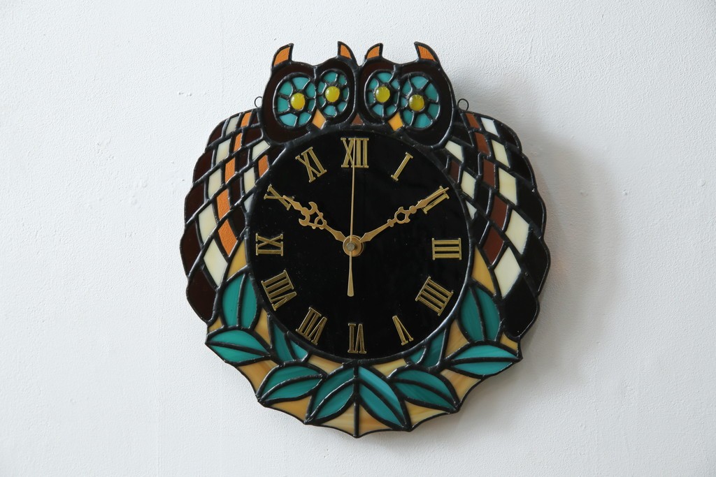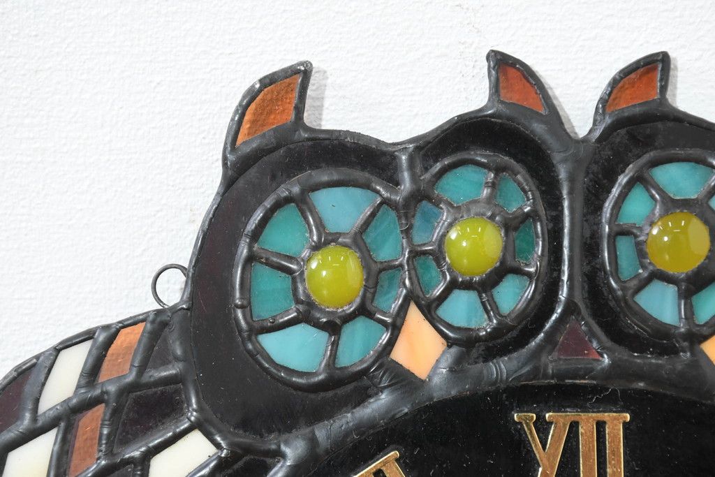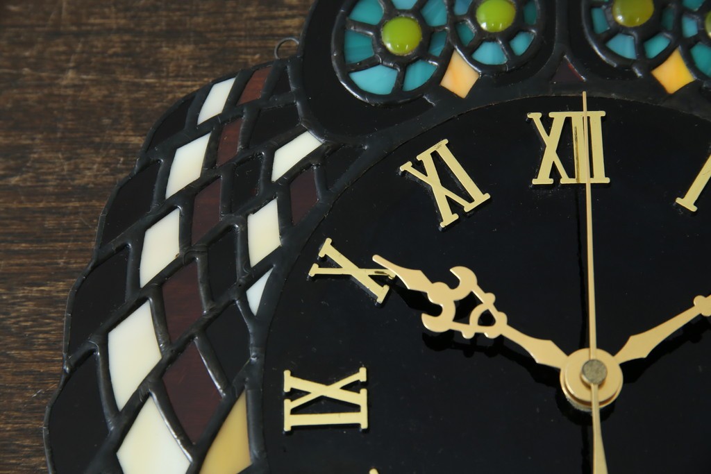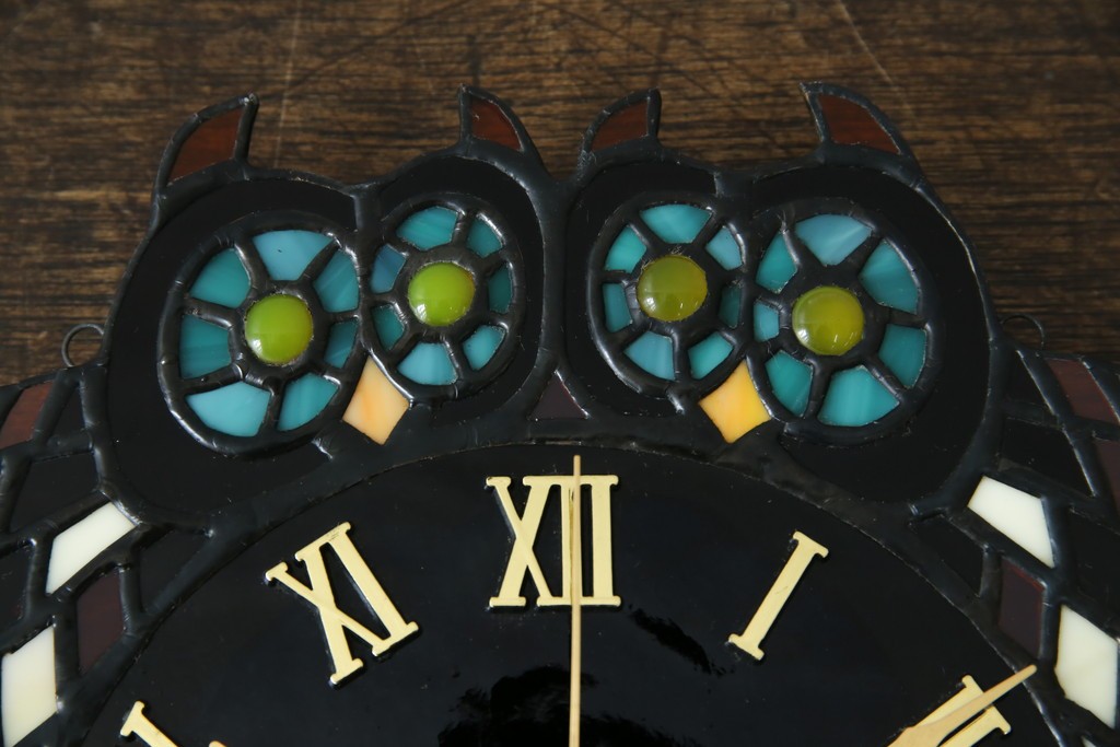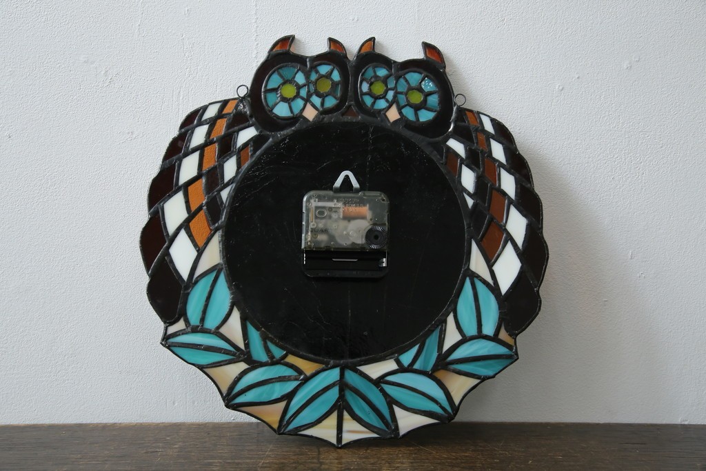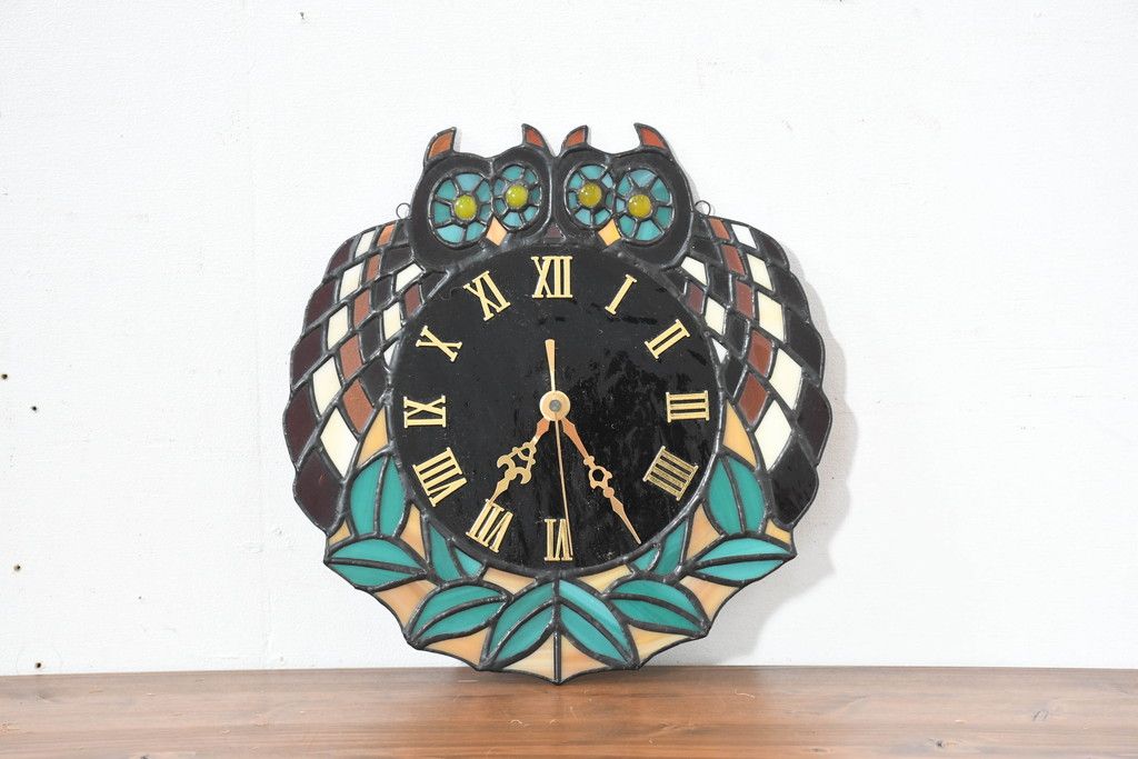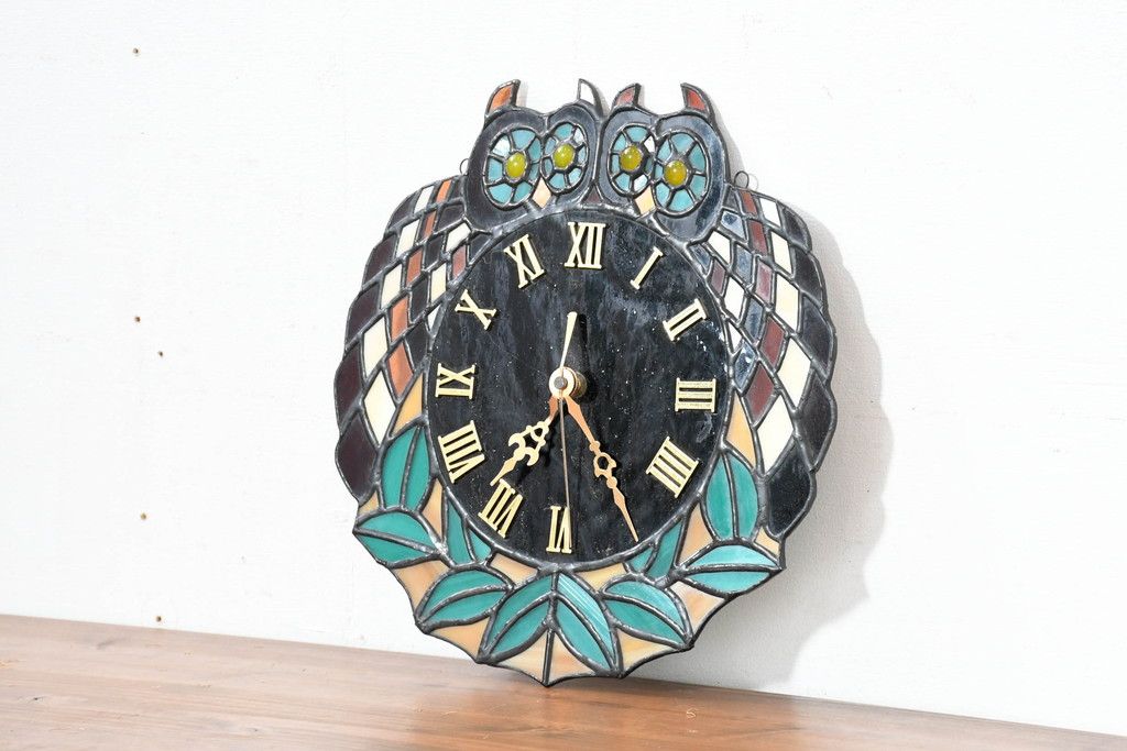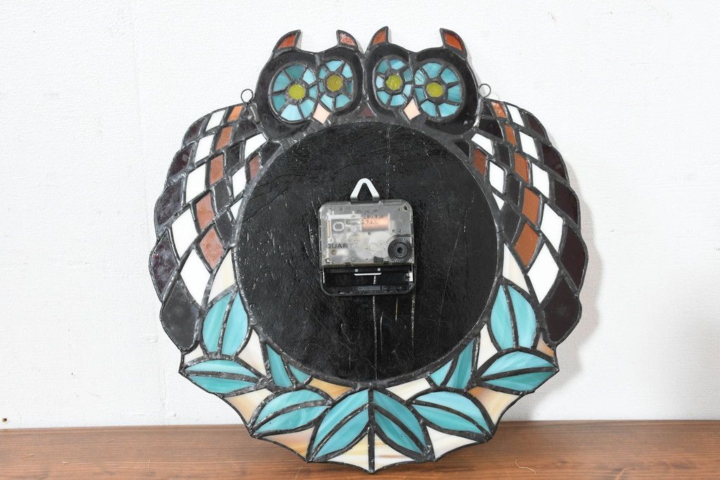 時計> 掛け時計 > 中古 希少!! 作家物!! ステンドグラス芸術家 伊藤誠二 つがいの梟(フクロウ・ふくろう) ステンドグラスの壁掛け時計(ウォールクロック)(定価約13万円)(R-084558)