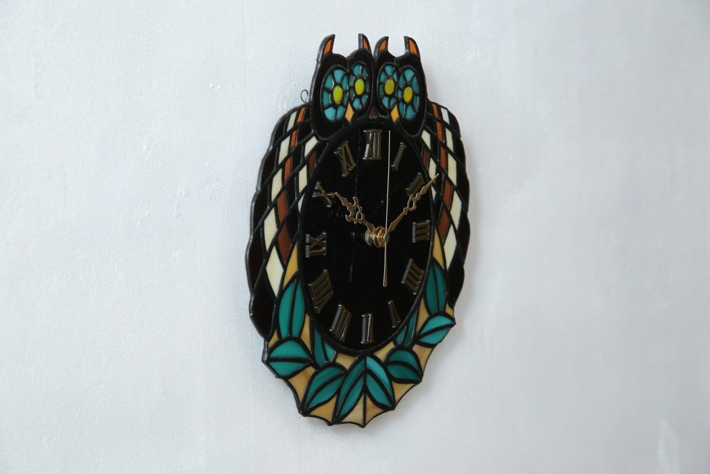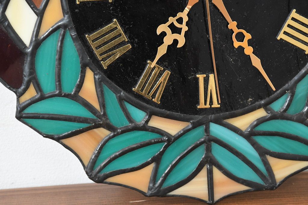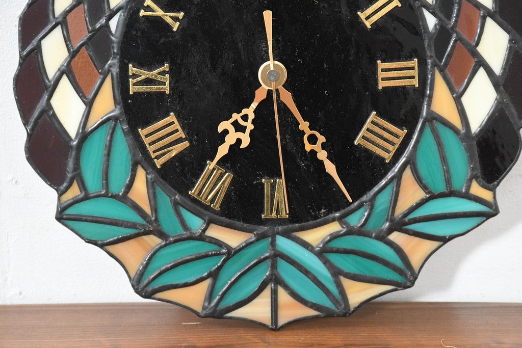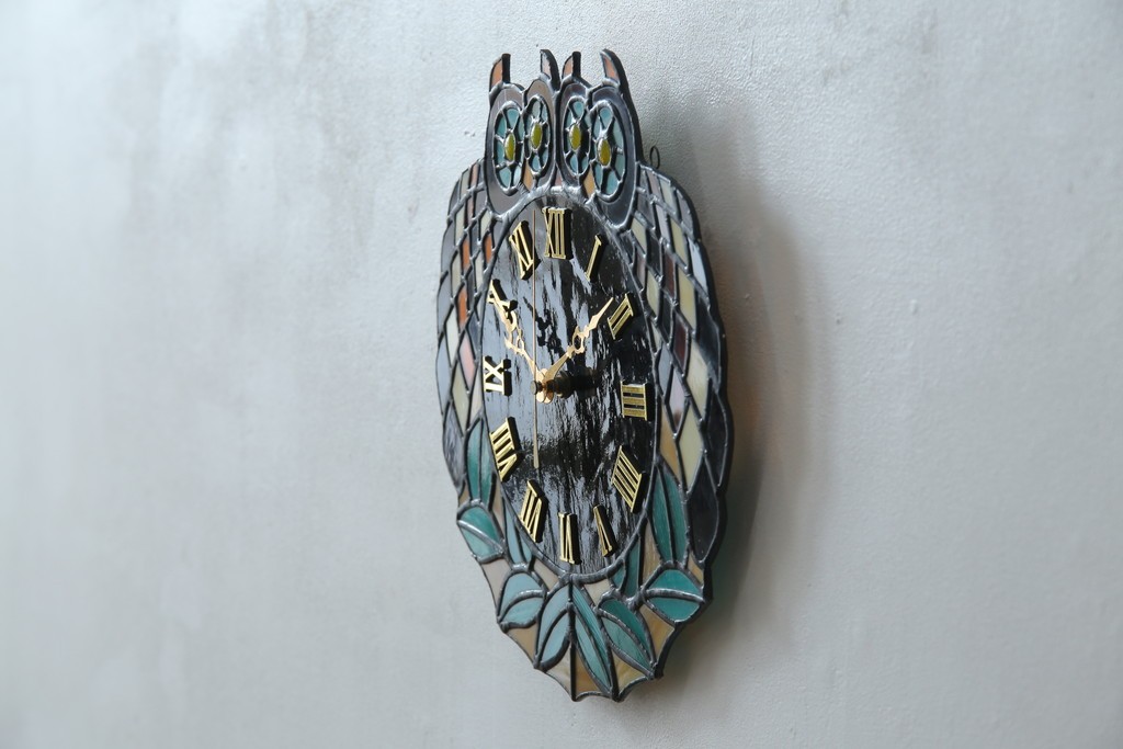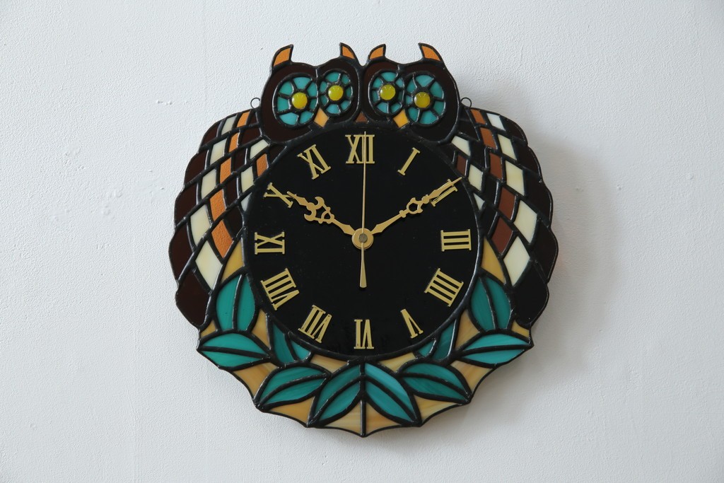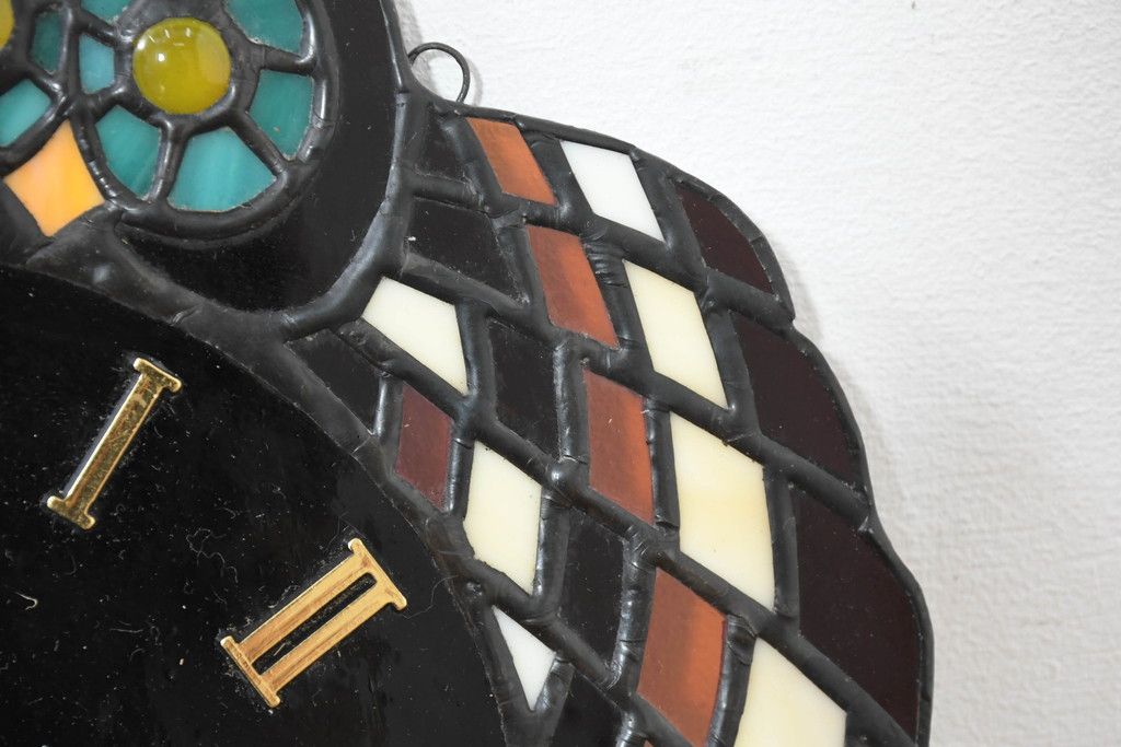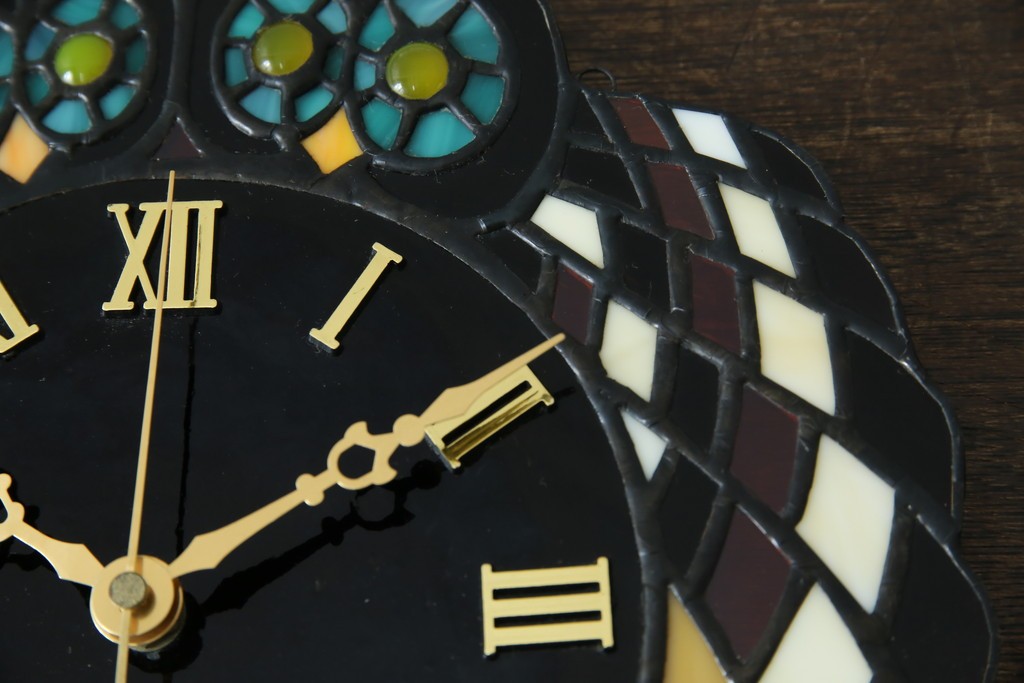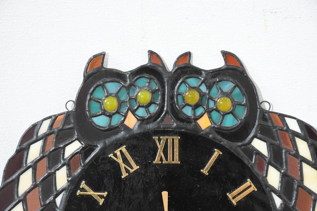 時計> 掛け時計 > 中古 希少!! 作家物!! ステンドグラス芸術家 伊藤誠二 つがいの梟(フクロウ・ふくろう) ステンドグラスの壁掛け時計(ウォールクロック)(定価約13万円)(R-084558)