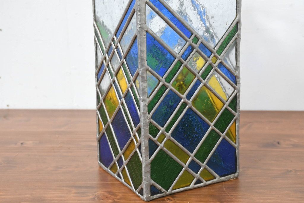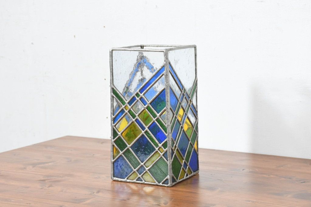 中古 希少!! 作家物!! ステンドグラス芸術家 伊藤誠二 光を通すカラフルなステンドグラスが美しいキャンドルシェード(ろうそく立て、キャンドルホルダー、造花スタンド、ガラスアート、オブジェ、飾り、置物)(定価約7万円)(R-084563)