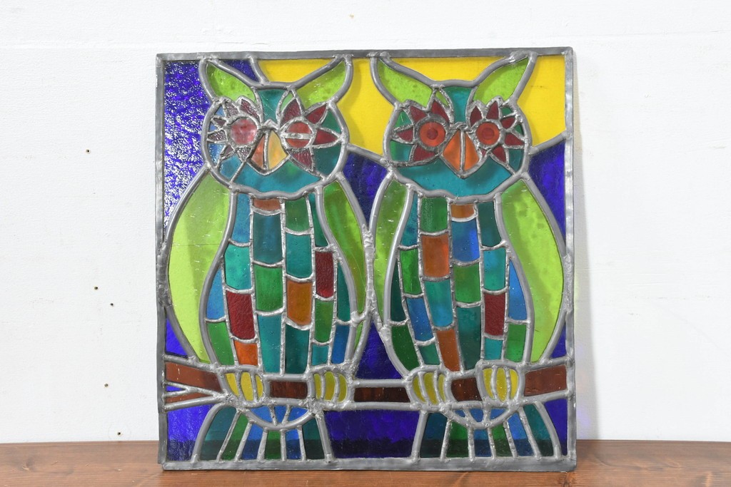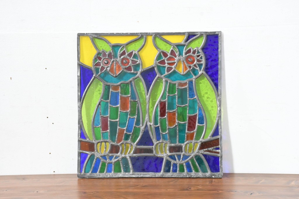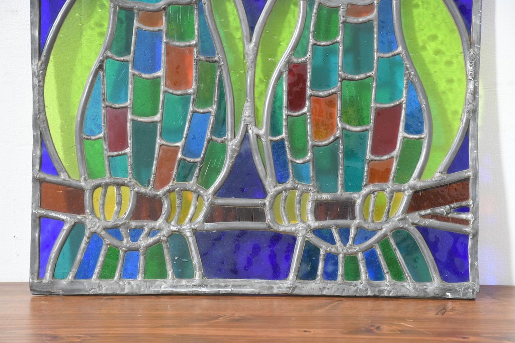 ステンドグラス > 中古 希少!! 作家物!! ステンドグラス芸術家 伊藤誠二 2羽のフクロウが描かれた色彩豊かなアートパネル 定価約15万円相当 (R-084576)