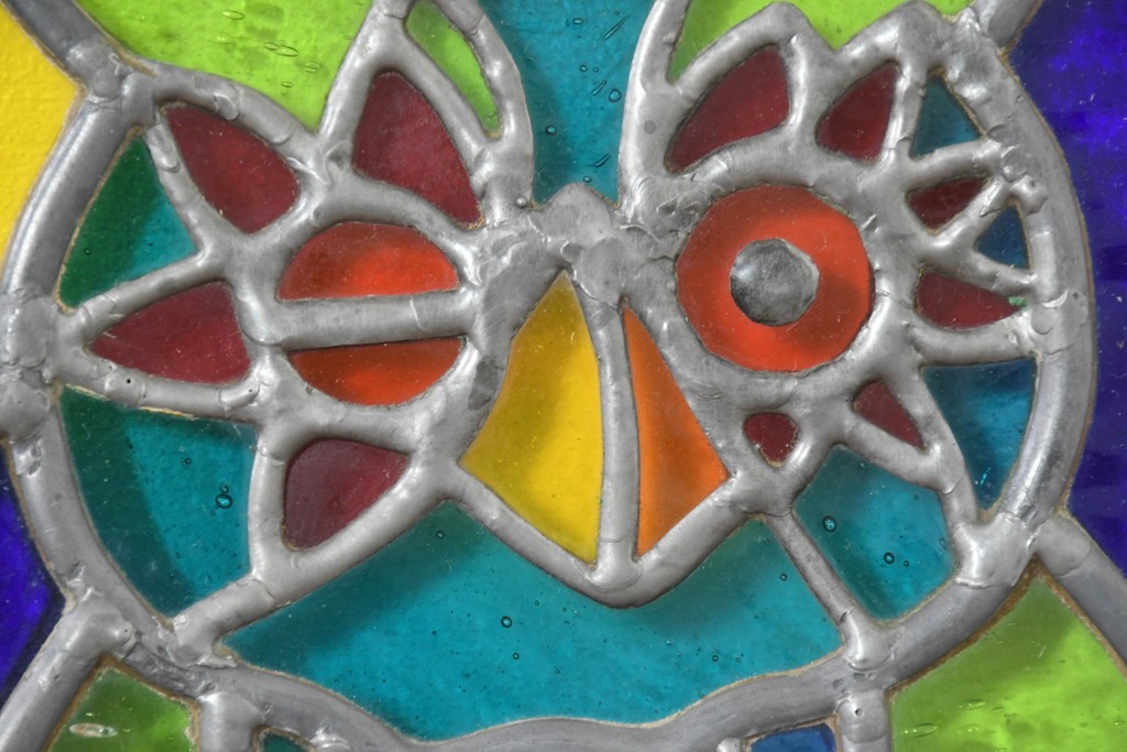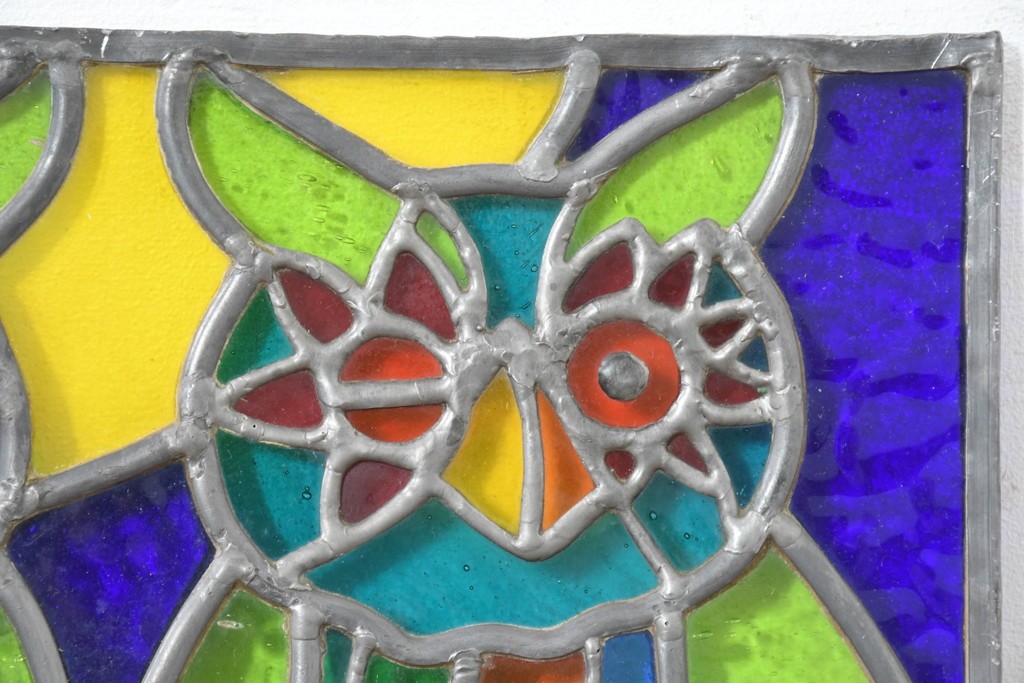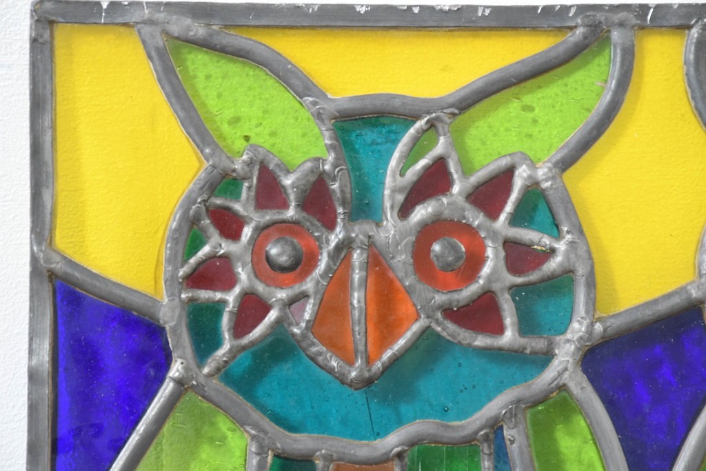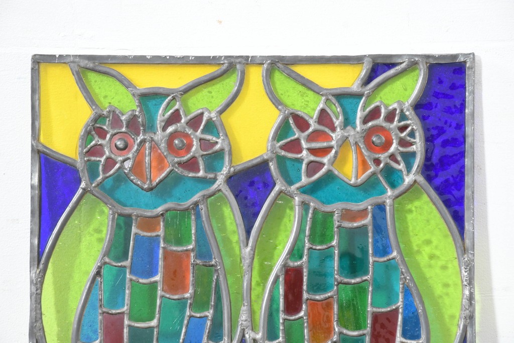鮮やかな色ガラスで、2羽のフクロウが描かれています。