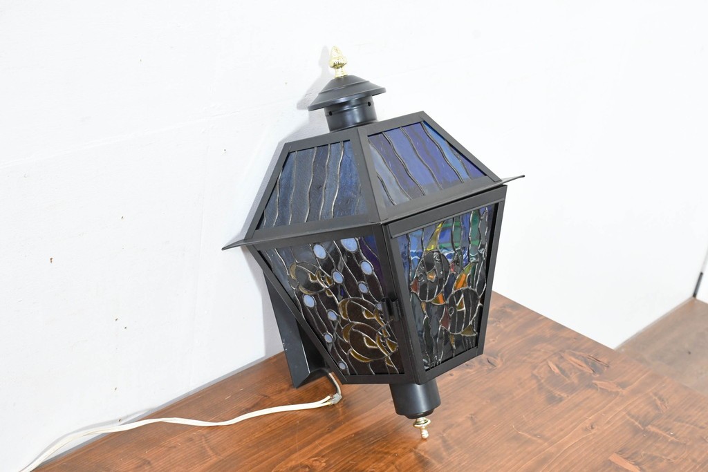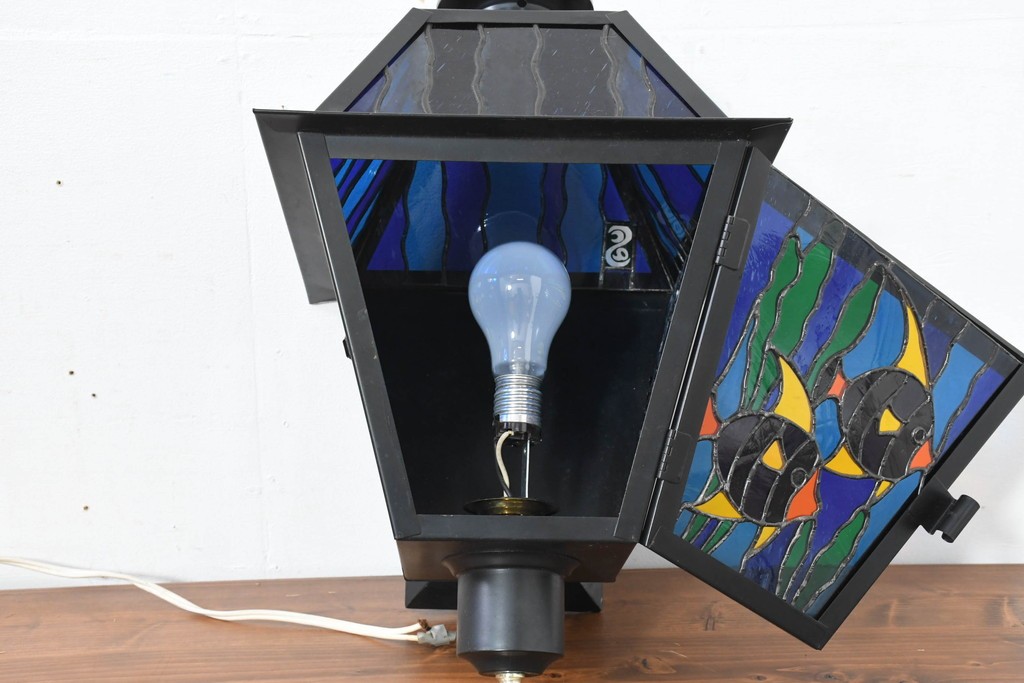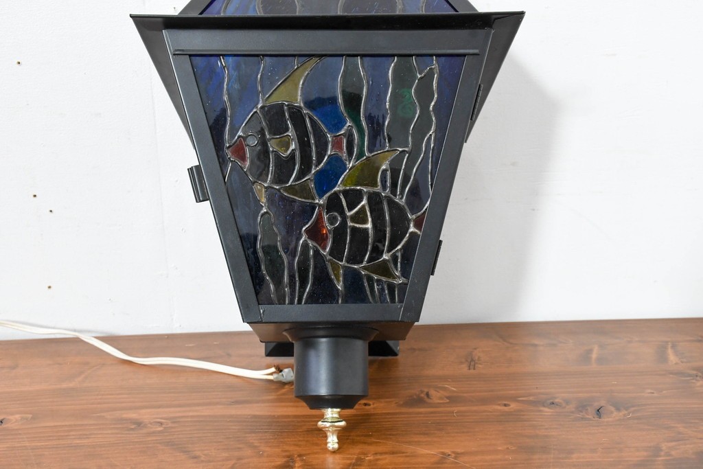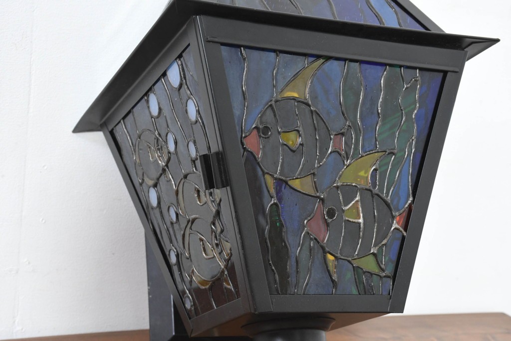 ステンドグラスには、魚や水の流れを連想させるデザインが施され、どこか自然との調和を感じさせる一品。