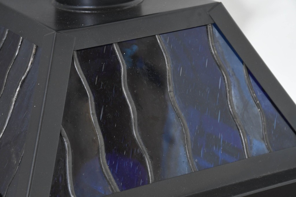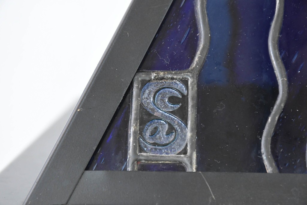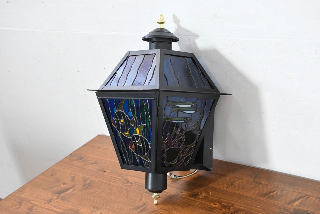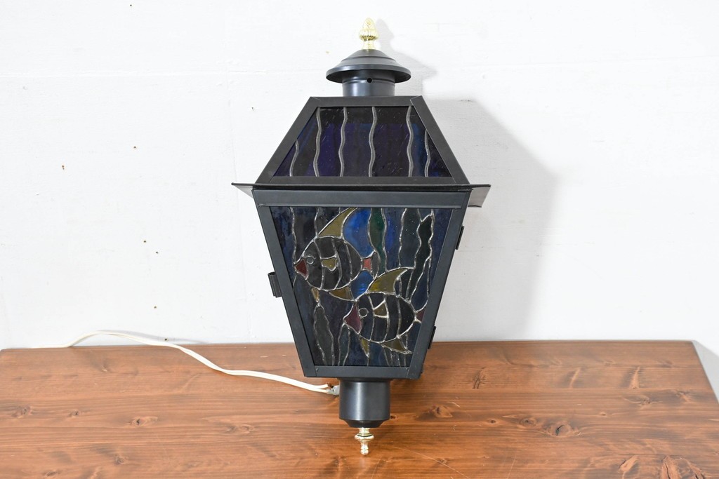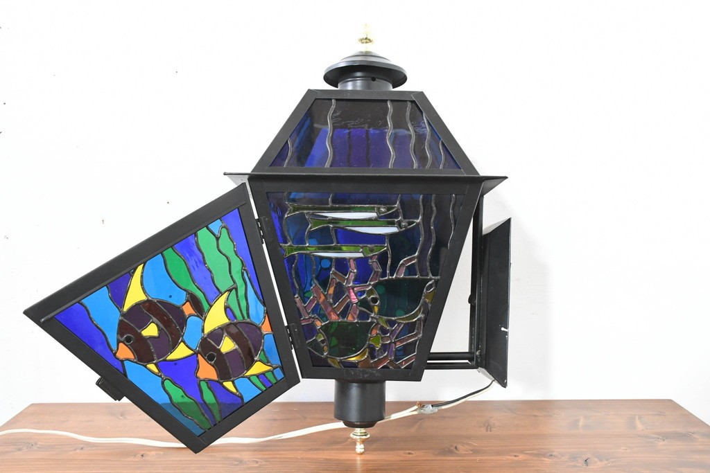 ステンドグラスには、魚や水の流れを連想させるデザインが施され、どこか自然との調和を感じさせる一品。