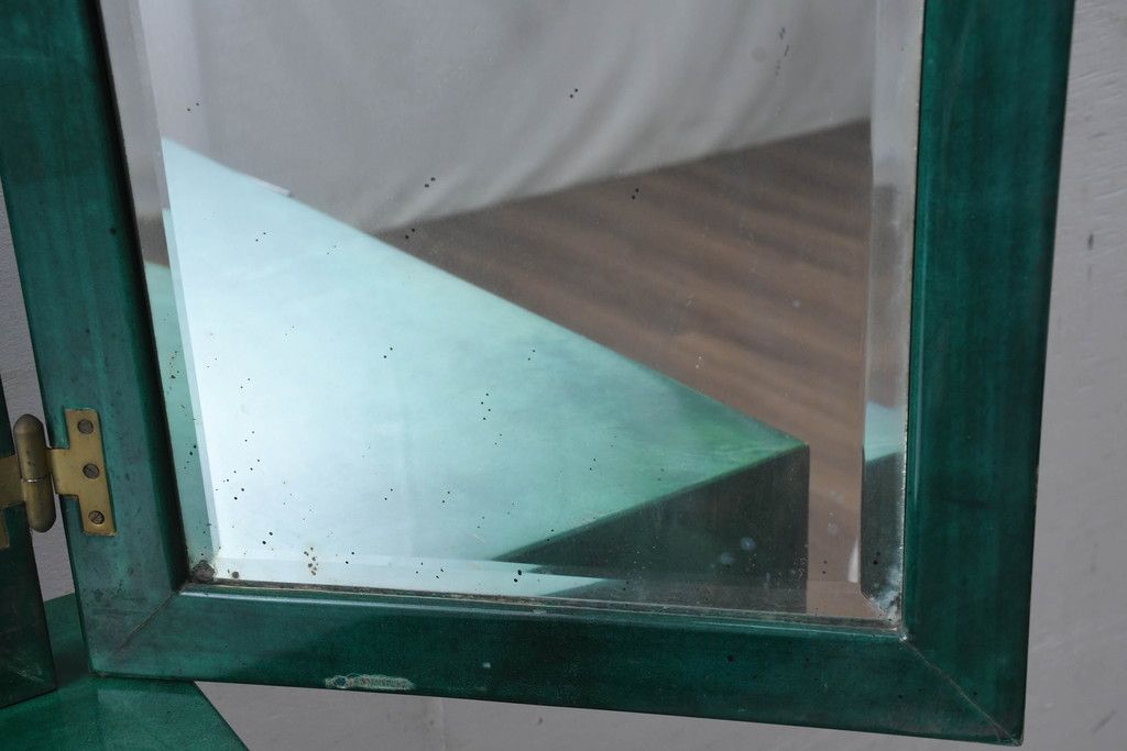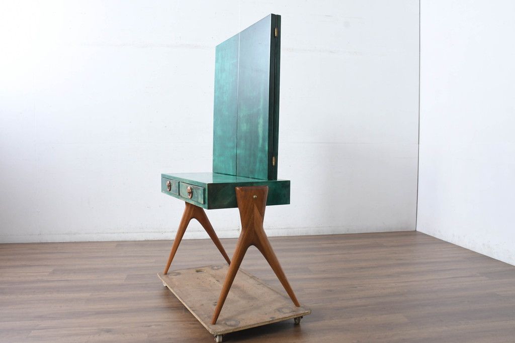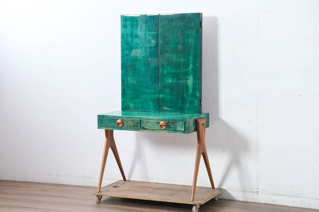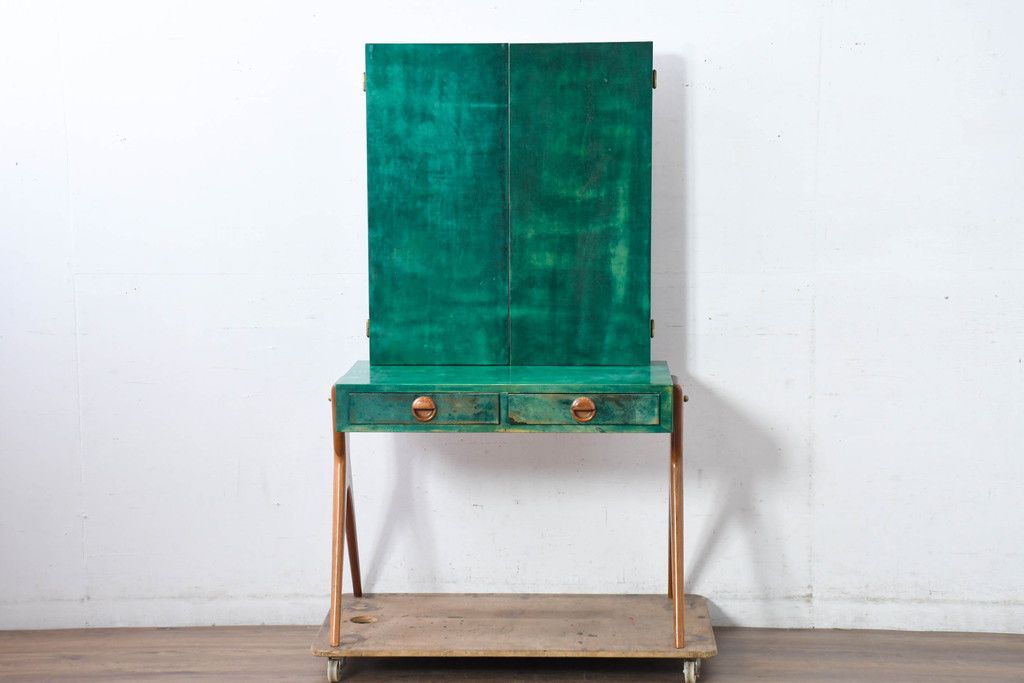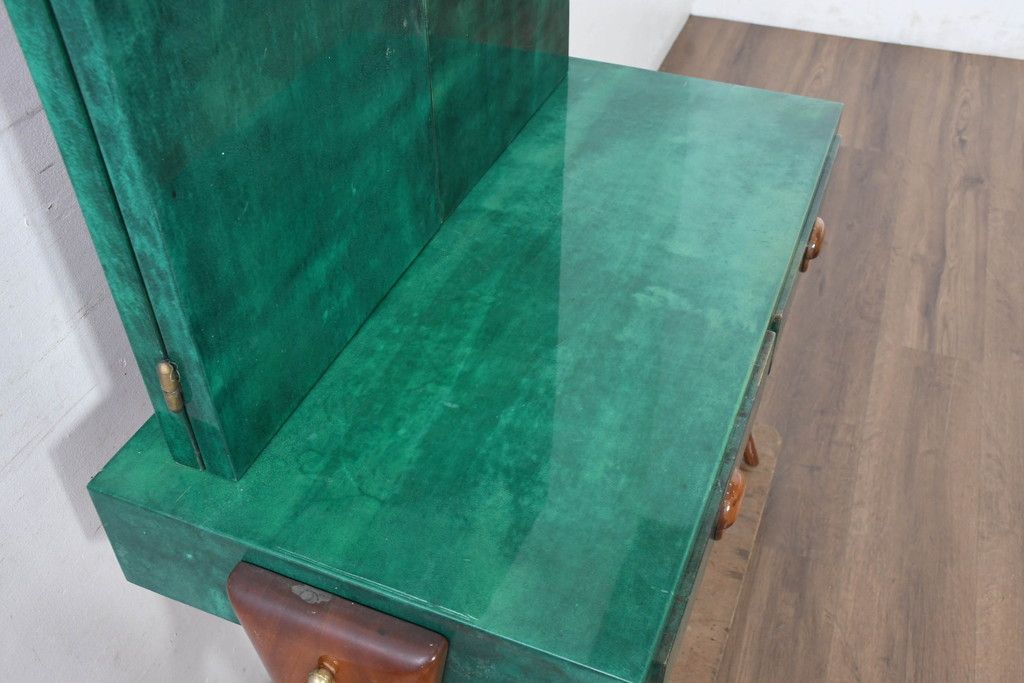 ドレッサー・鏡台> ドレッサー > イタリアビンテージ 激レア!! イタリア高級家具 アルド・トゥーラ(ALDO TURA) 仔山羊革張り シャープで美しい脚の造形美と個性が光る鮮烈なグリーンに目を奪われる三面鏡ドレッサー(化粧台、鏡台、ミラー、ヴィンテージ)(R-084592)