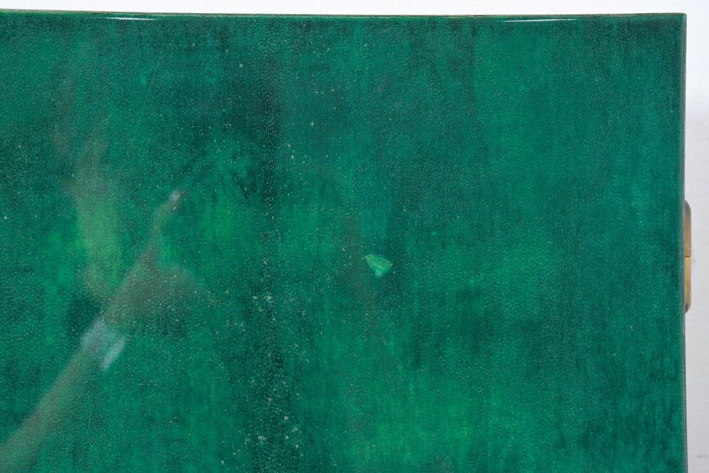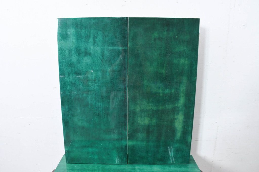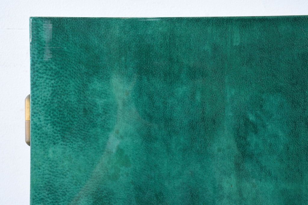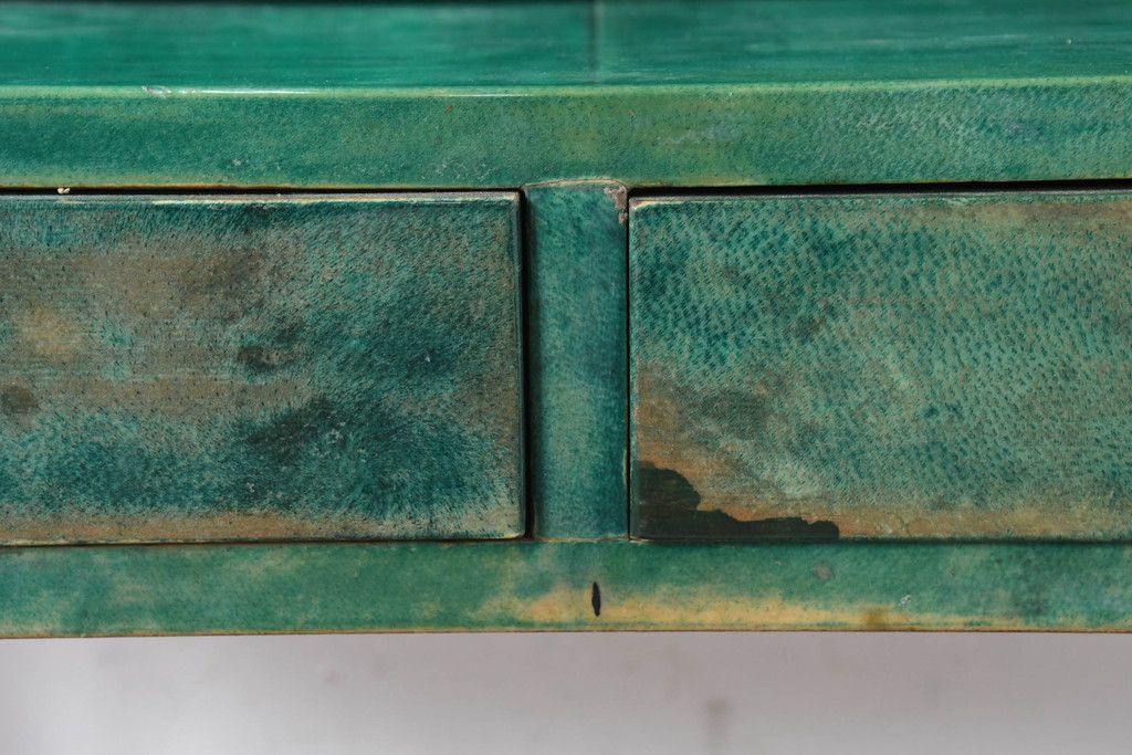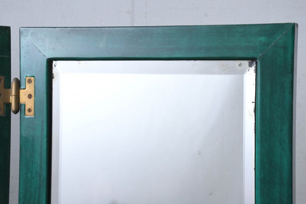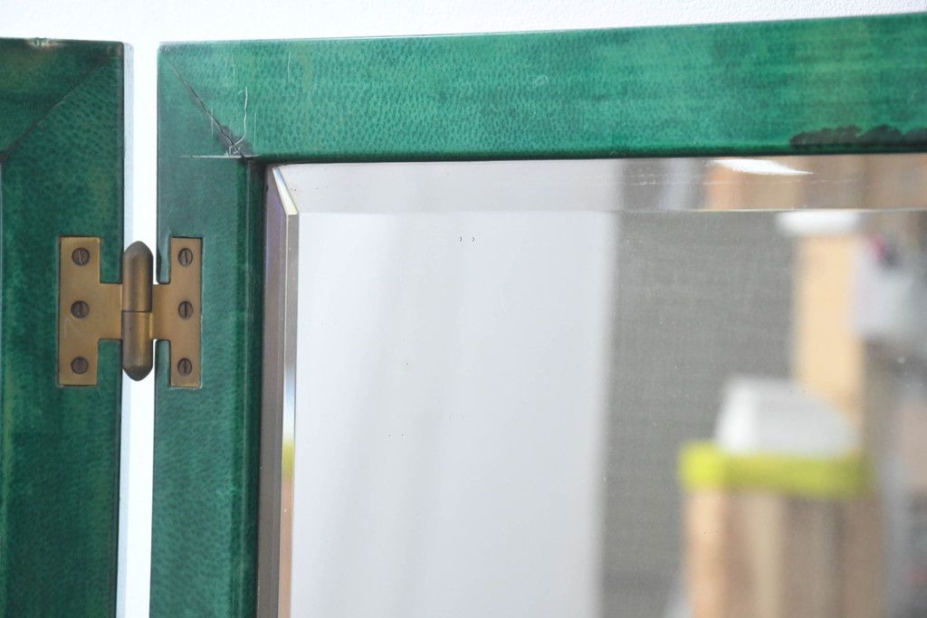 ドレッサー・鏡台> ドレッサー > イタリアビンテージ 激レア!! イタリア高級家具 アルド・トゥーラ(ALDO TURA) 仔山羊革張り シャープで美しい脚の造形美と個性が光る鮮烈なグリーンに目を奪われる三面鏡ドレッサー(化粧台、鏡台、ミラー、ヴィンテージ)(R-084592)