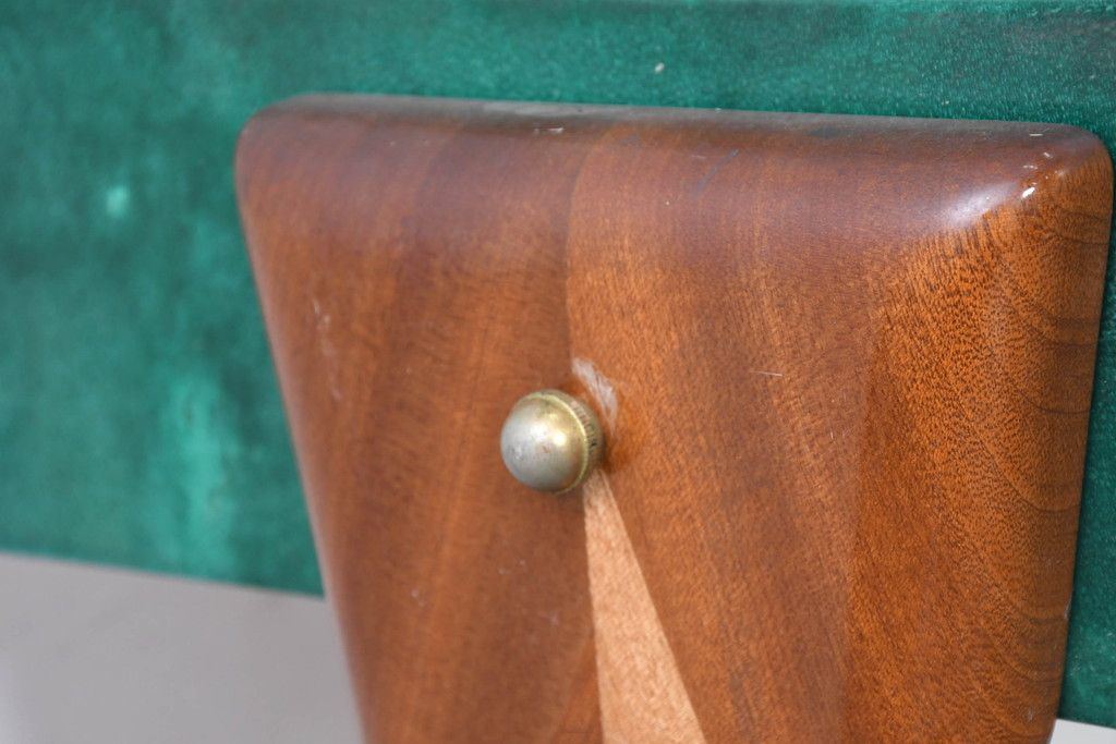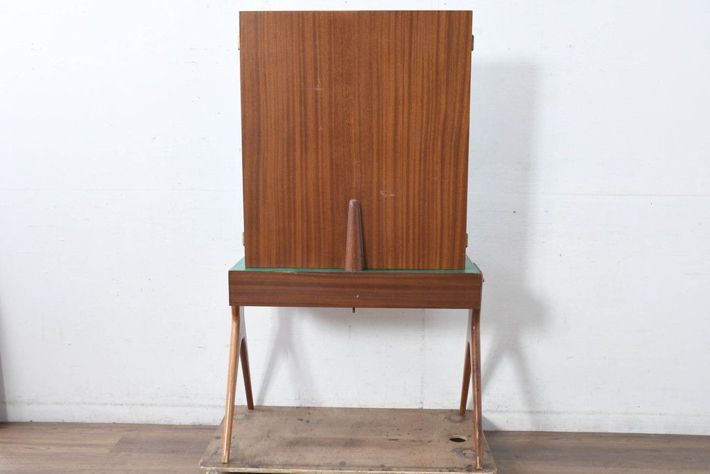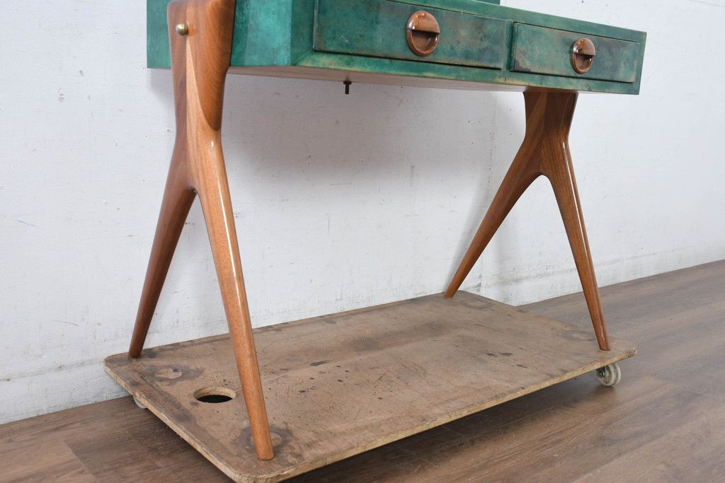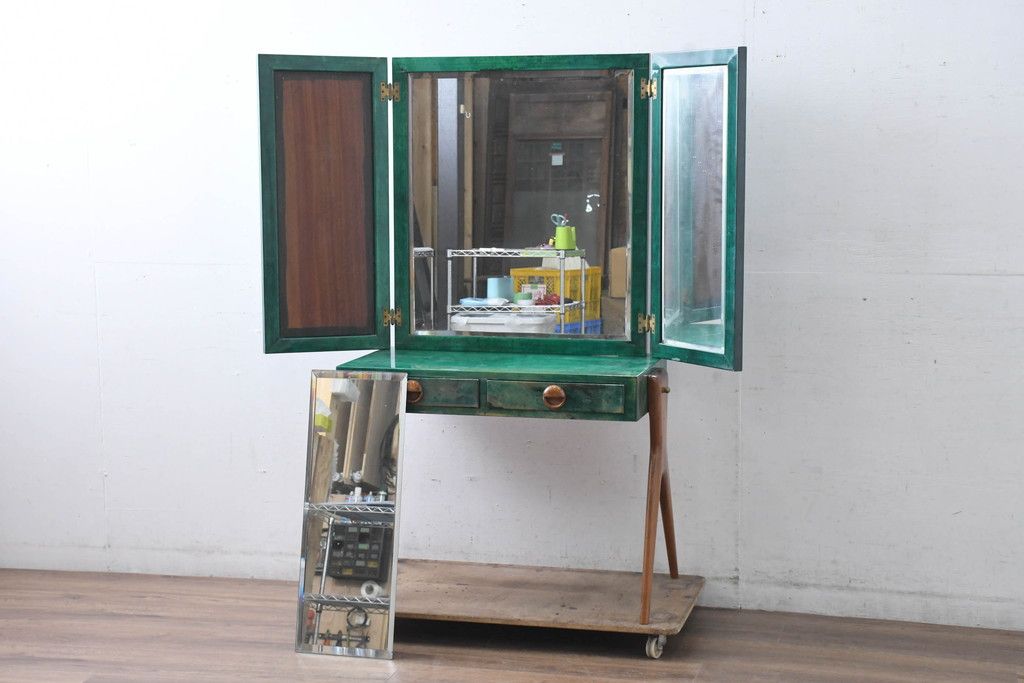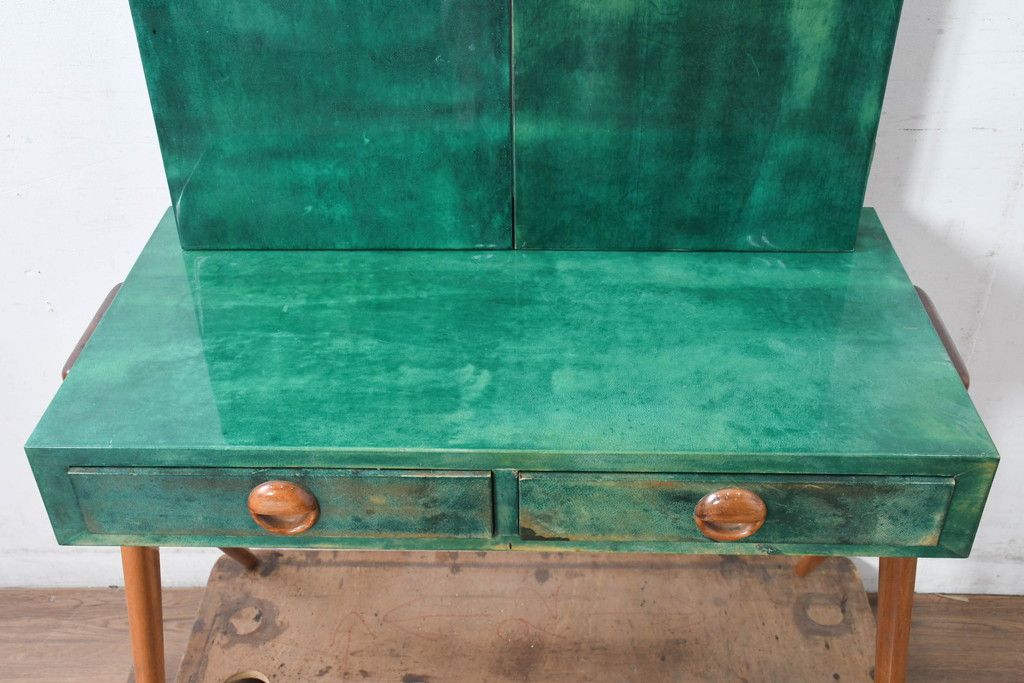 イタリアビンテージ 激レア!! イタリア高級家具 アルド・トゥーラ(ALDO TURA) 仔山羊革張り シャープで美しい脚の造形美と個性が光る鮮烈なグリーンに目を奪われる三面鏡ドレッサー(化粧台、鏡台、ミラー、ヴィンテージ)(R-084592)
