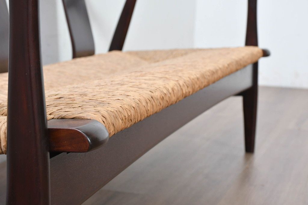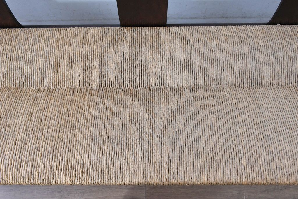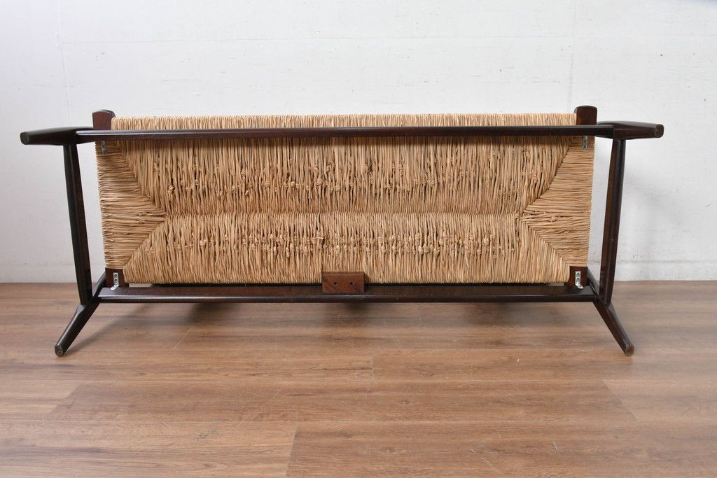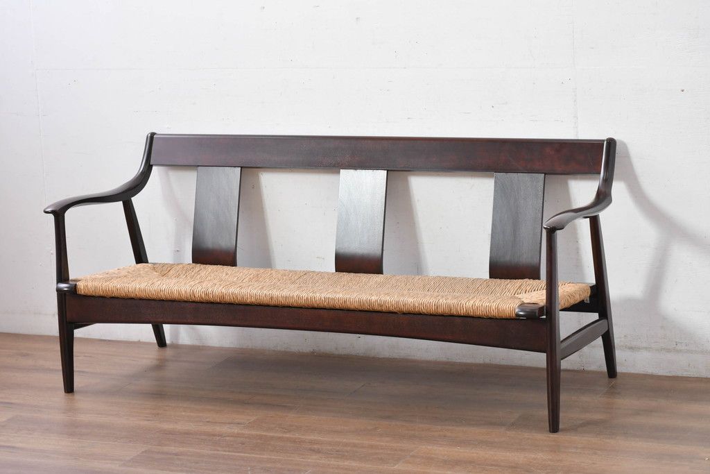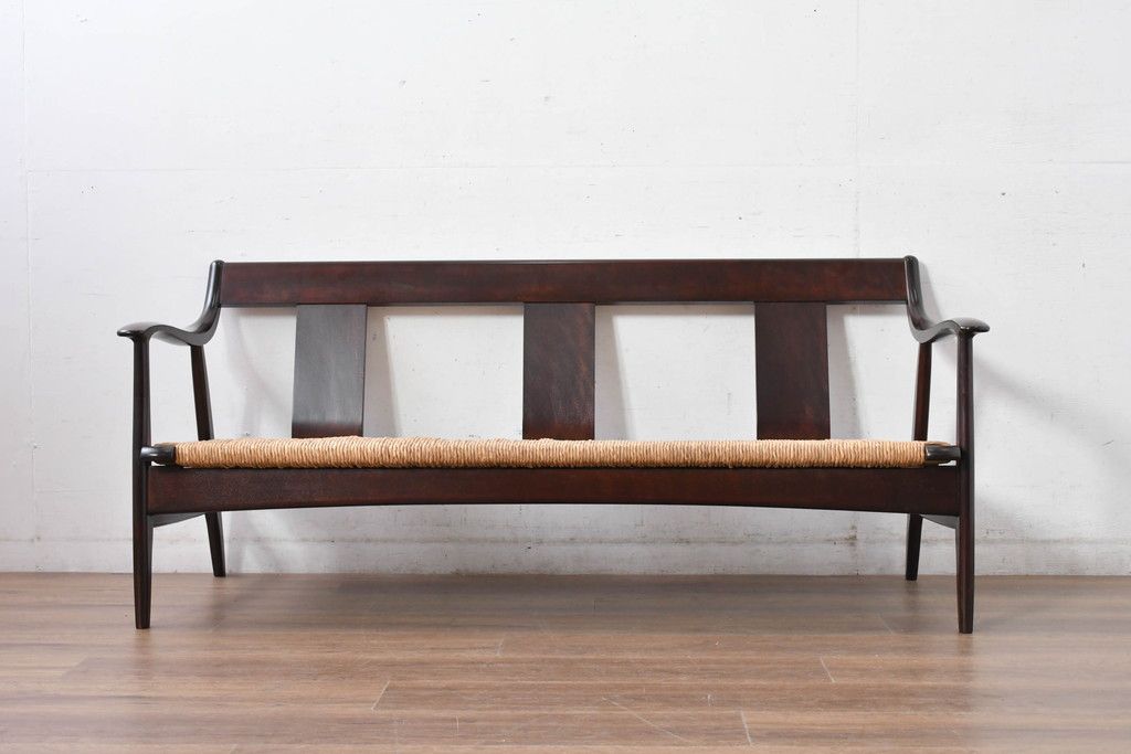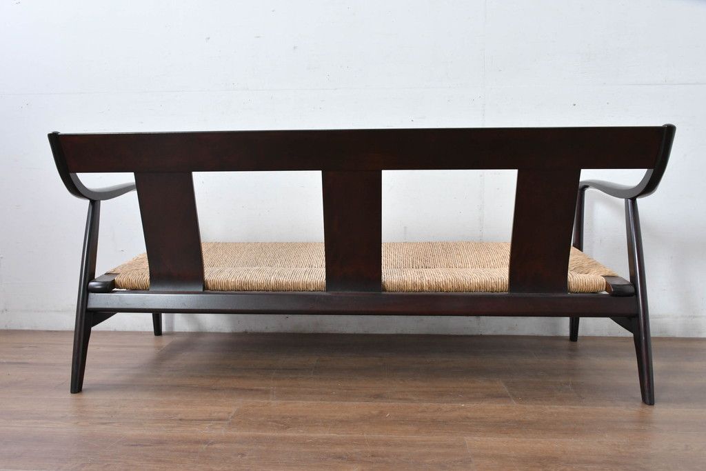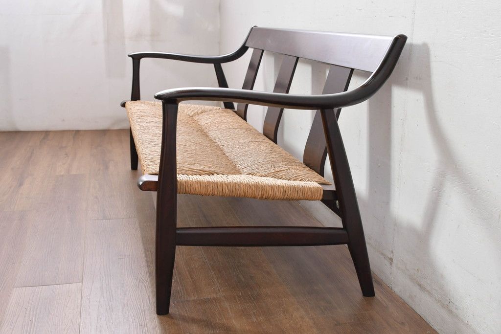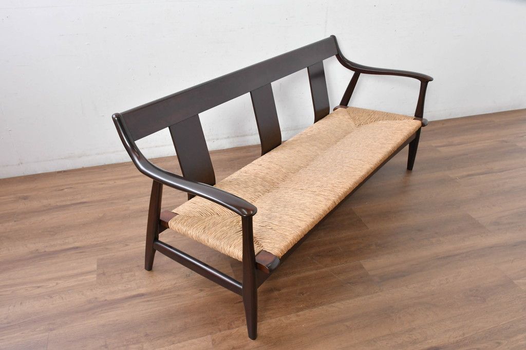 椅子・ベンチ> ベンチ > 中古 松本民芸家具 #77型 ラッシ座(ガマ座) 和モダンな雰囲気を醸し出す3人掛け曲肘イス(定価約45万円)(アームベンチ、ラッシチェア、3P、三人掛け、椅子、ソファ)(R-084672)