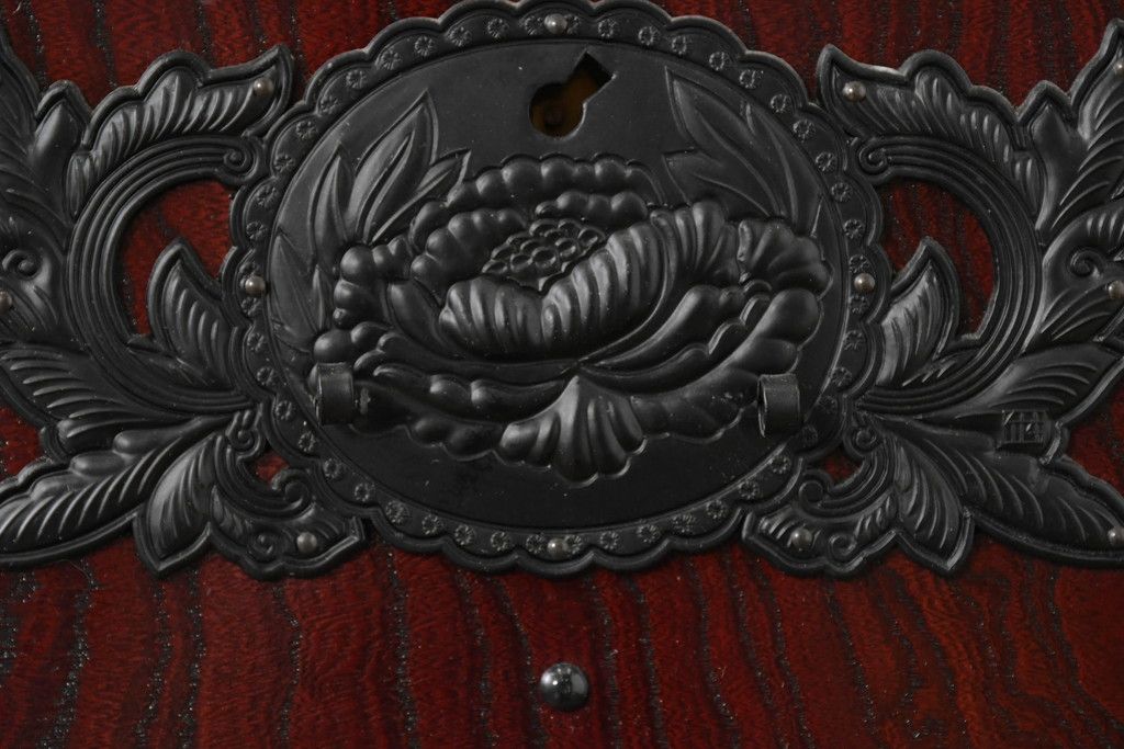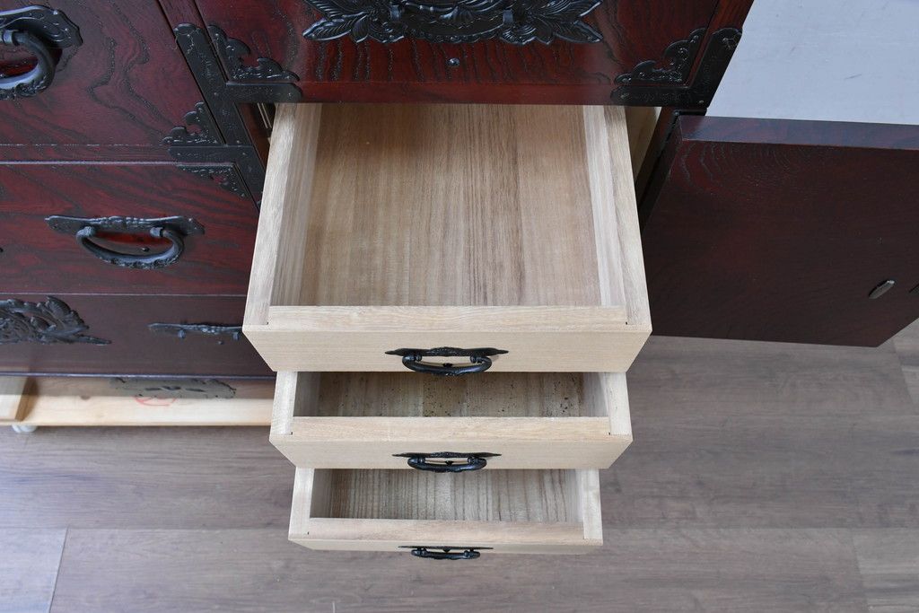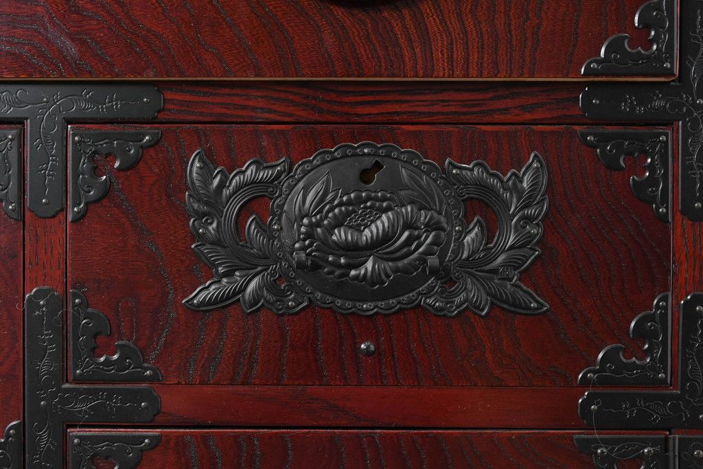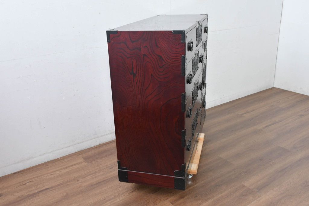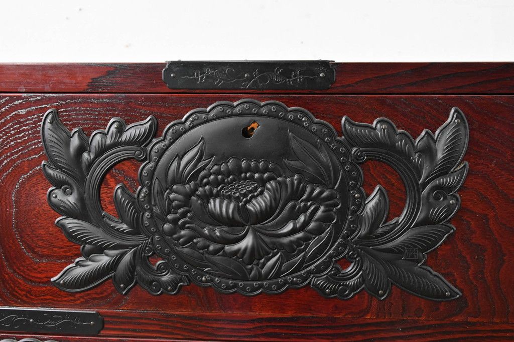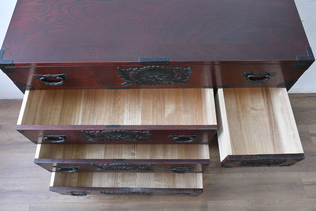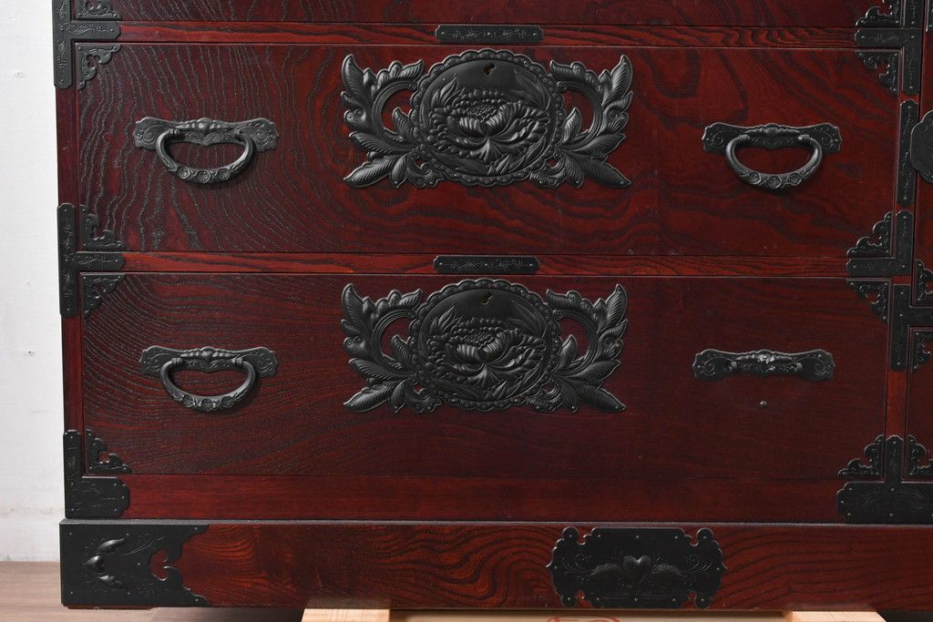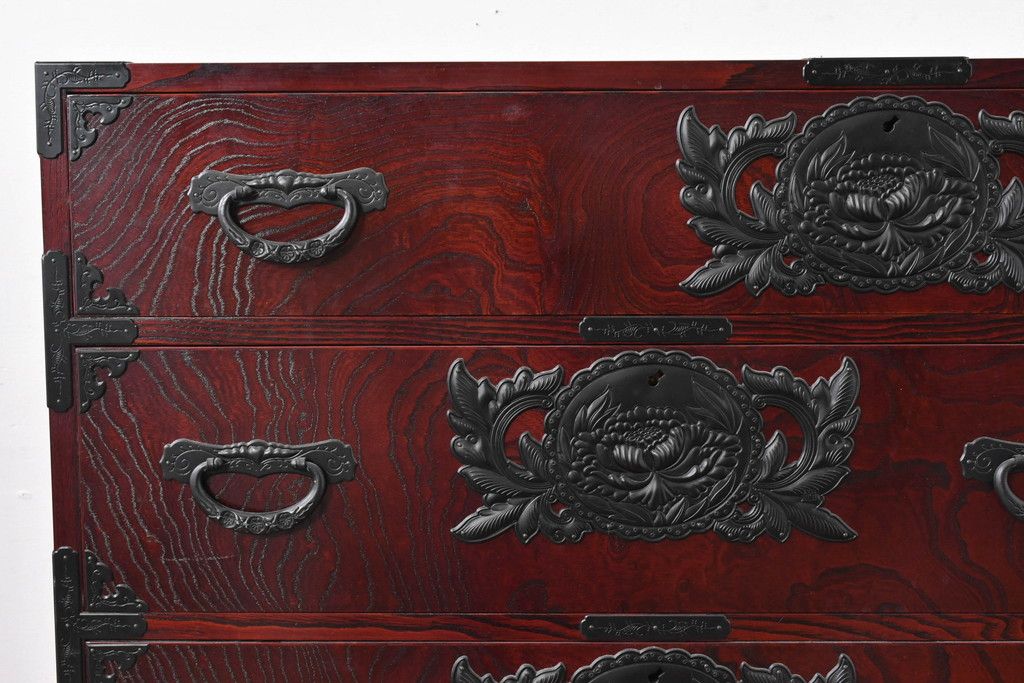 和箪笥> 衣装箪笥 > 中古 美品 仙台民芸箪笥 欅産業 漆塗り 立派な杢目と牡丹があしらわれた装飾金具が美しい仙台箪笥 定価約60万円相当 (R-084679)