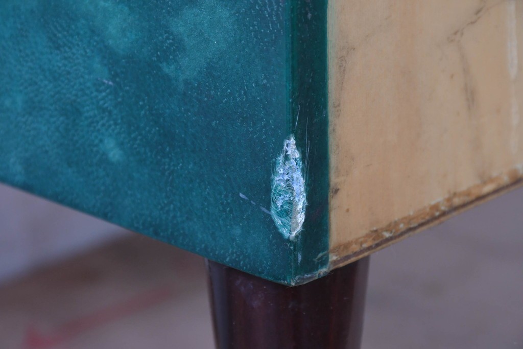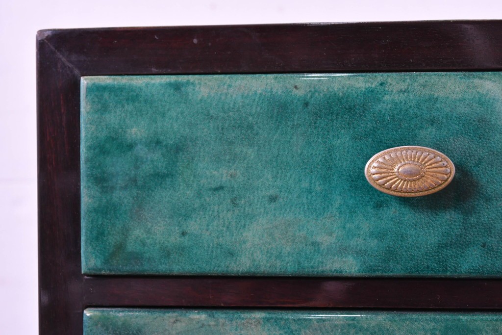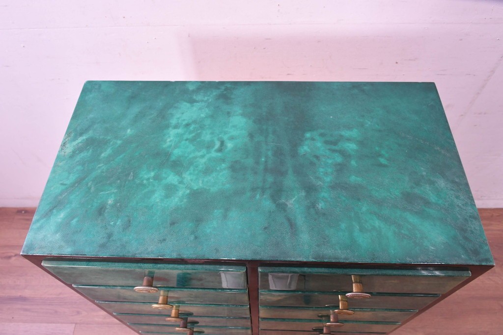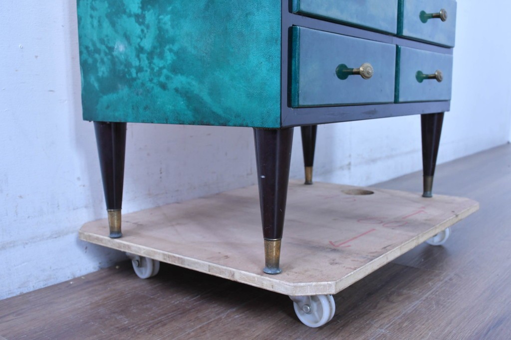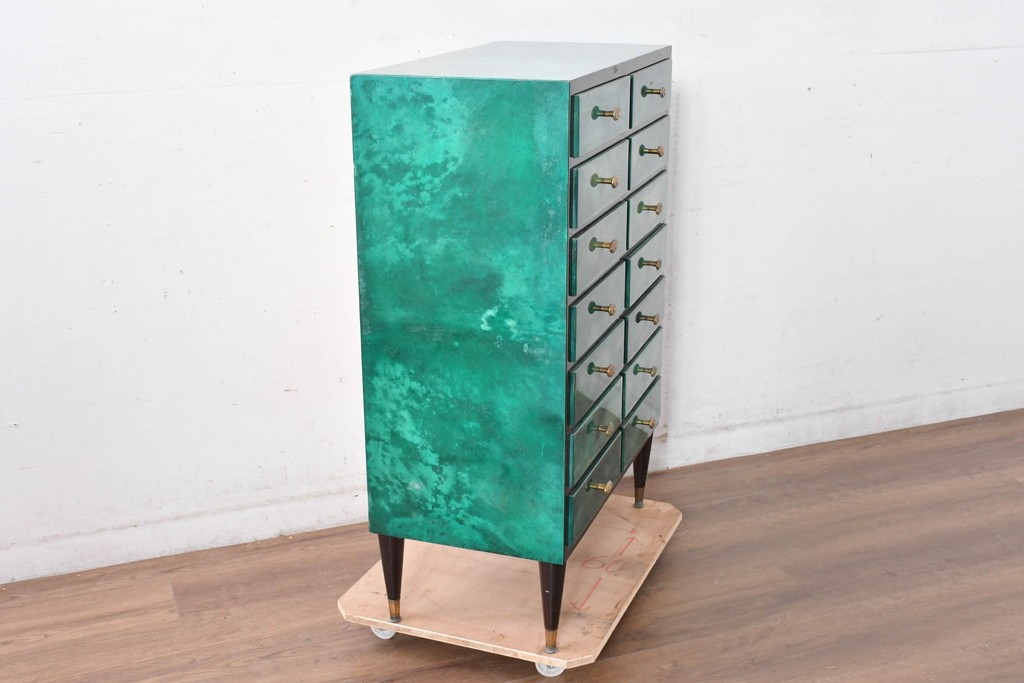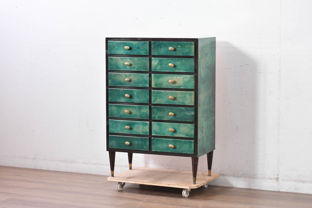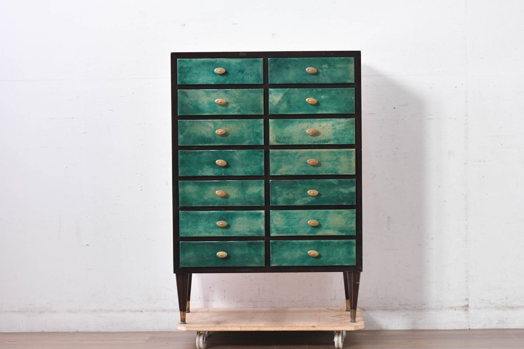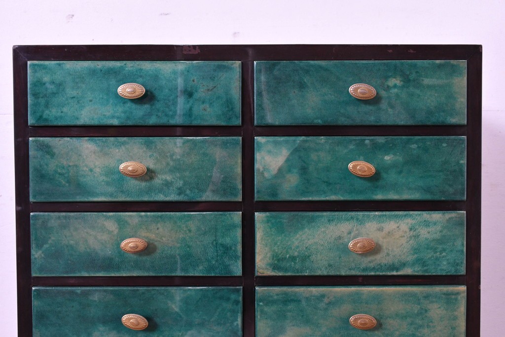 ラフジュ工房> チェスト・引き出し > イタリアビンテージ 高級家具 希少モデル!! アルド・トゥーラ(ALDO TURA) 仔山羊革張り 引き出し14杯 グリーンカラーが印象的なサイドチェスト (R-084689)