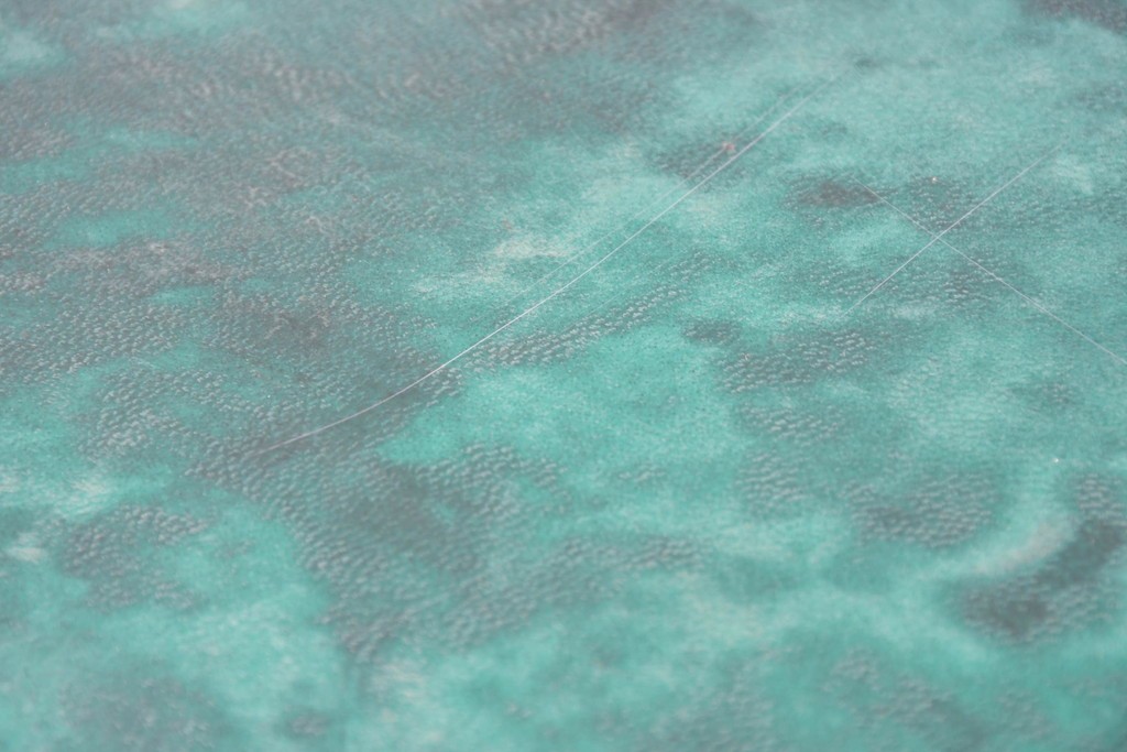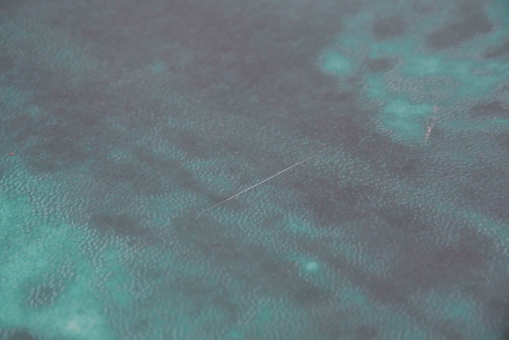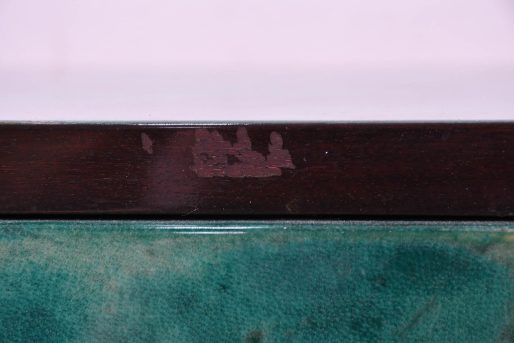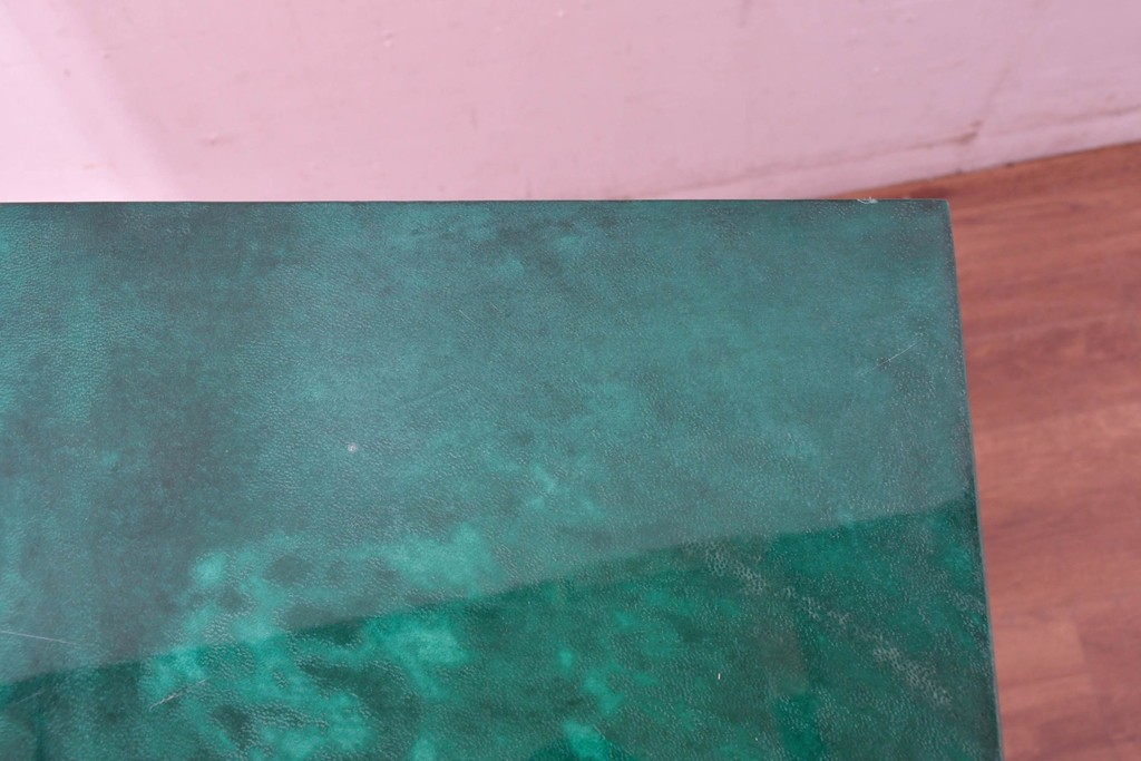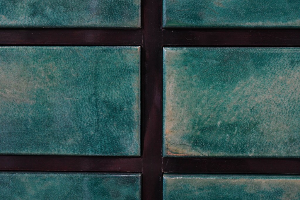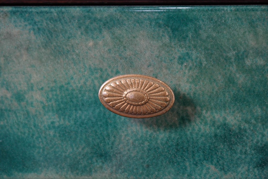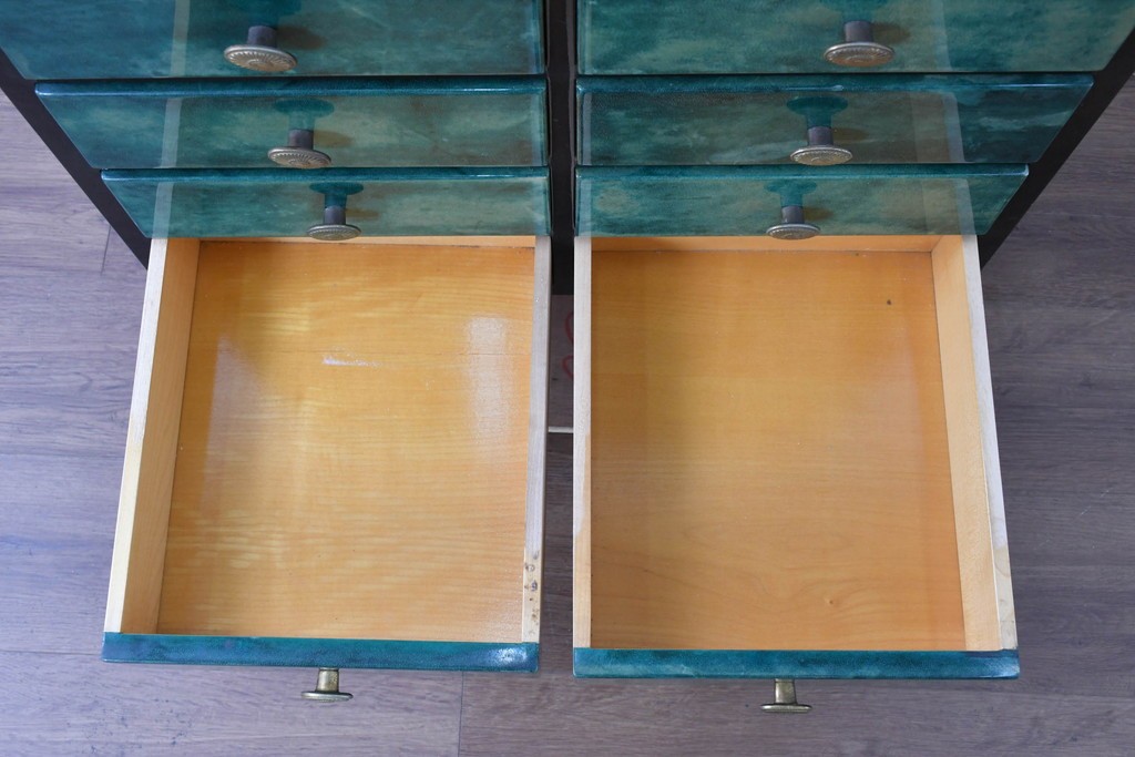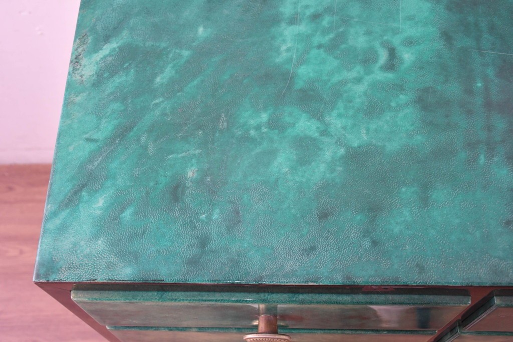 ラフジュ工房> チェスト・引き出し> サイドチェスト > イタリアビンテージ 高級家具 希少モデル!! アルド・トゥーラ(ALDO TURA) 仔山羊革張り 引き出し14杯 グリーンカラーが印象的なサイドチェスト (R-084689)