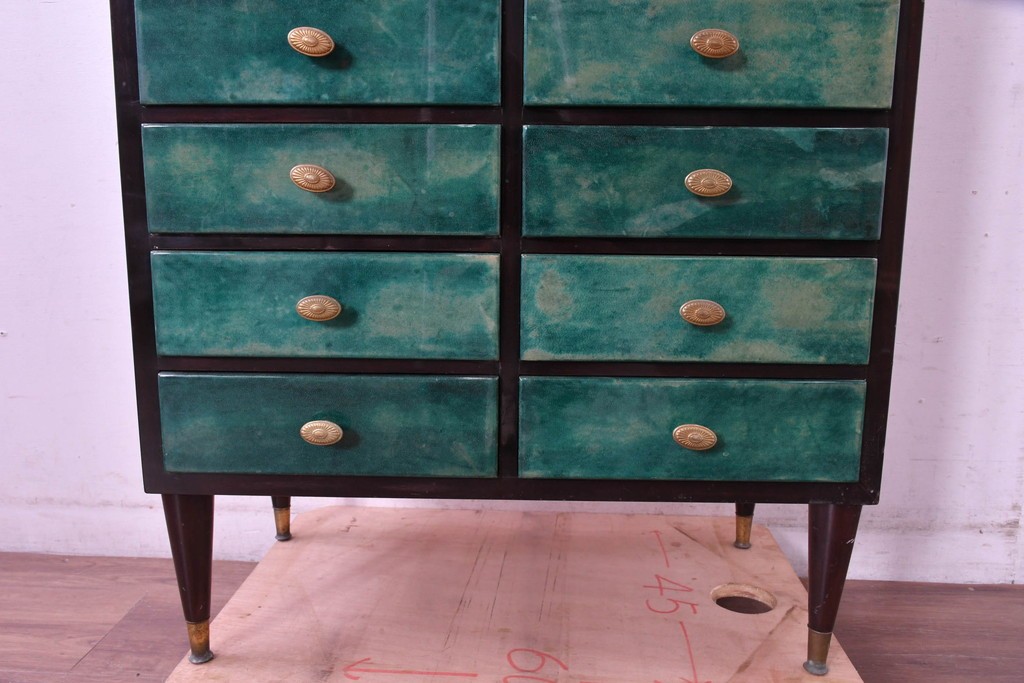 イタリアビンテージ 高級家具 希少モデル!! アルド・トゥーラ(ALDO TURA) 仔山羊革張り 引き出し14杯 グリーンカラーが印象的なサイドチェスト (R-084689)