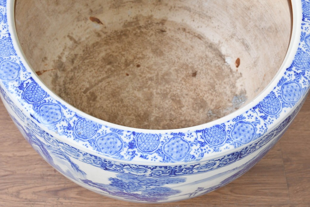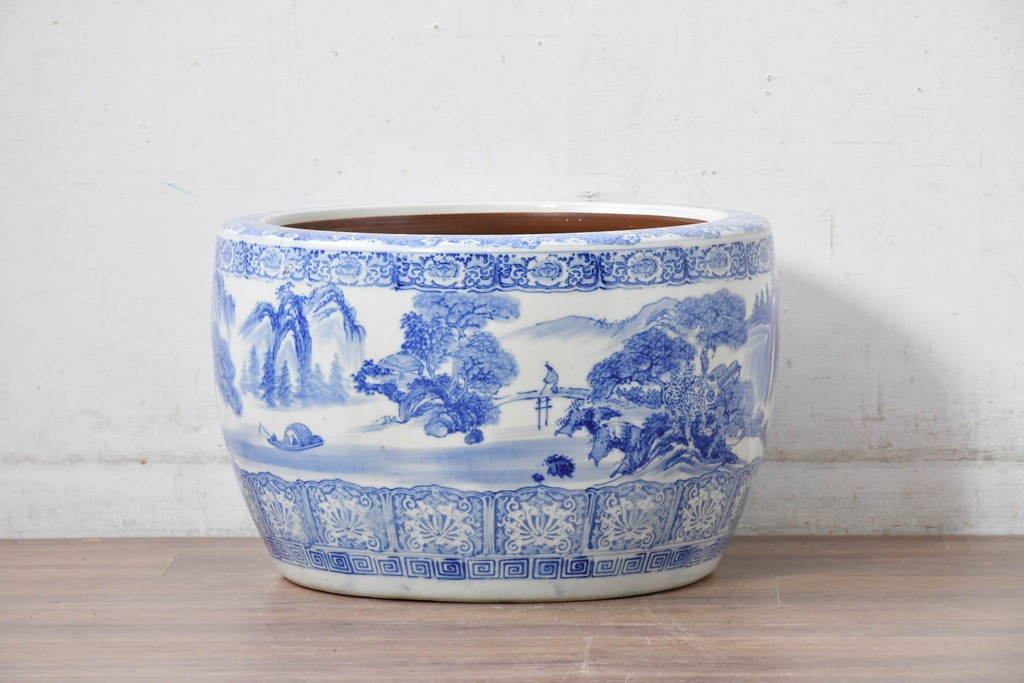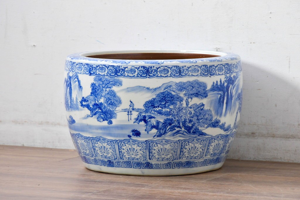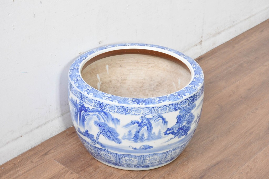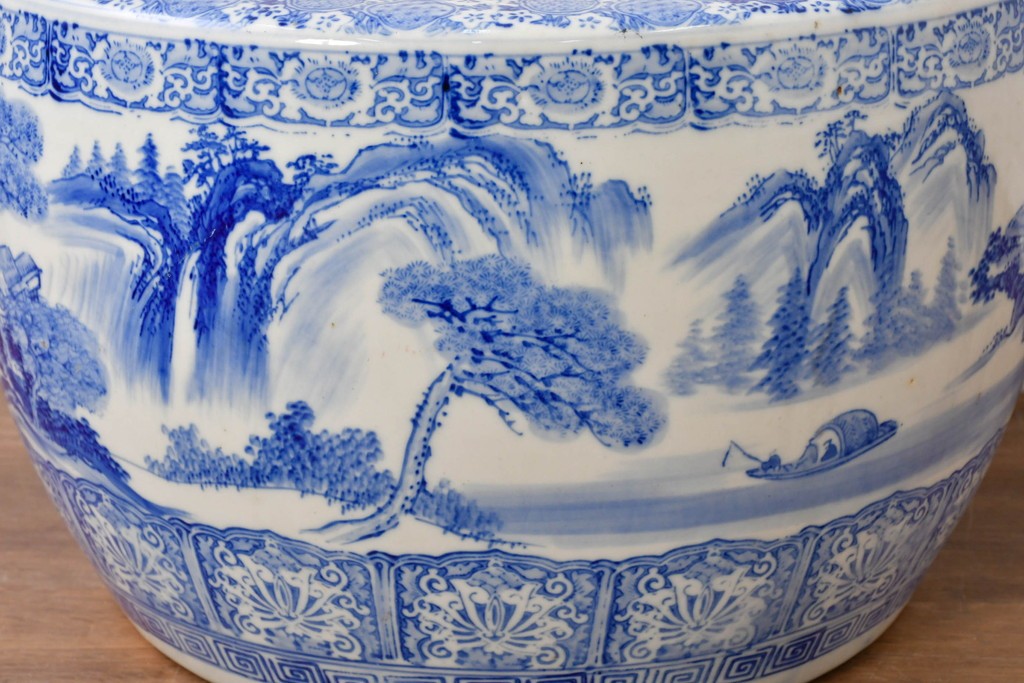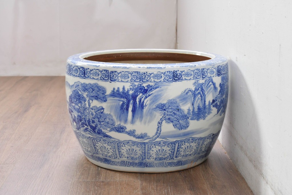 • 和製ヴィンテージ 山水の図 藍色の濃淡で表現された図が魅力的な瀬戸火鉢 (R-084731)