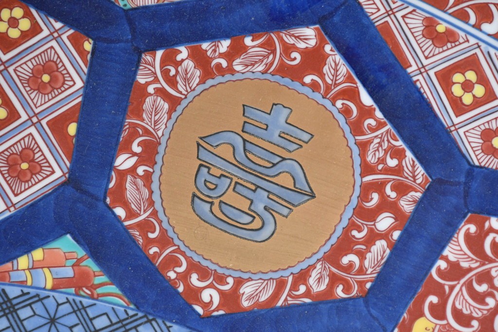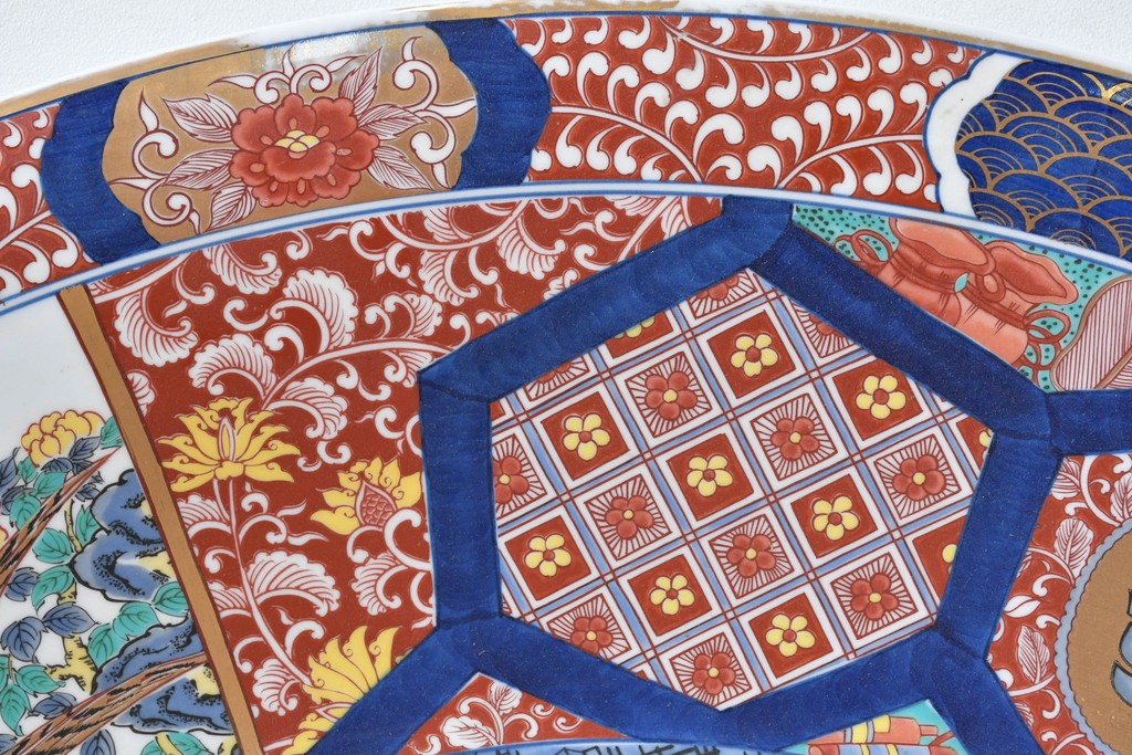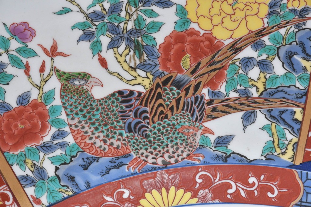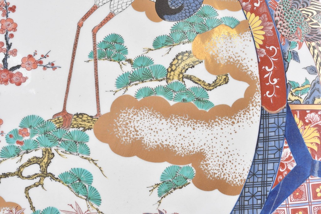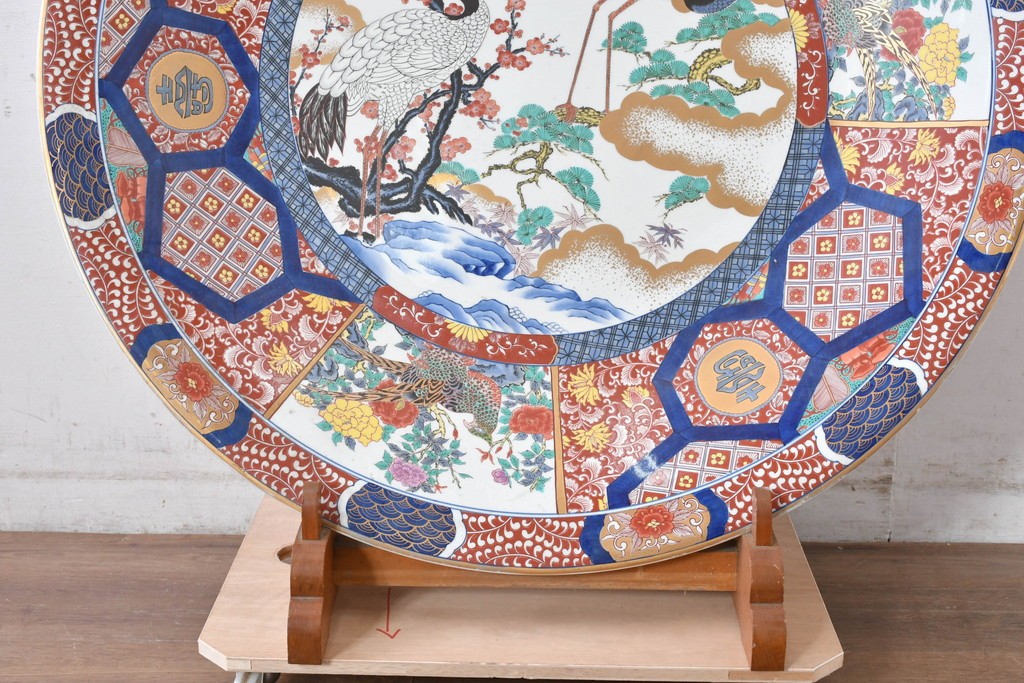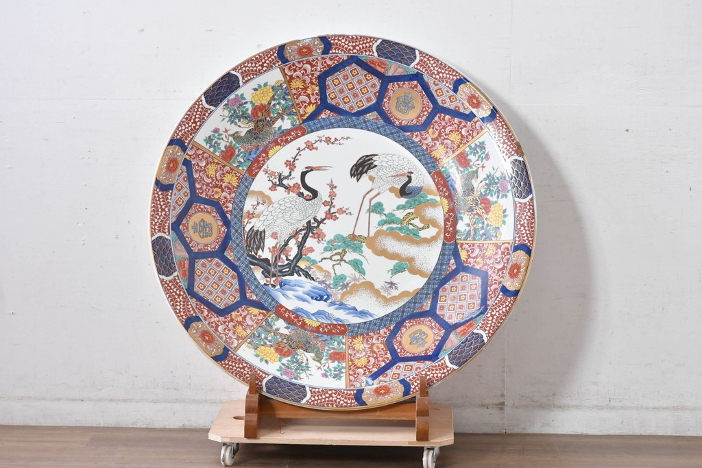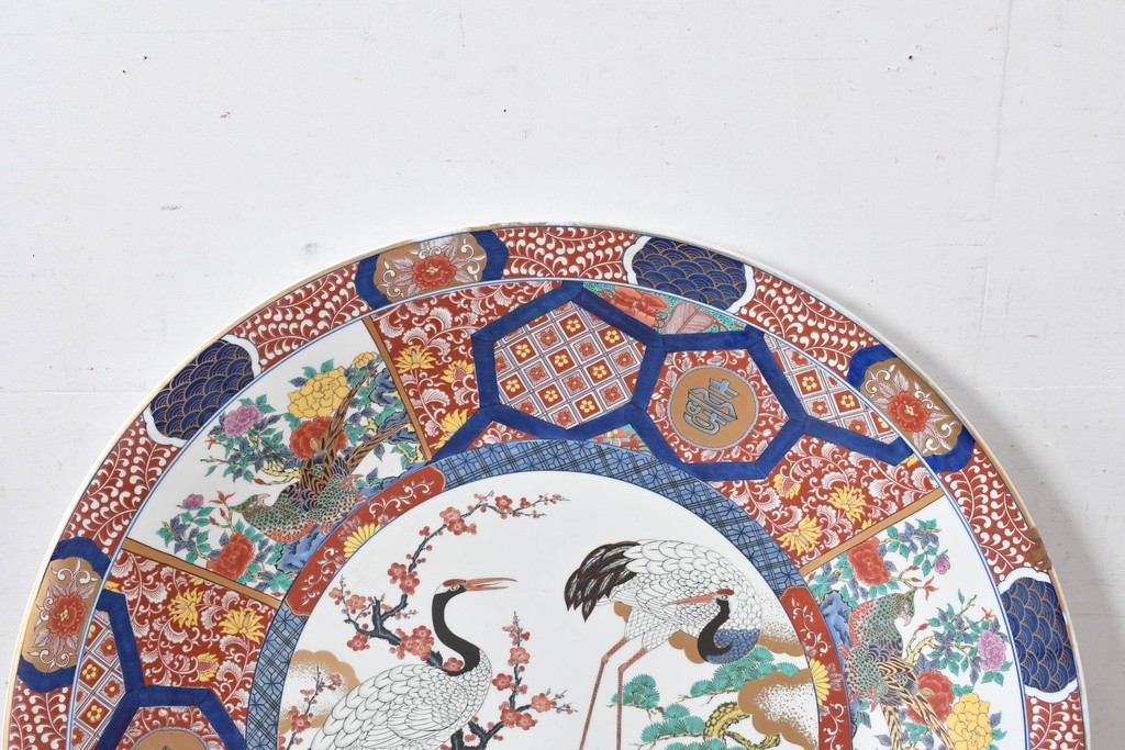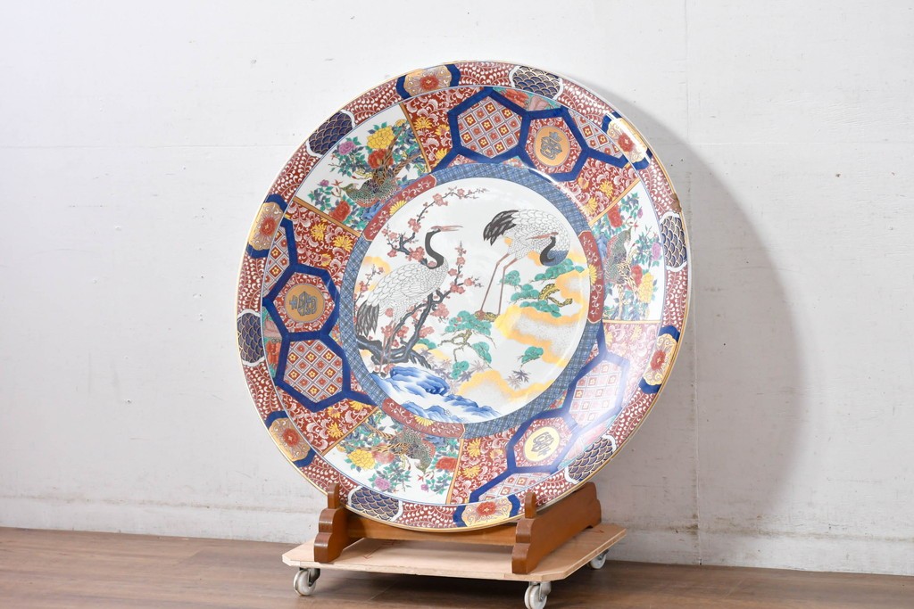 鮮やかな赤絵や金彩の装飾が随所に施され、中央の鶴図と周囲の花鳥文様が調和した気品ある仕上がりです。