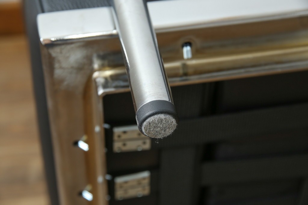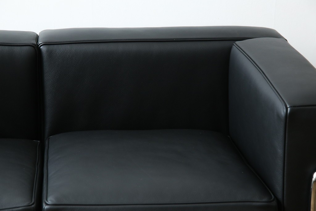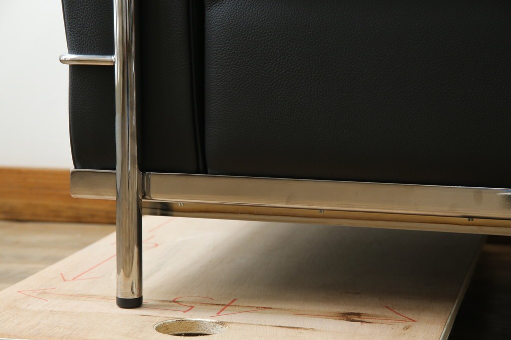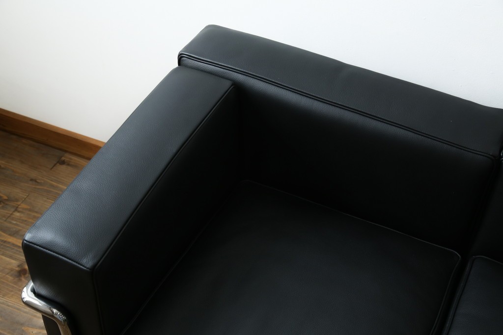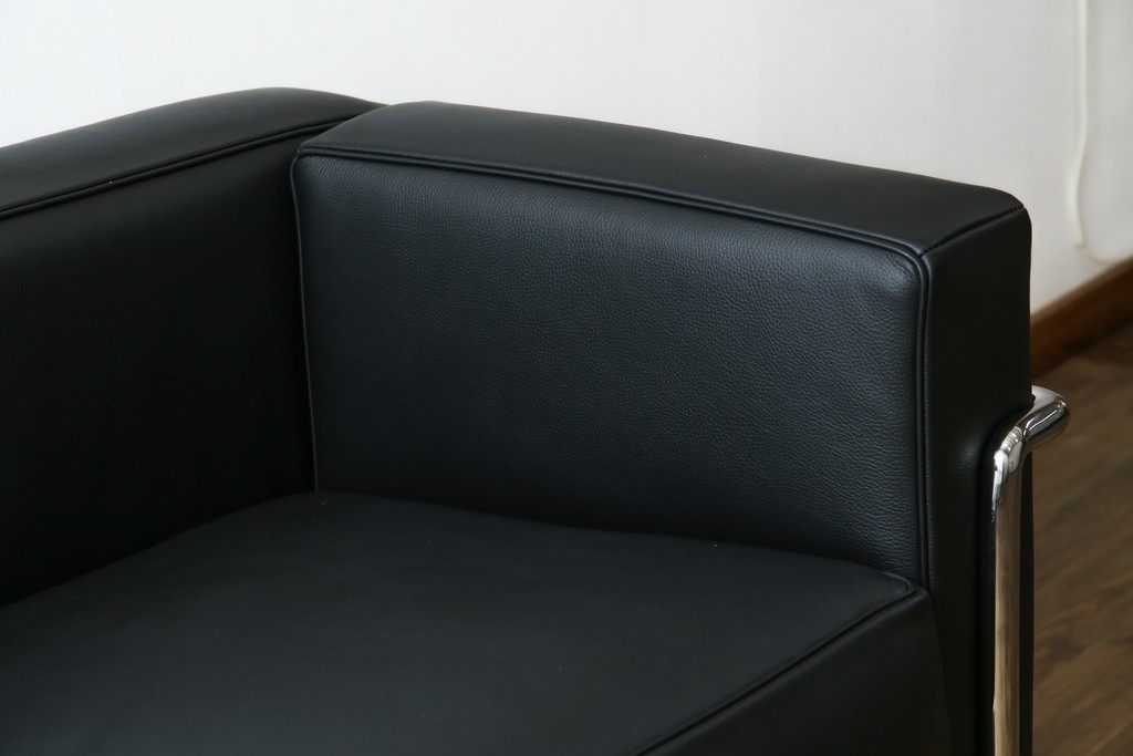 ル・コルビュジエが手掛けた「グランコンフォール」の魅力を体現する、外周を縁取るスチールフレームが目を引きます。金属の光沢がレザー部分の質感を引き立て、建築的な美しさがそのまま家具として息づいています。直線を基調とした造形は空間を整えるような存在感を持ち、モダンインテリアとの調和も楽しめます。