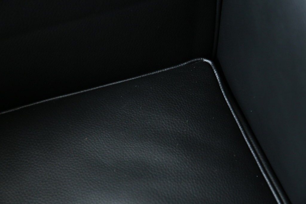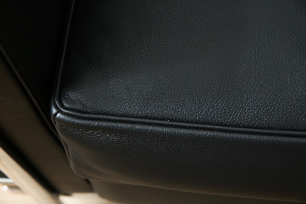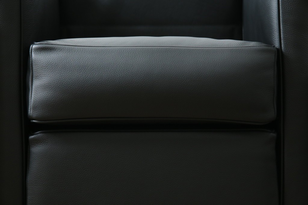 レザーのきめ細かな質感が際立ち、光の当たり方によって微妙に表情を変える上品な仕上がりです。クッションのエッジ部分まで丁寧に縫製され、現代の住空間にも自然に馴染む研ぎ澄まされた印象です。黒レザーならではの静かな重厚感が、落ち着いた雰囲気づくりに一役買ってくれます。