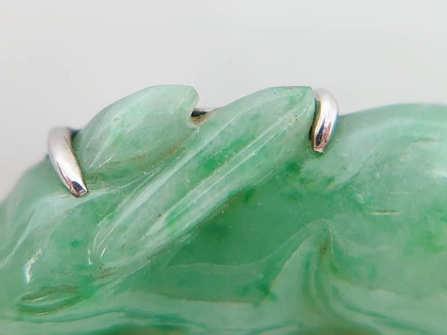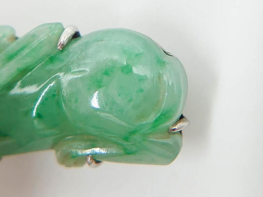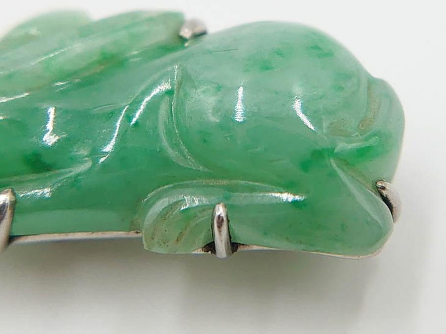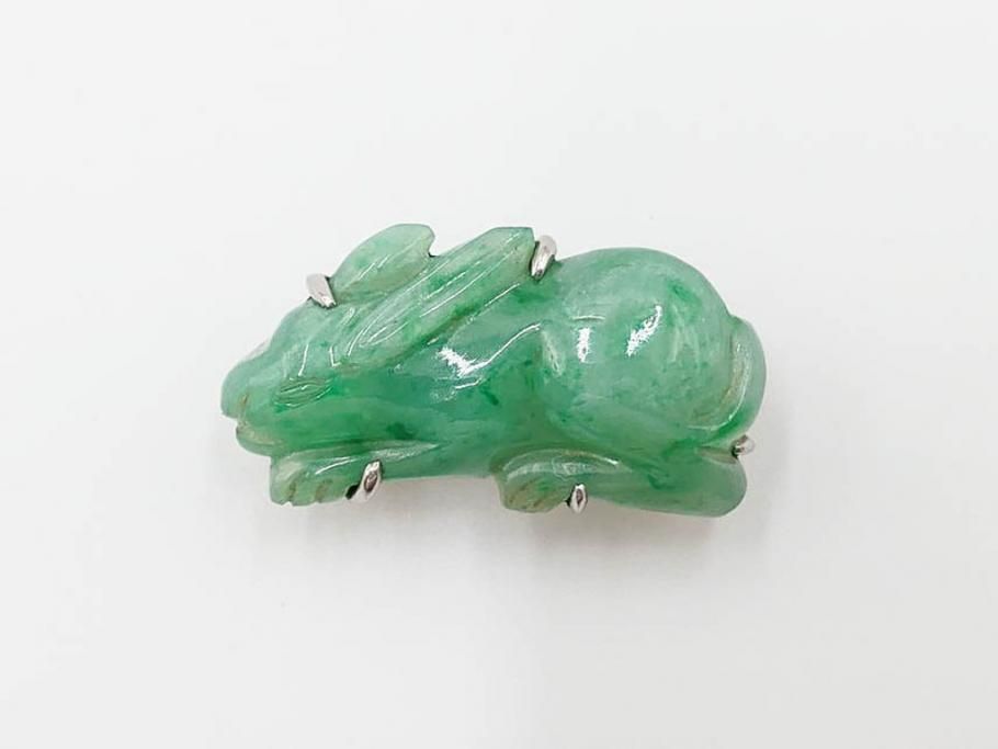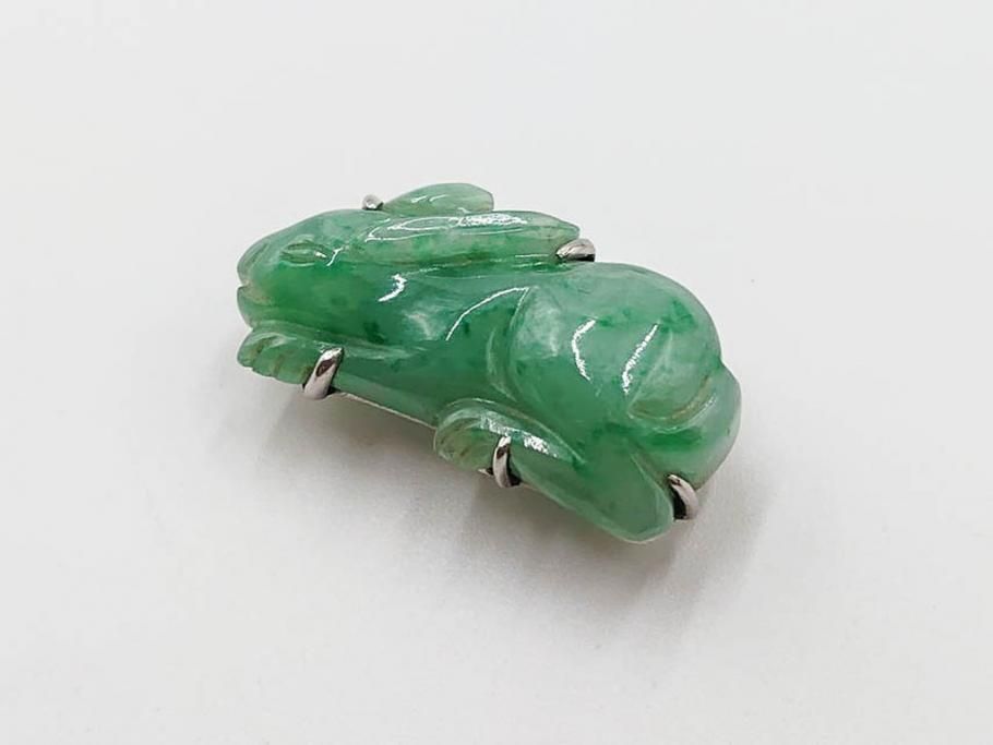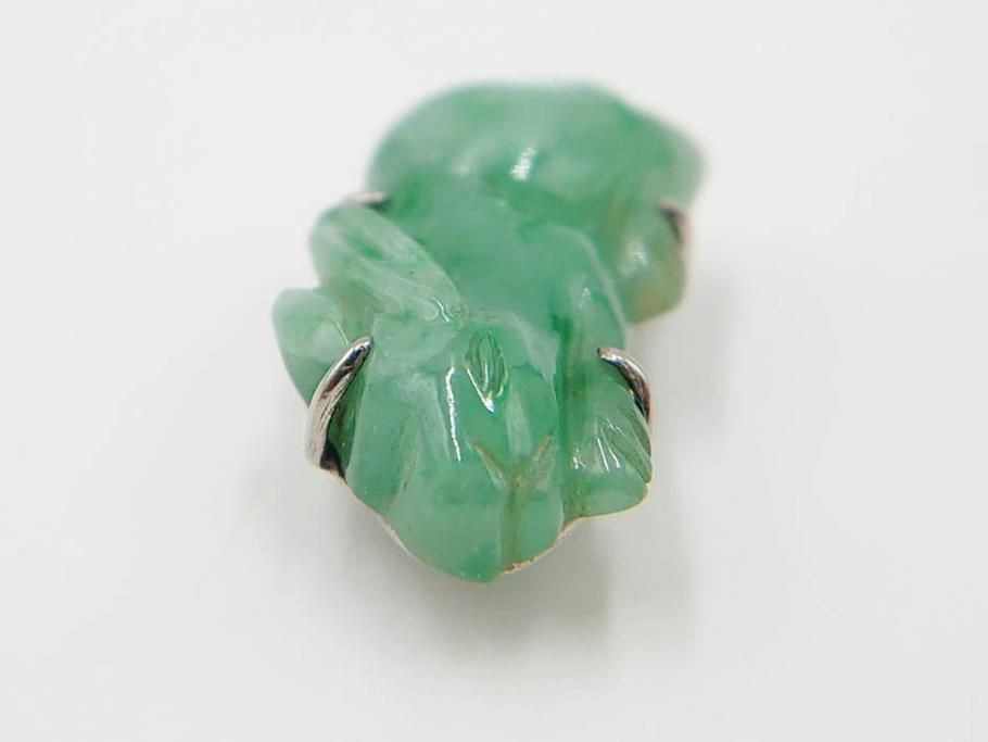 戦前 当時物 アンティーク 翡翠 兎 SPM刻印 柏 在銘 丁寧に彫刻された可愛らしい帯留(ヒスイ、うさぎ、ウサギ、着物道具、和装小物、アクセサリー)(R-084770)