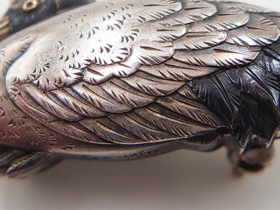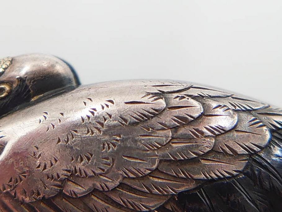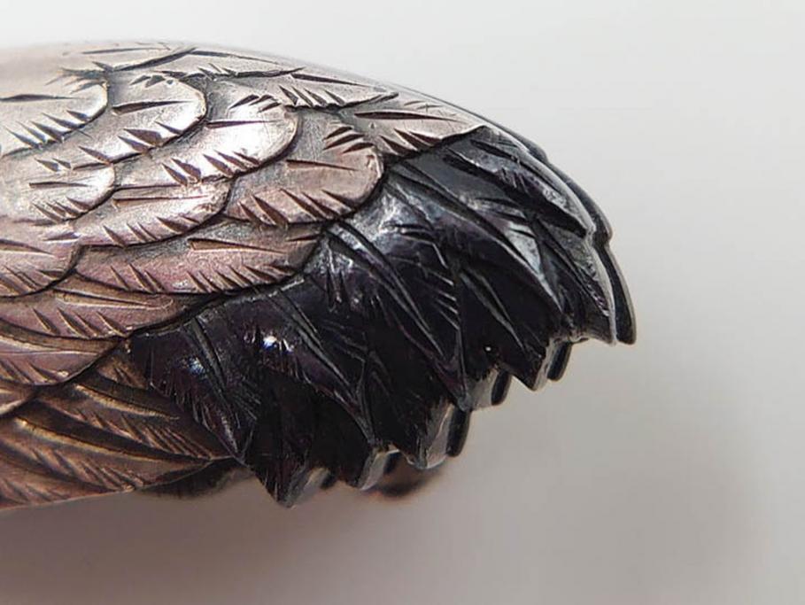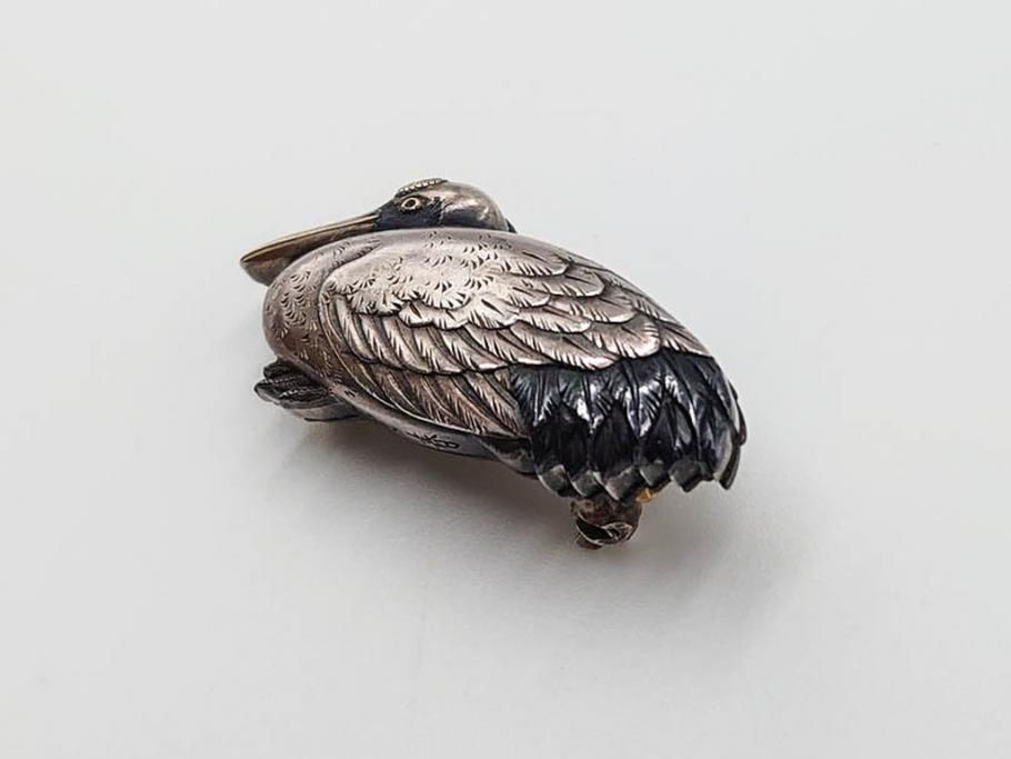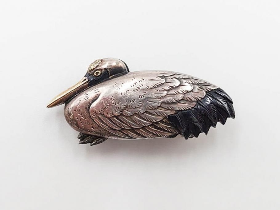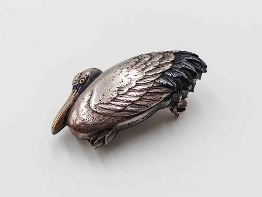 戦前 当時物 アンティーク 彫金家 桂光春 鶴 繊細な彫刻が見事な帯留(つる、ツル、鳥、帯留め、ブローチ、着物道具、和装小物、アクセサリー)(R-084775)