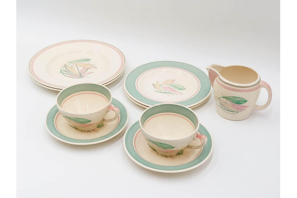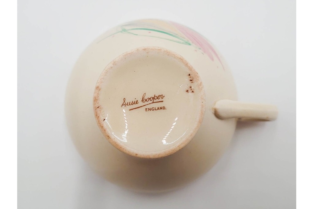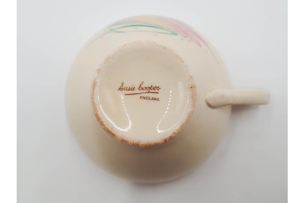 ラフジュ工房> 洋食器・キッチン用品> ポット・シュガーポット・クリーマー > イギリスヴィンテージ Susie Cooper(スージークーパー) ロングリーフ 上品で可愛らしいカップ&ソーサー2客・クリーマー・プレート4枚セット (R-084796)