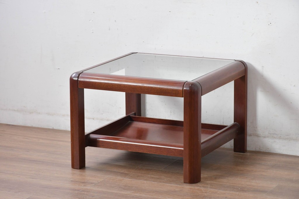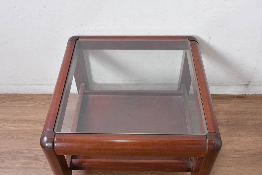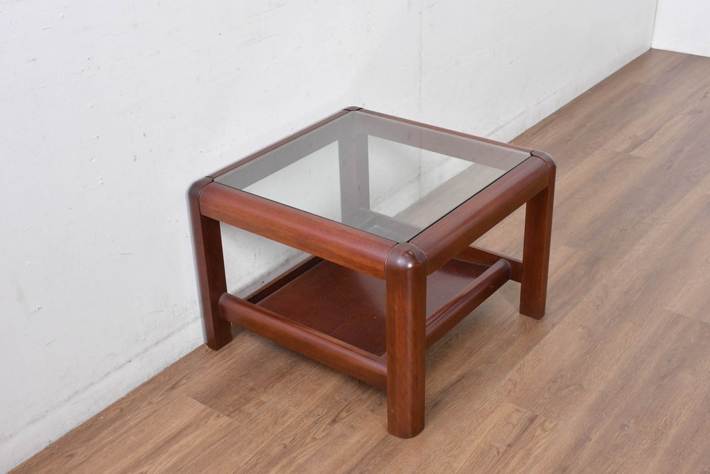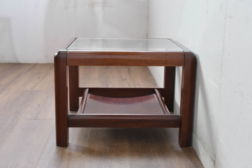 和製ヴィンテージ スクエア型ガラストップの棚付き木製ローテーブル (R-084903)