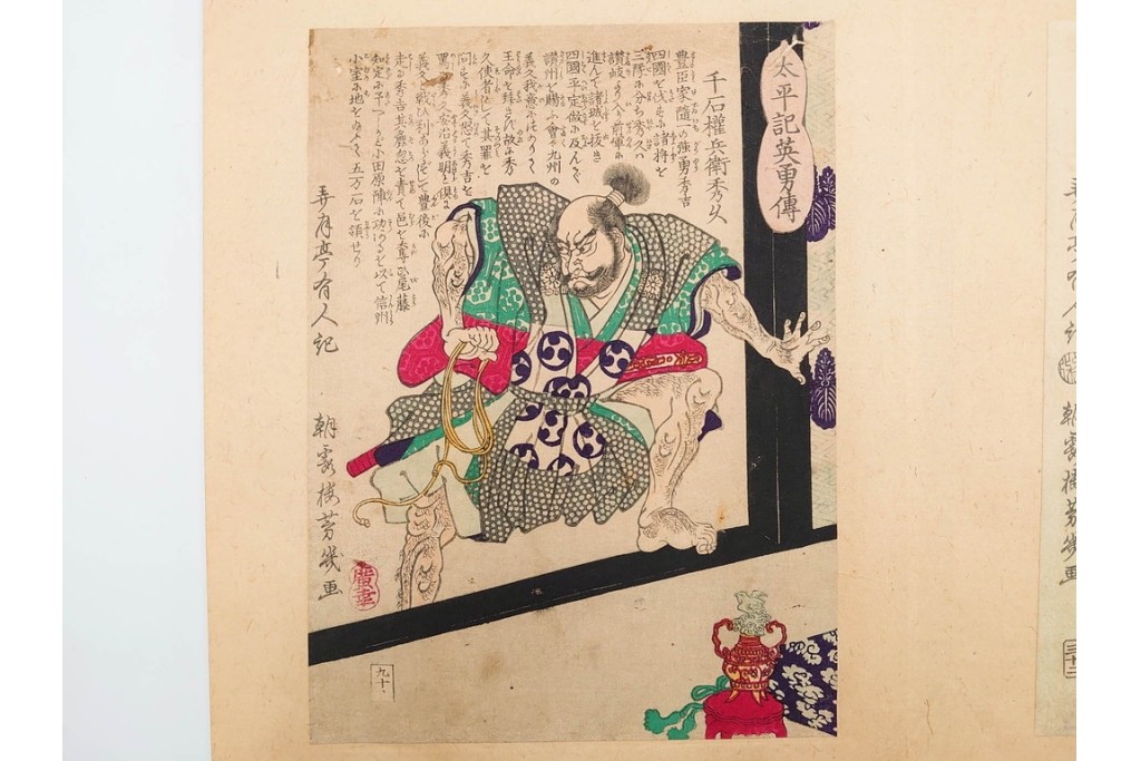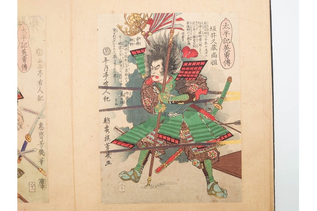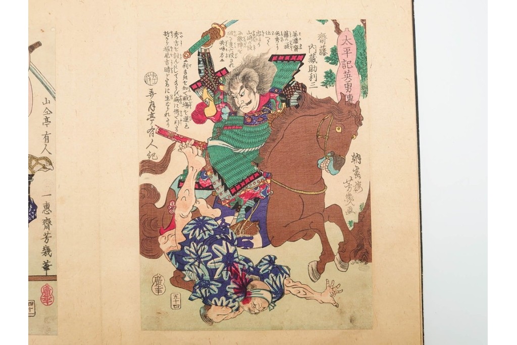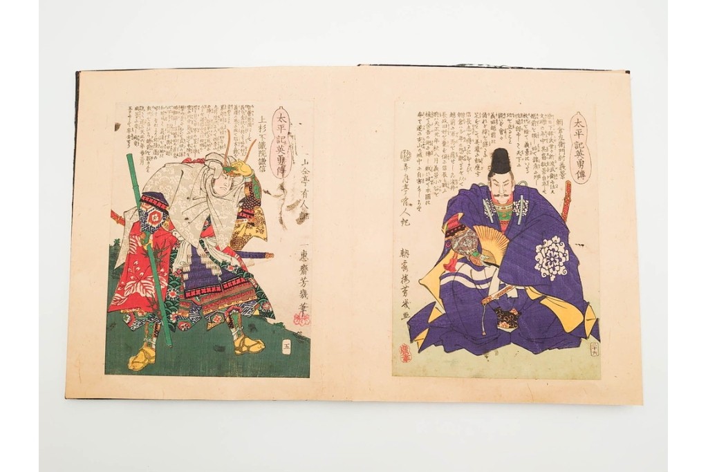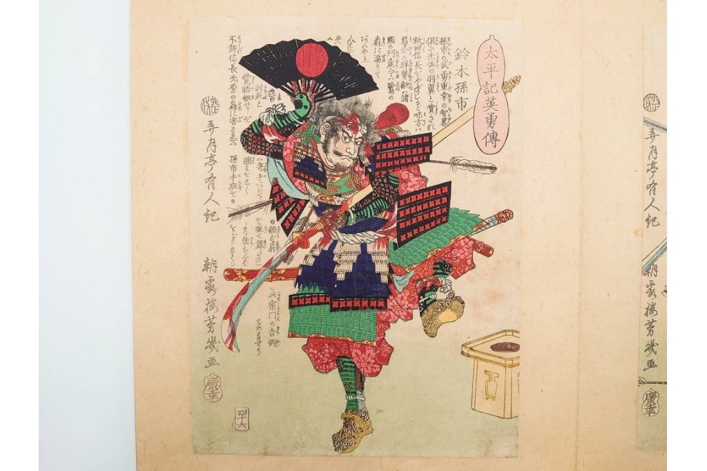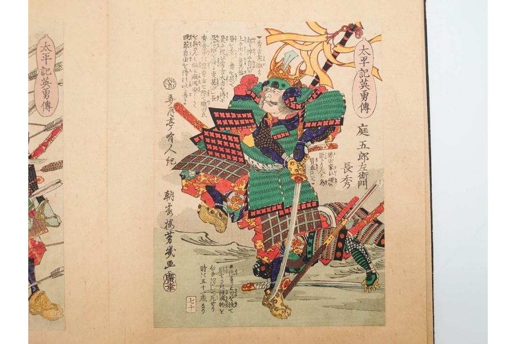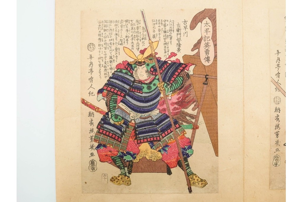 細やかな彫りと刷りが生かされた武者絵が並び、当時の物語世界が豊かな色彩で描かれています。