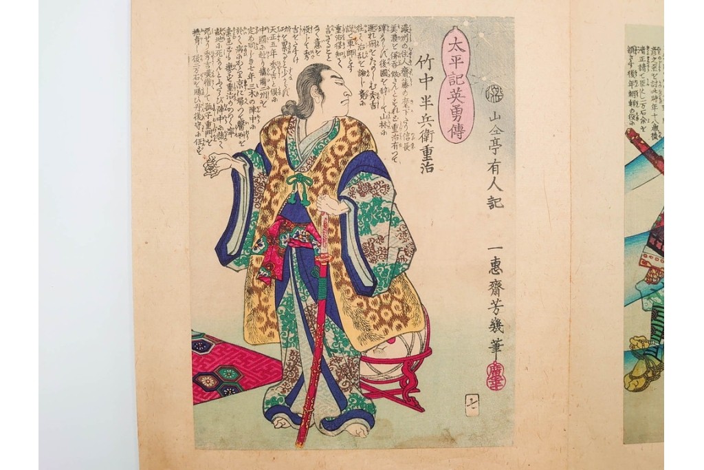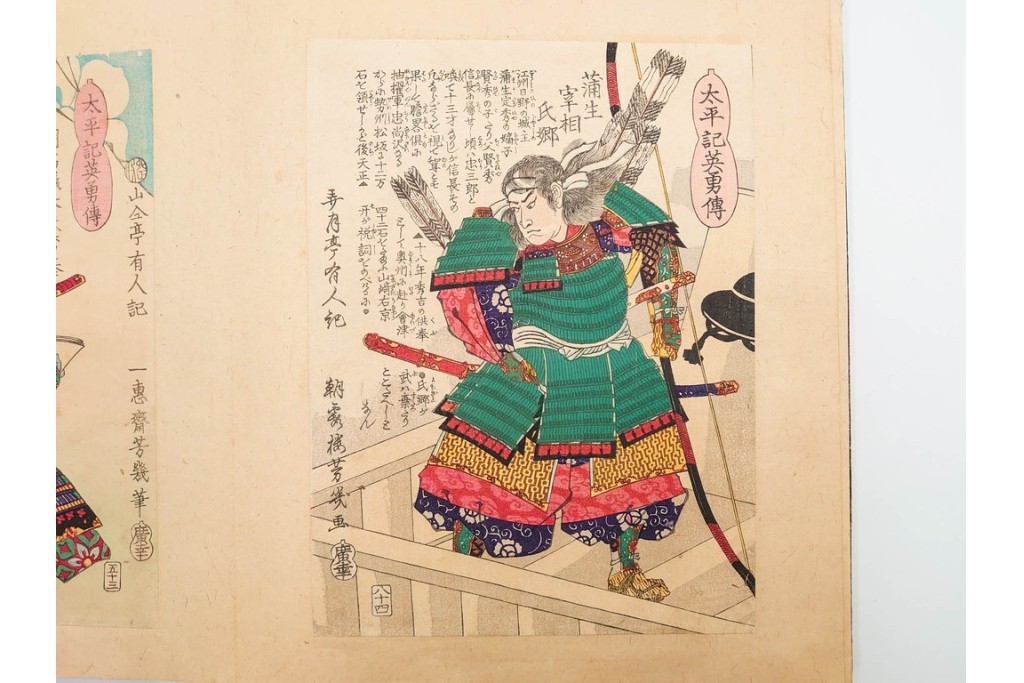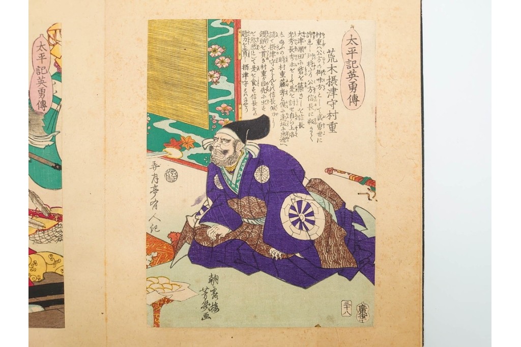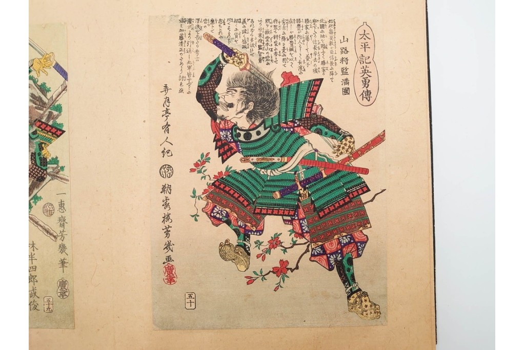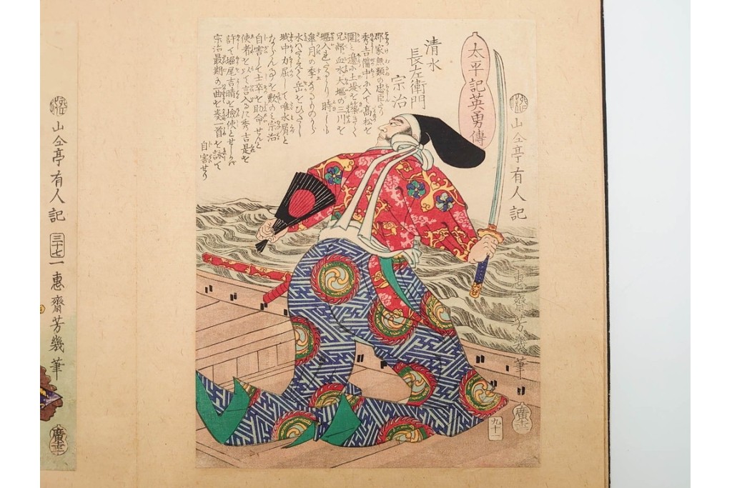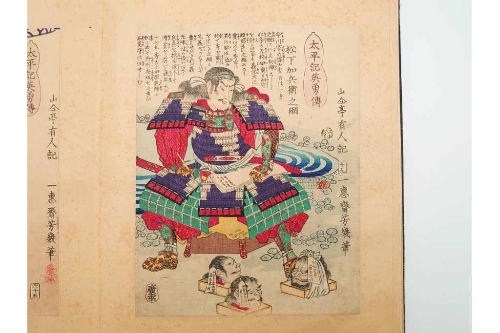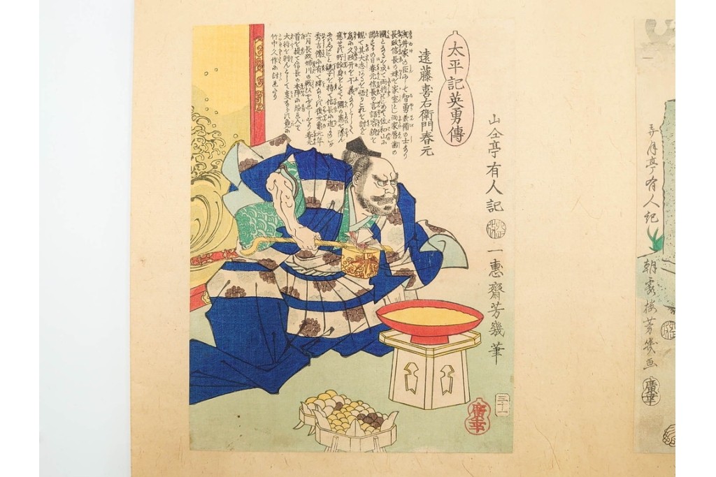 細やかな彫りと刷りが生かされた武者絵が並び、当時の物語世界が豊かな色彩で描かれています。