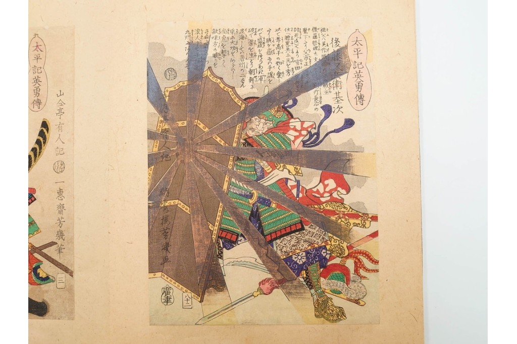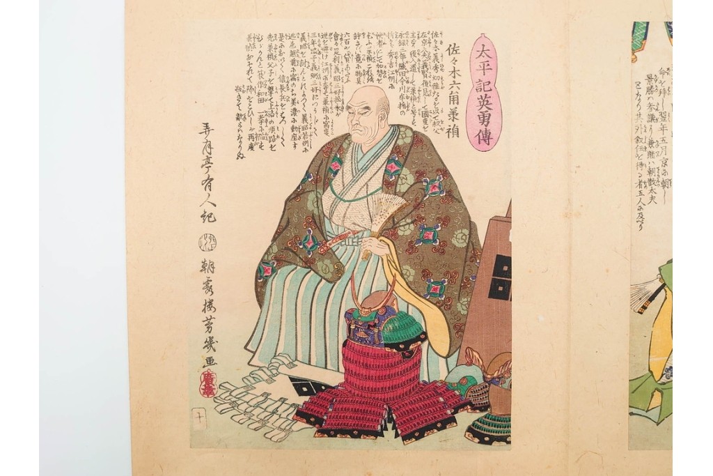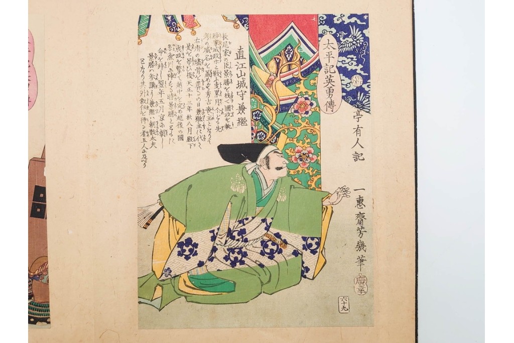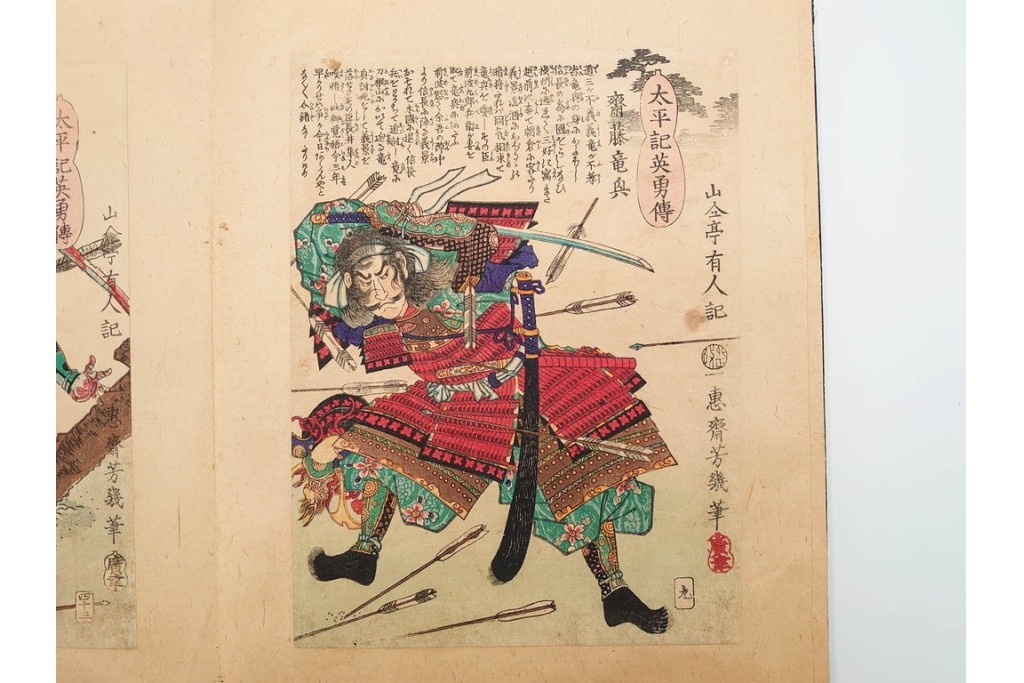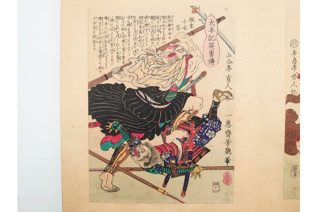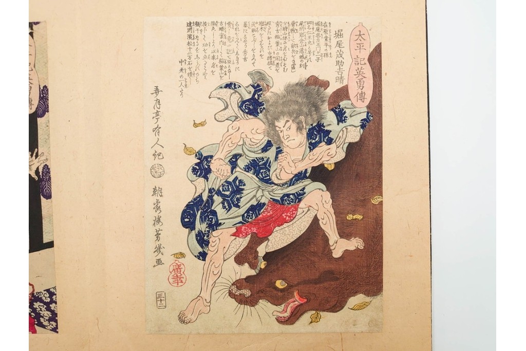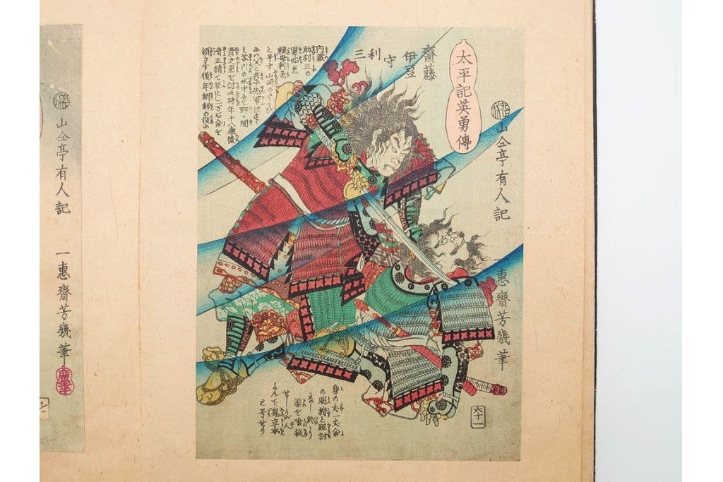 細やかな彫りと刷りが生かされた武者絵が並び、当時の物語世界が豊かな色彩で描かれています。