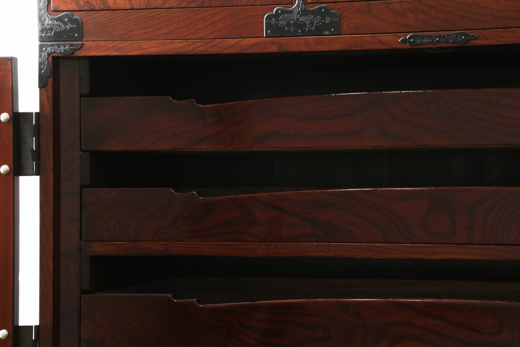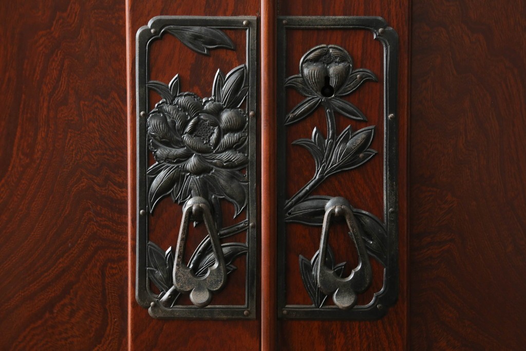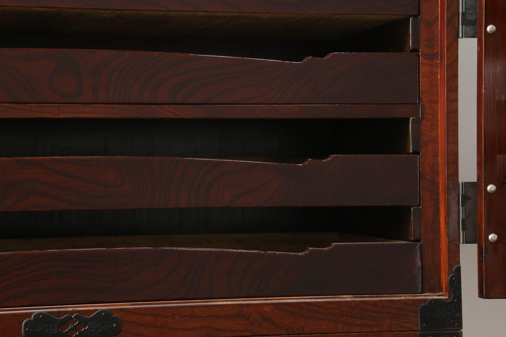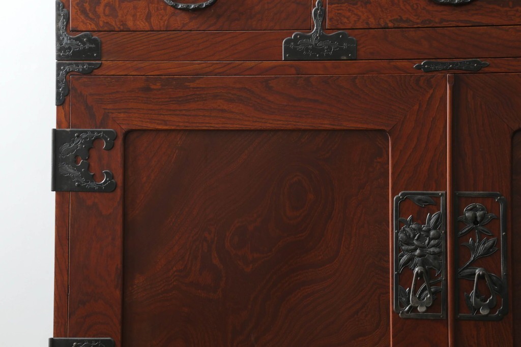 ラフジュ工房> 和箪笥 > 《天板取り付け加工費込み》 和製ヴィンテージ 美品!! 前面(欅材) 上杢目 手打ち金具が素敵な木地呂塗りの観音開き仙台箪笥 (R-084931)