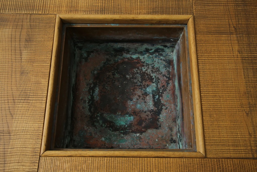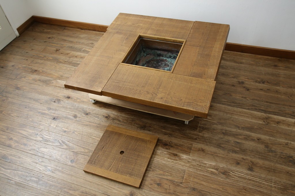 ラフジュ工房> 火鉢 > 中古 国産 職人手作り ナラ材 天板の鋸目(のこめ)仕上げの意匠がおしゃれな囲炉裏テーブル (R-084940)