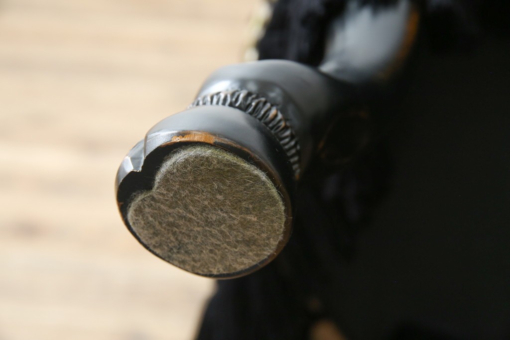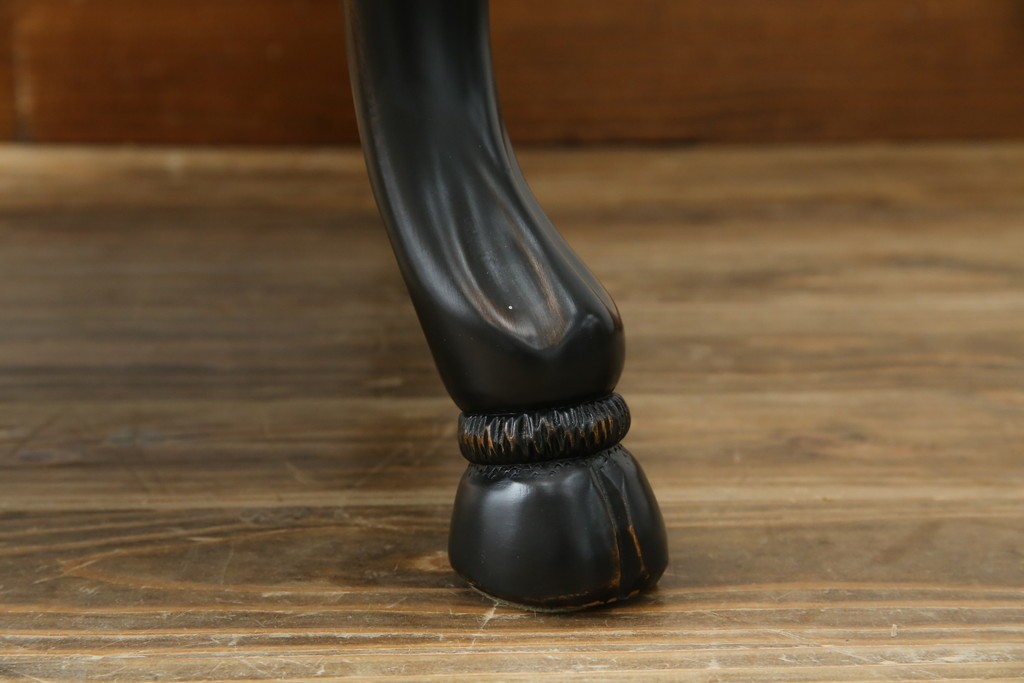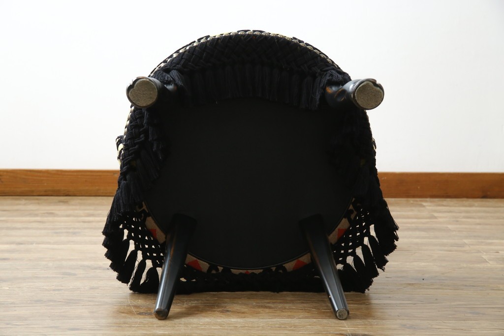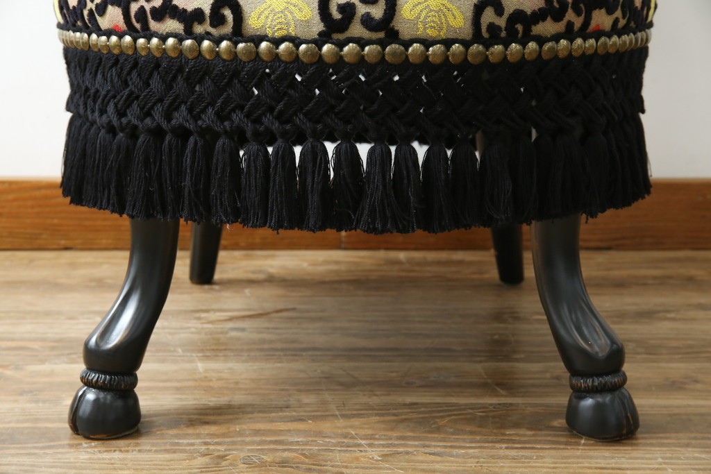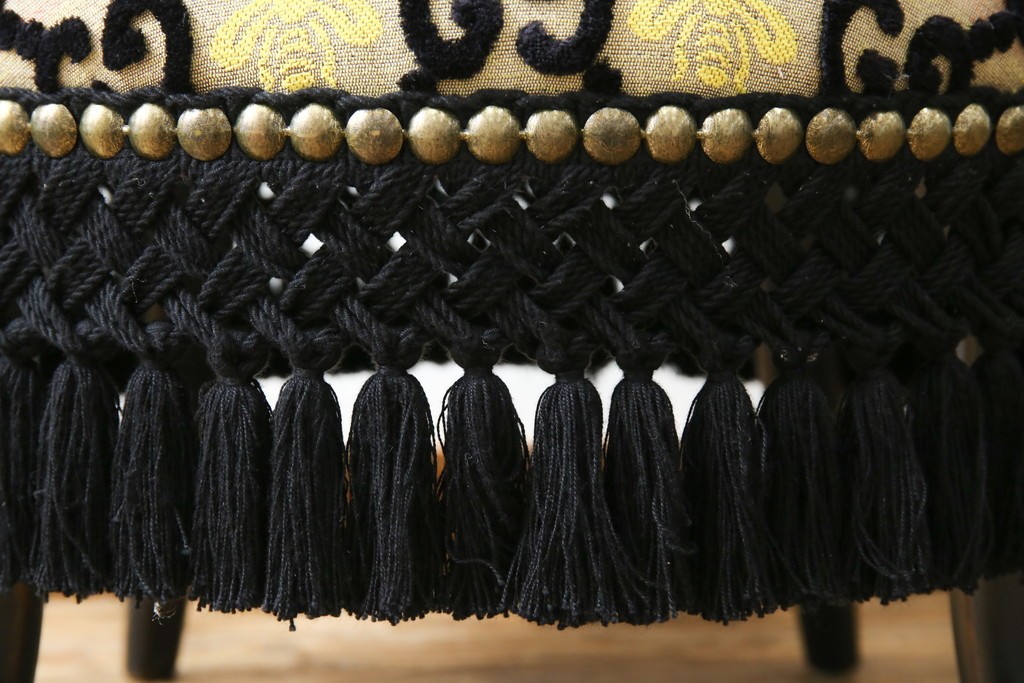 座面周囲の糸巻きフリンジ、鋲打ち装飾、曲線美が際立つ動物の脚など、随所に上質なクラフト要素が詰め込まれた1脚です。重厚さと遊び心の両方が共存するデザインで、アートピースのような存在感が魅力です。
