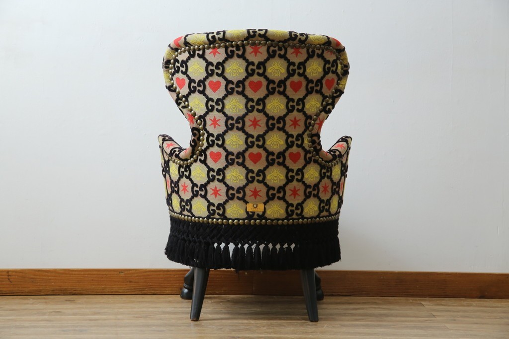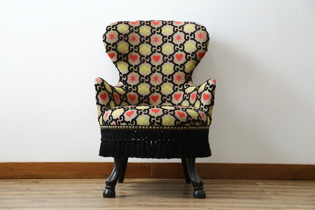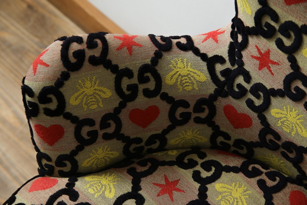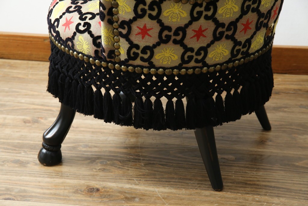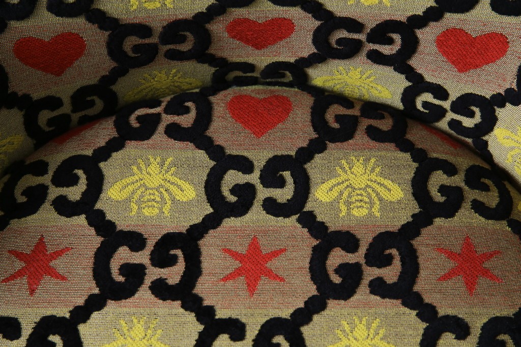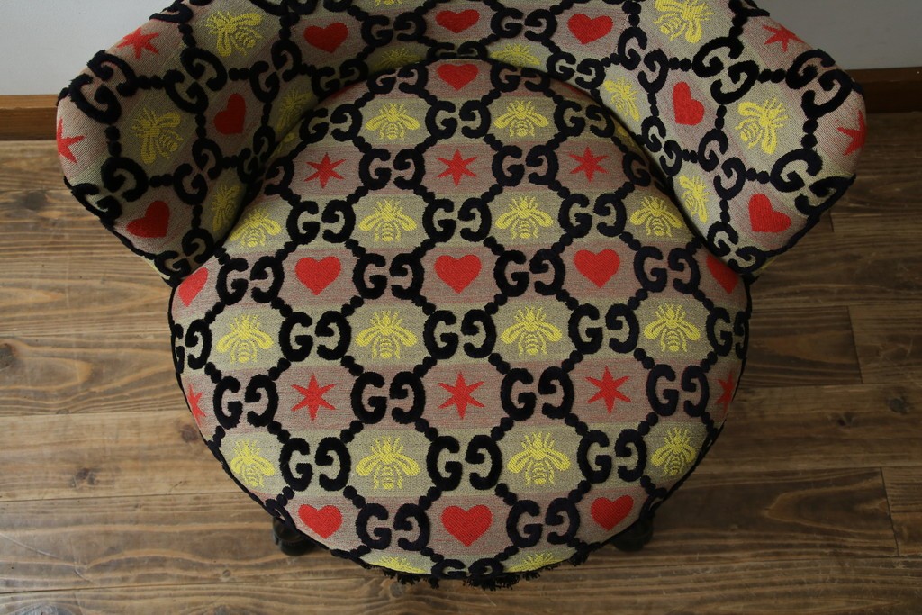 GUCCI(グッチ)の「デコール」シリーズのアームチェアです。ブランドを象徴するビー(ハチ)・スター・GGパターンが全体に大胆にあしらわれ、ひと目で分かる圧倒的存在感を放ちます。お部屋の主役になるインテリアとして抜群の華やかさを持っています。