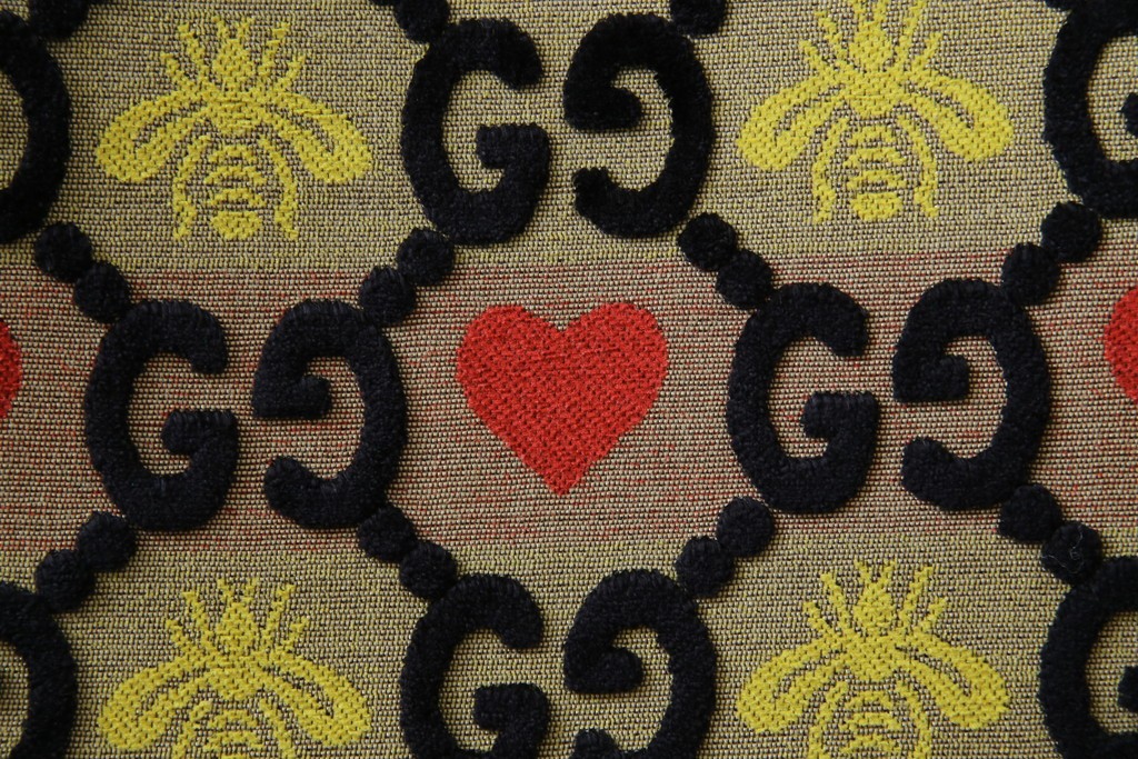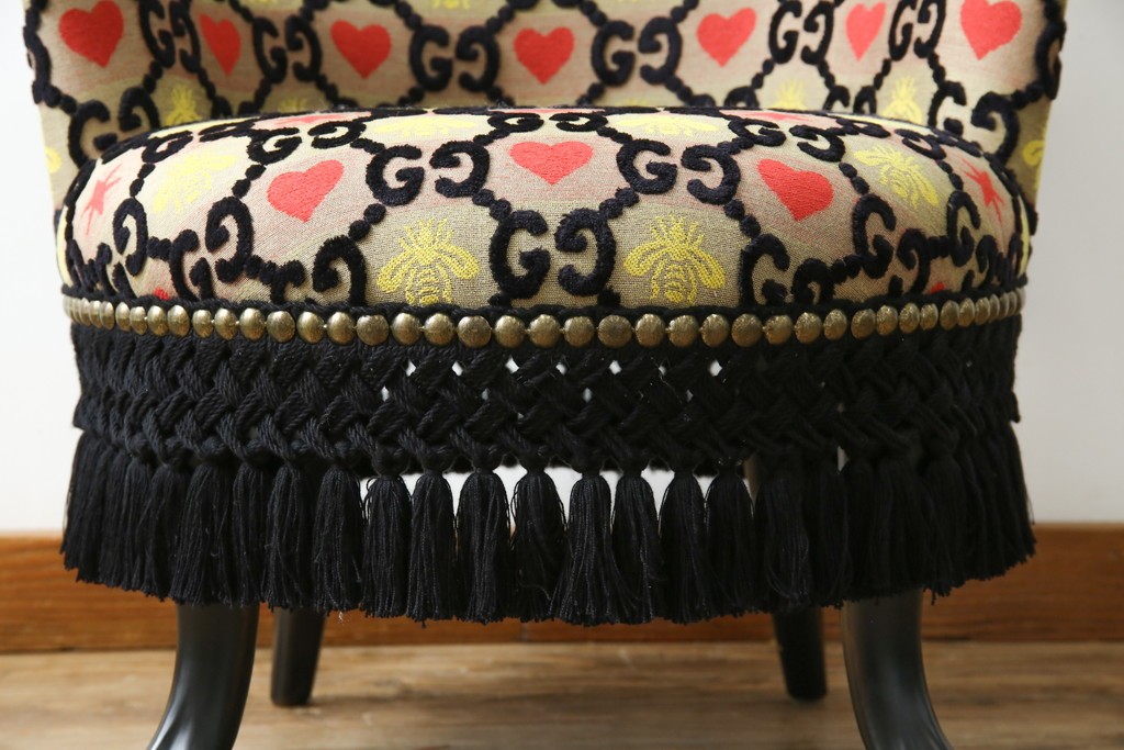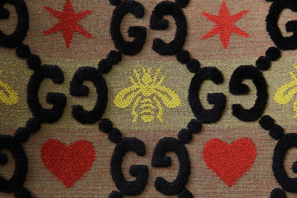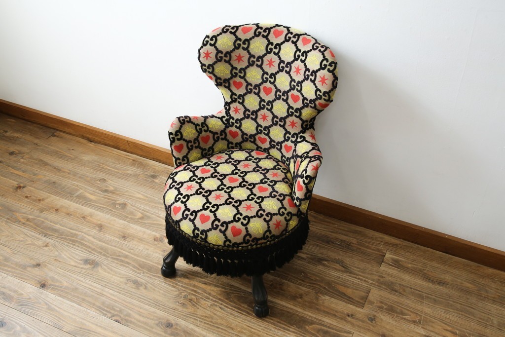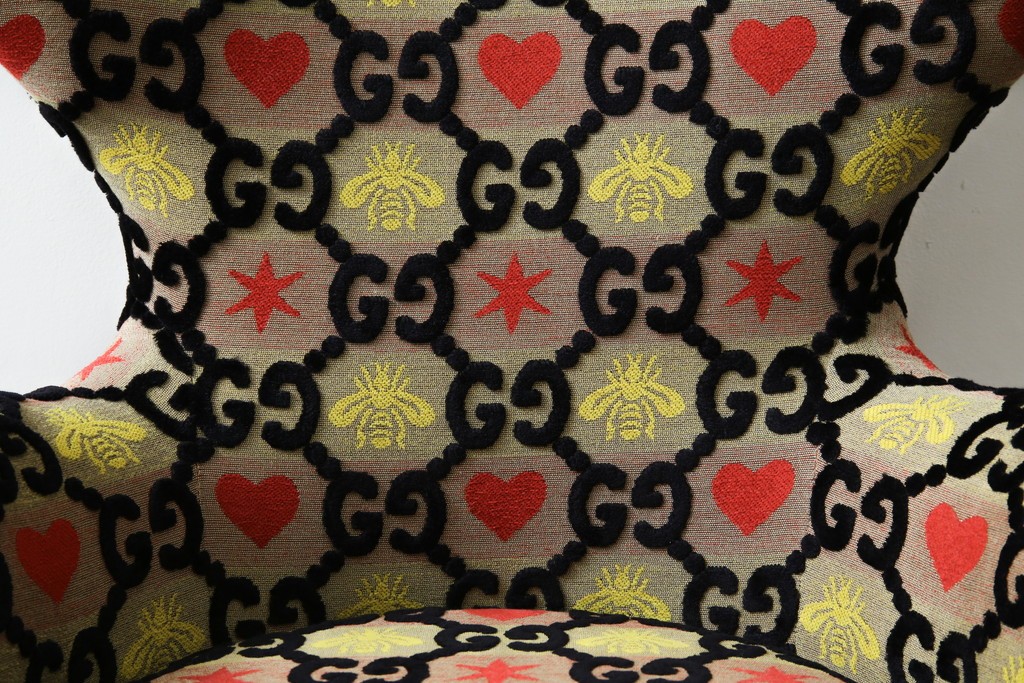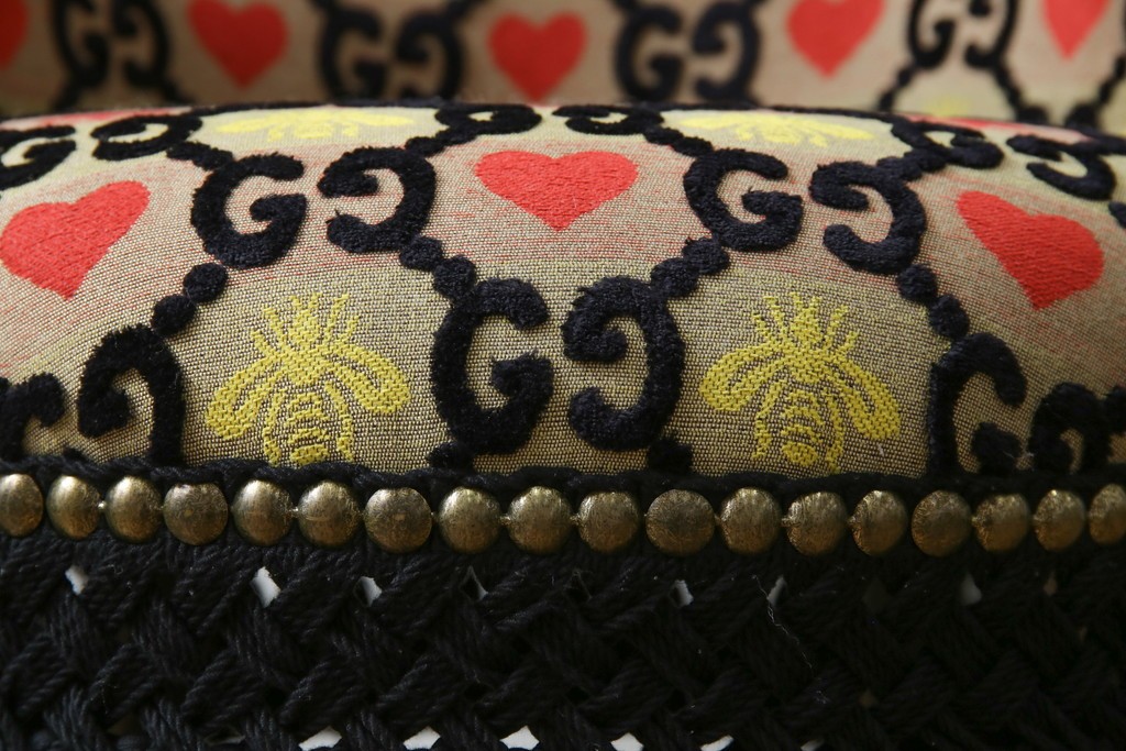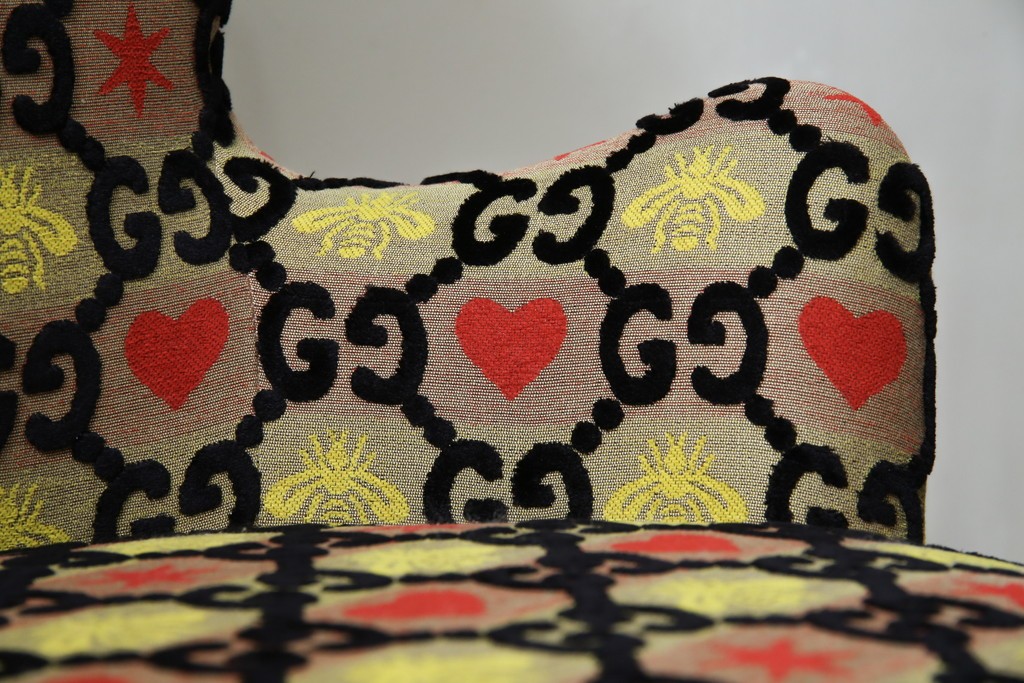 GUCCI(グッチ)の「デコール」シリーズのアームチェアです。ブランドを象徴するビー(ハチ)・スター・GGパターンが全体に大胆にあしらわれ、ひと目で分かる圧倒的存在感を放ちます。お部屋の主役になるインテリアとして抜群の華やかさを持っています。