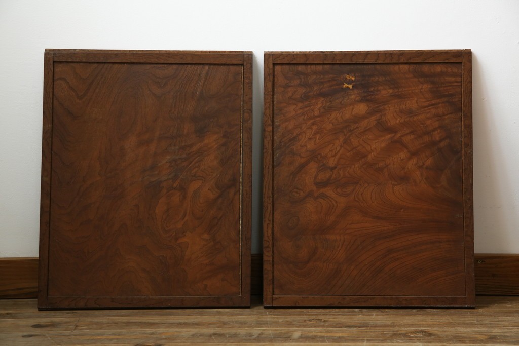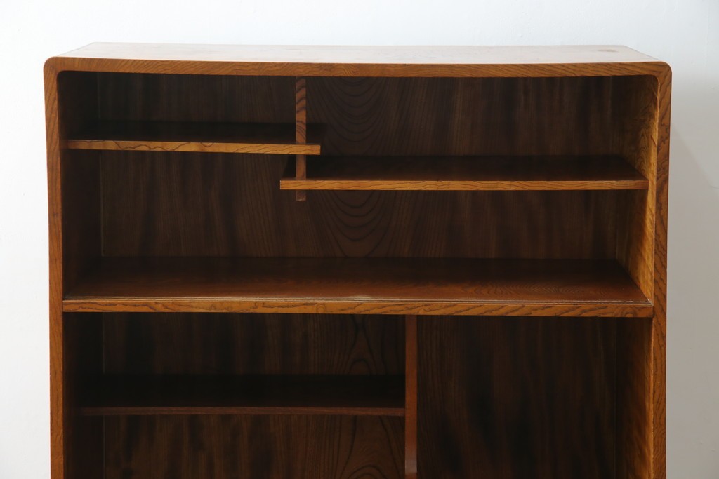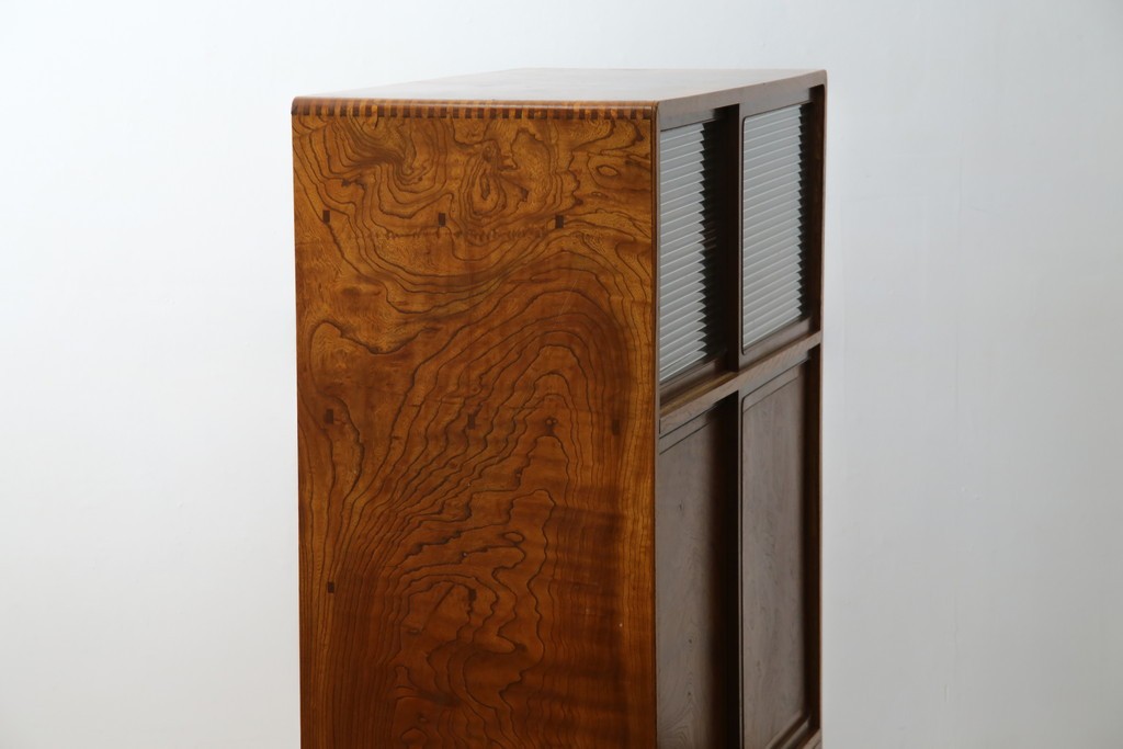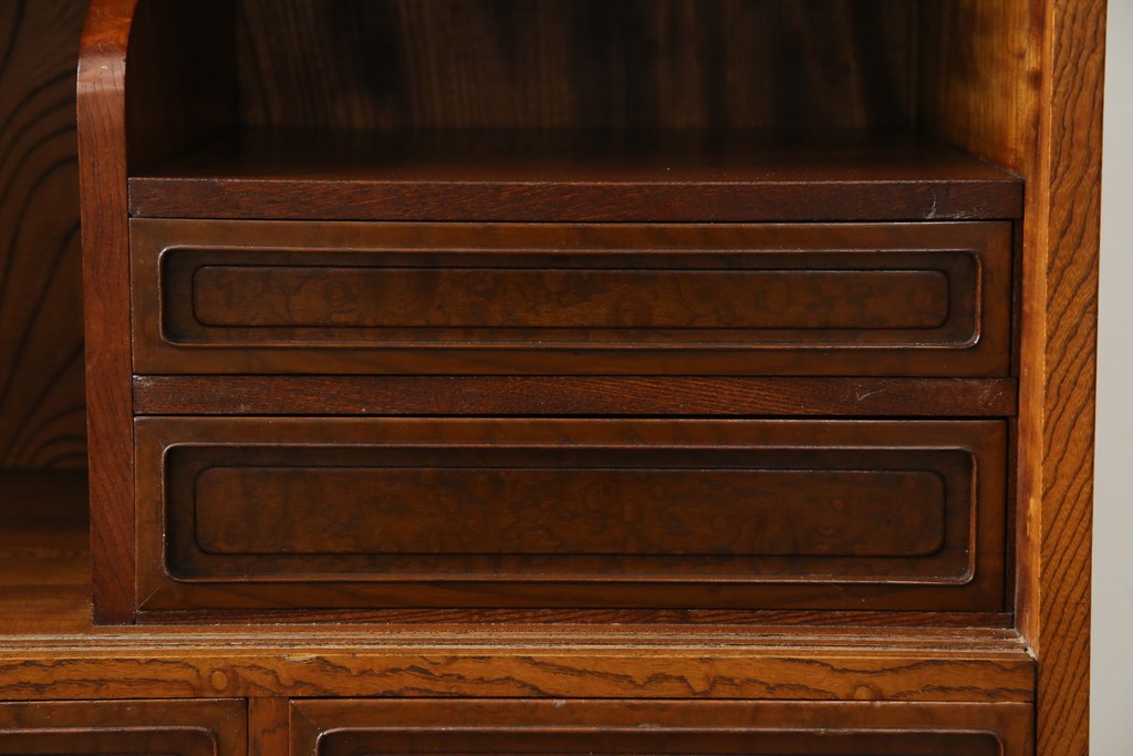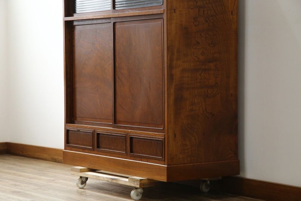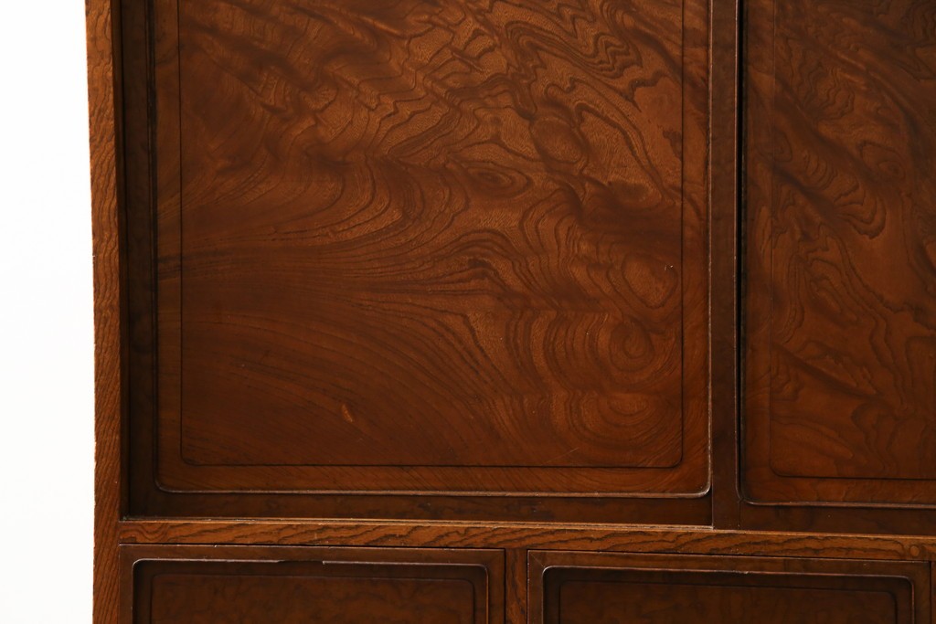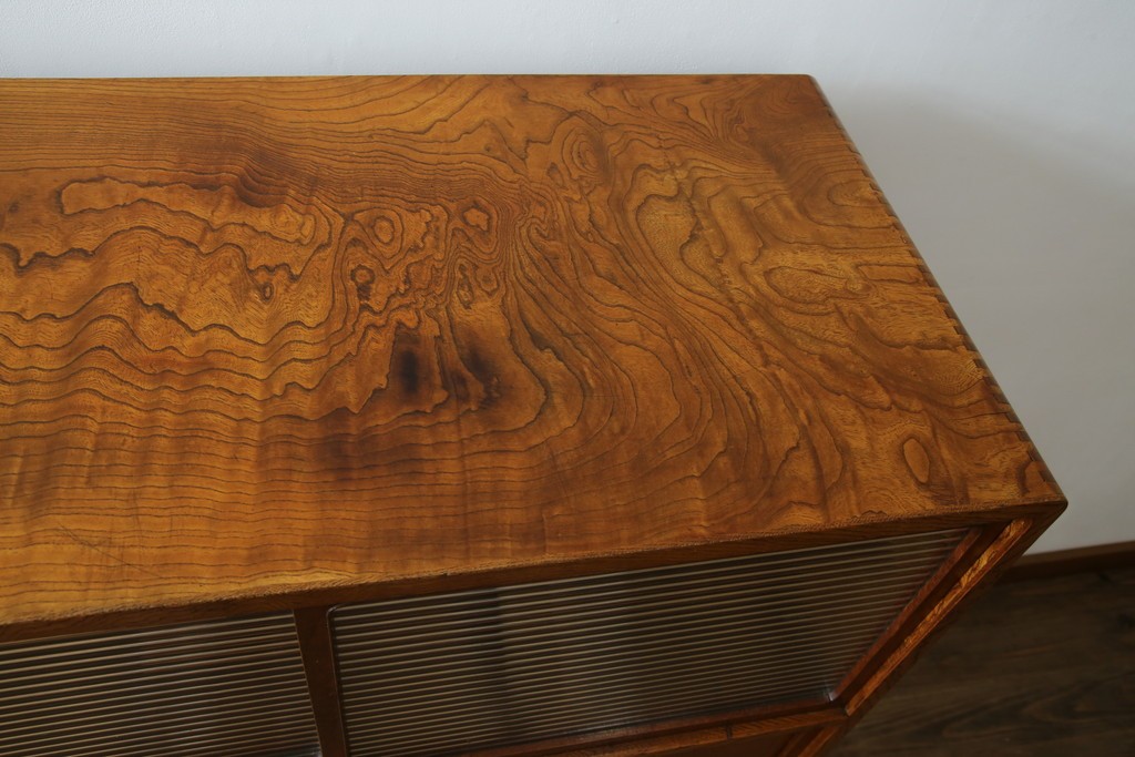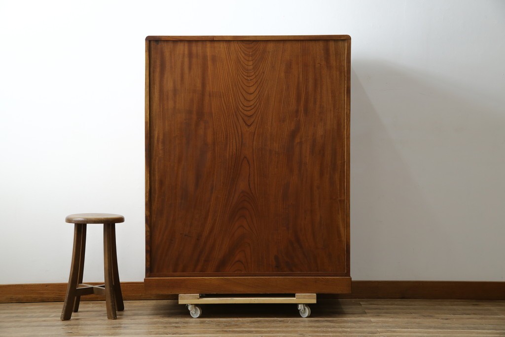 欅(ケヤキ)材を贅沢に使用した、昭和中期のヴィンテージ茶箪笥です。木目の美しさが際立つ上杢材に、職人の確かな技が光る指物仕立て。温かみのある漆塗り仕上げが、欅の深みある色艶をさらに引き立てています。