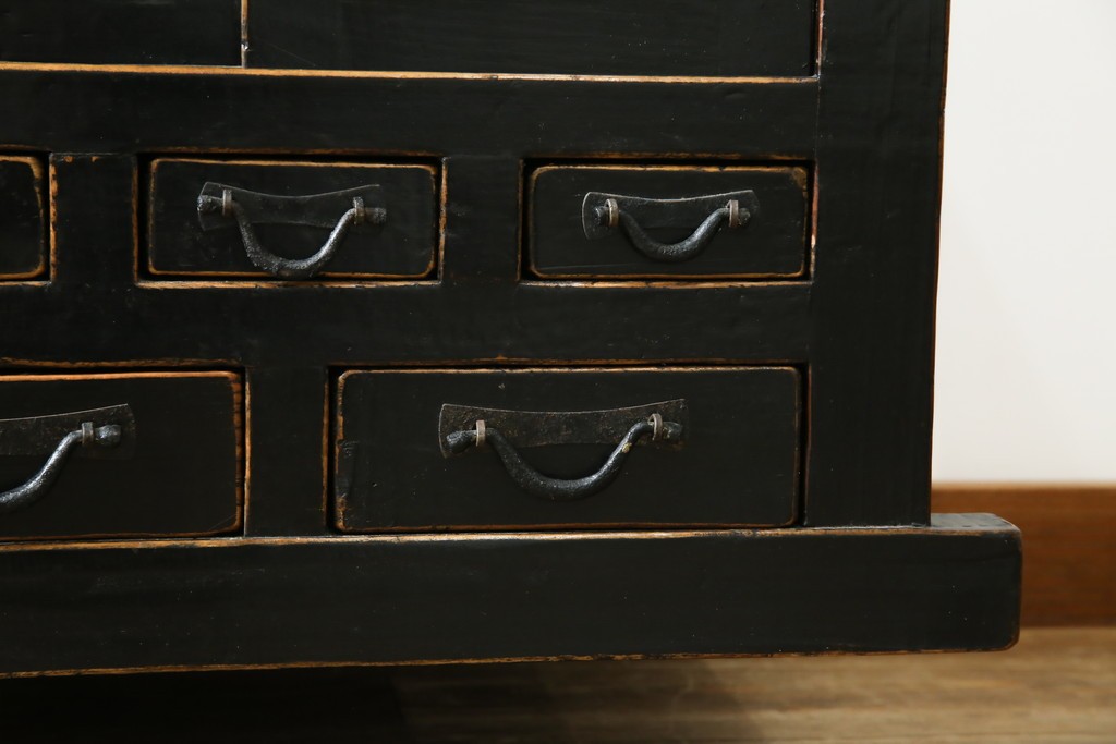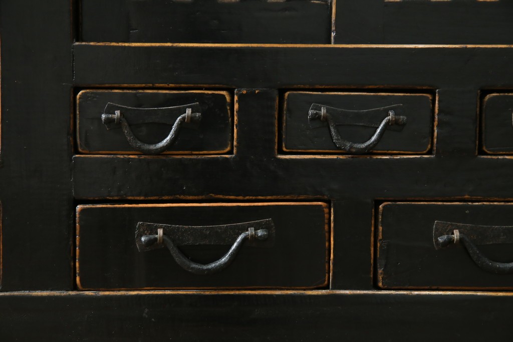 引き戸内部には棚板が備わり、小引き出しが多く配置されているため、細かなものの整理に役立ちます。