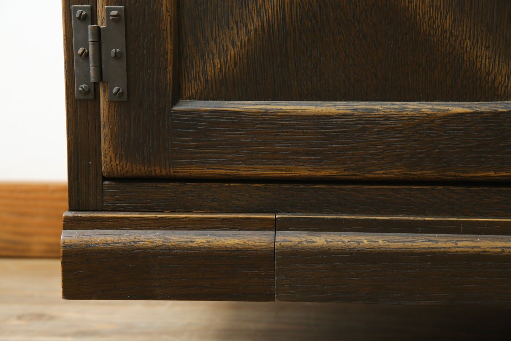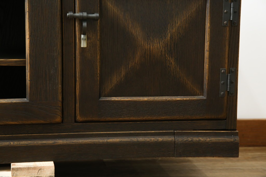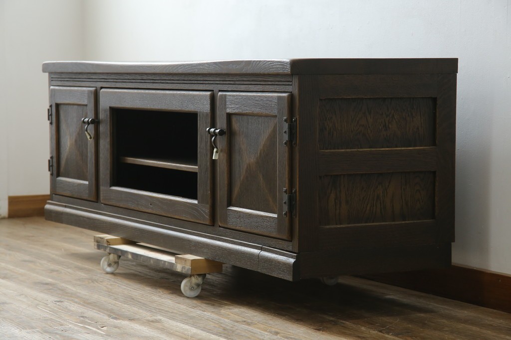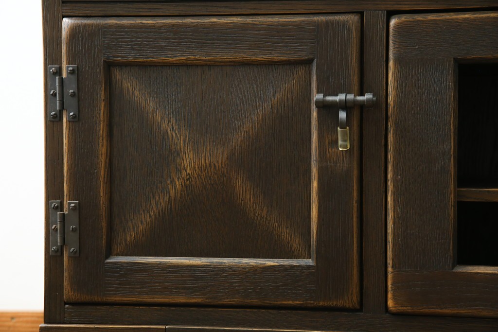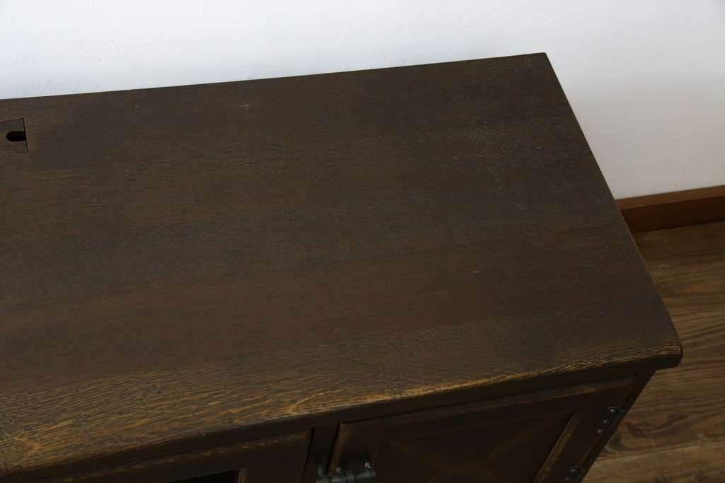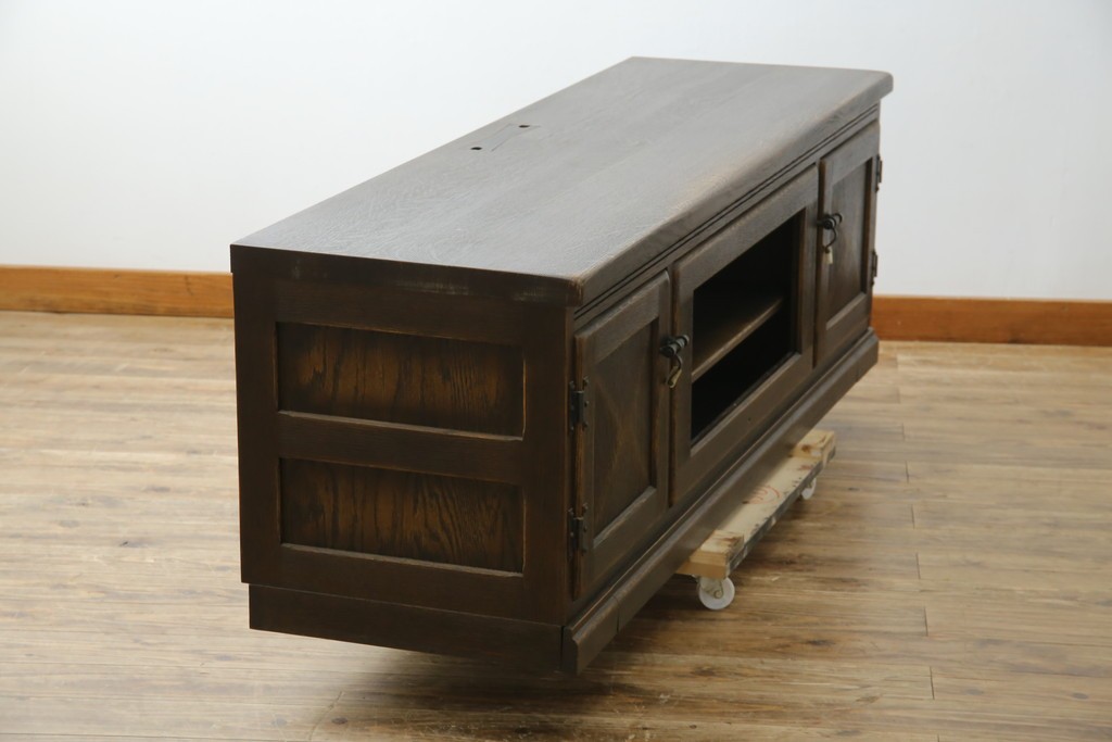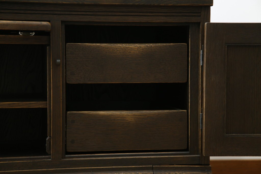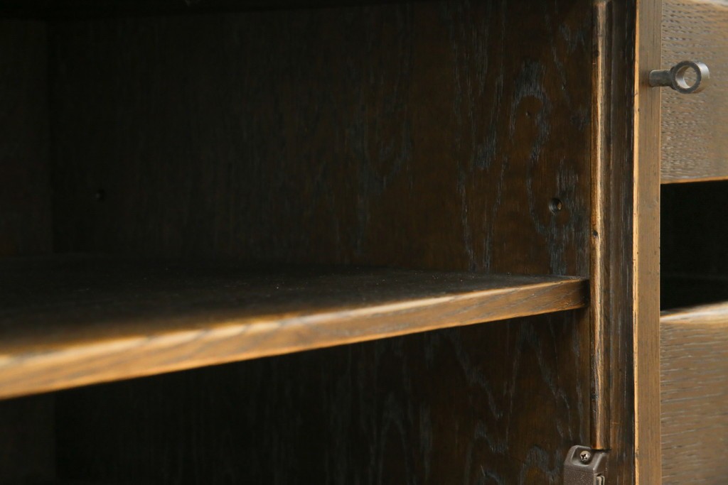 両側には扉付き収納が備わり、内部の棚板により日用品や周辺機器を整理しやすい構造になっています。