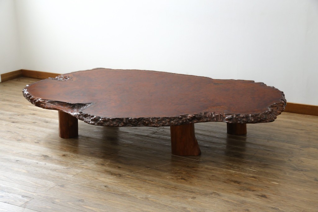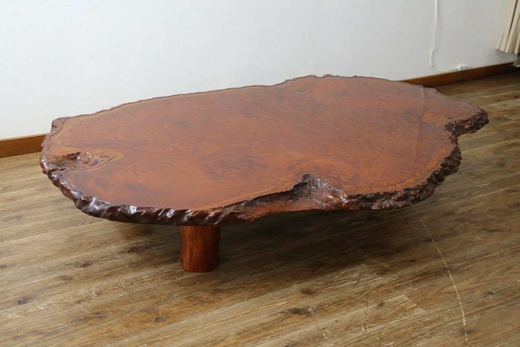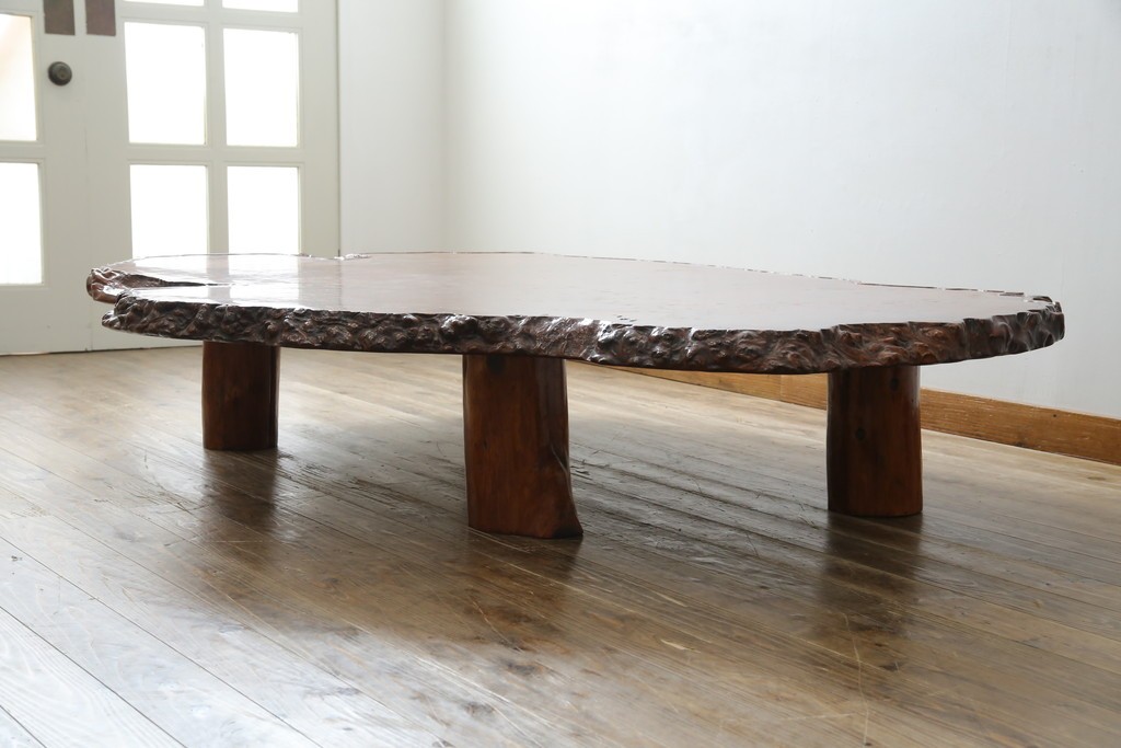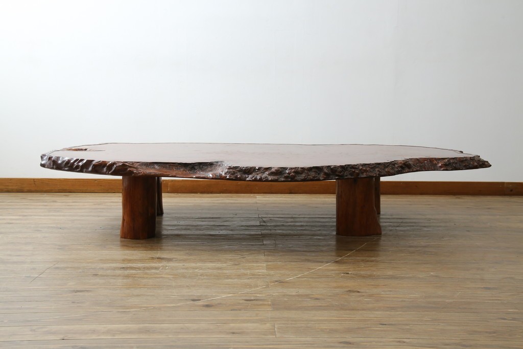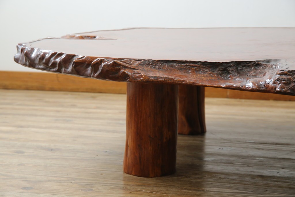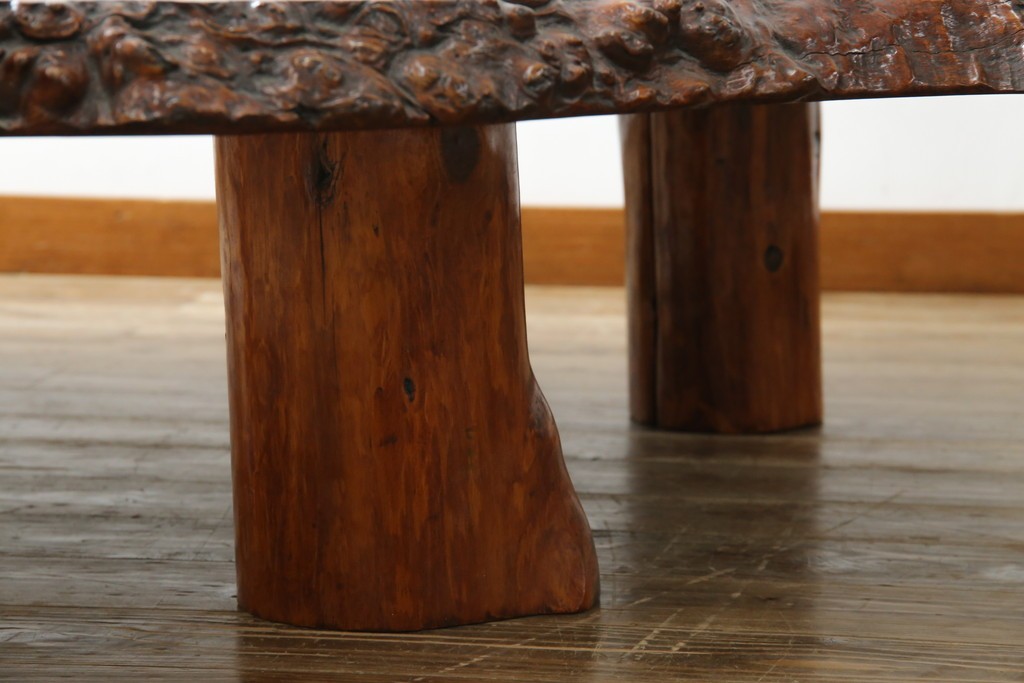外周部は木の形をそのまま生かした造形となっており、迫力のあるシルエットが空間の主役になります。脚部も無垢材の丸太を使用し、全体を通して自然の素材感がダイレクトに感じられる座卓です。