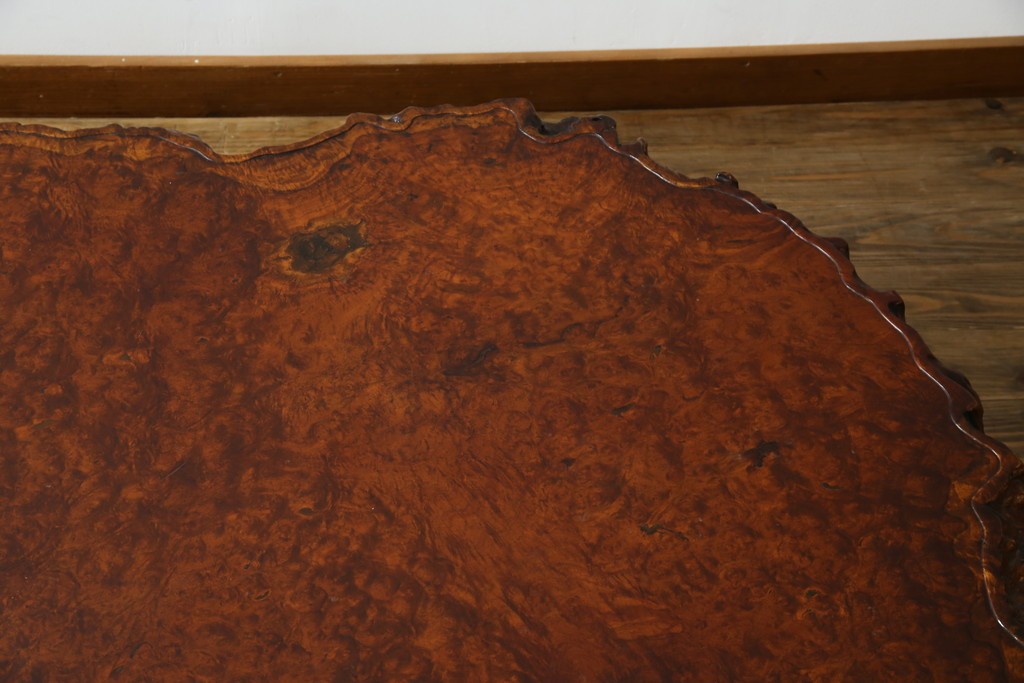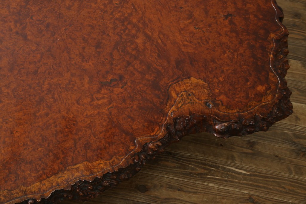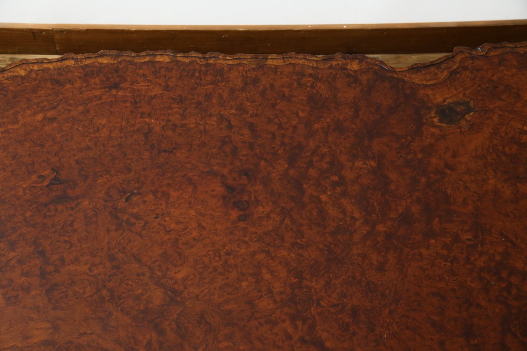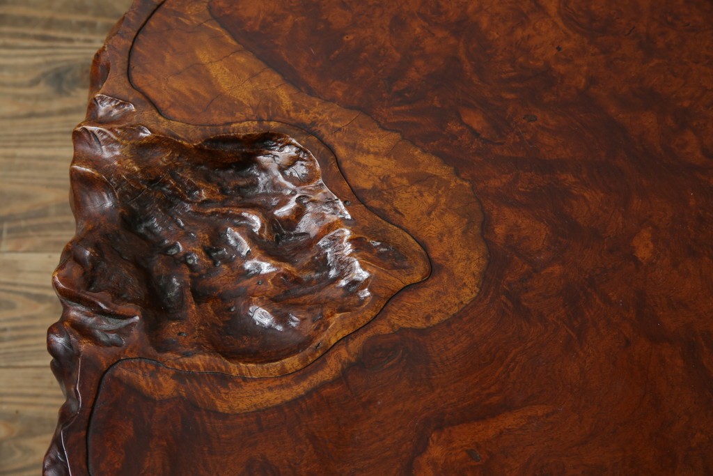 天板には鳥眼杢や葡萄杢と呼ばれる複雑な木目が一面に広がり、思わず見入ってしまうほどの表情豊かな仕上がりです。自然が生み出した文様がそのまま活かされており、一枚板ならではの力強さと美しさを感じられます。