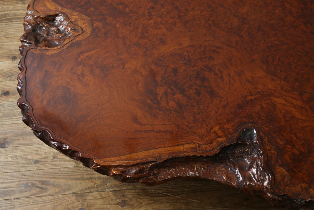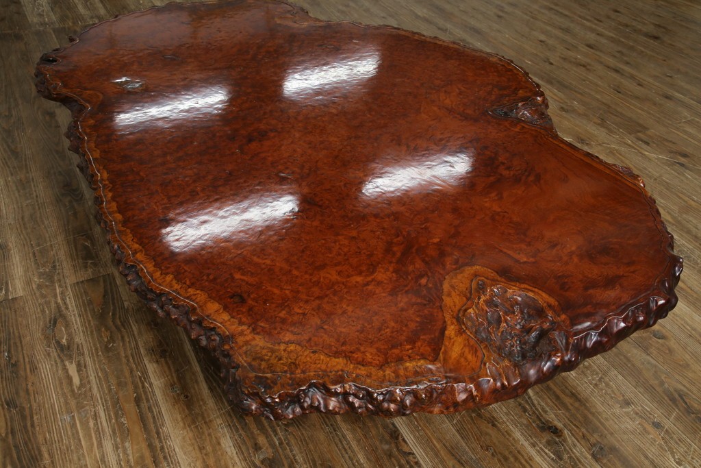 花梨材を用いた特大サイズの一枚板座卓です。硬質な木質と深みのある色調が相まって、高級感のある重厚な雰囲気を漂わせています。天然木ならではの味わいが年月を経ても魅力を保ち続けています。