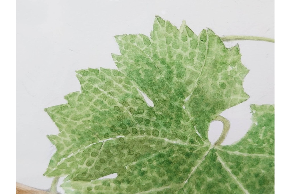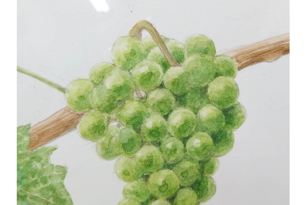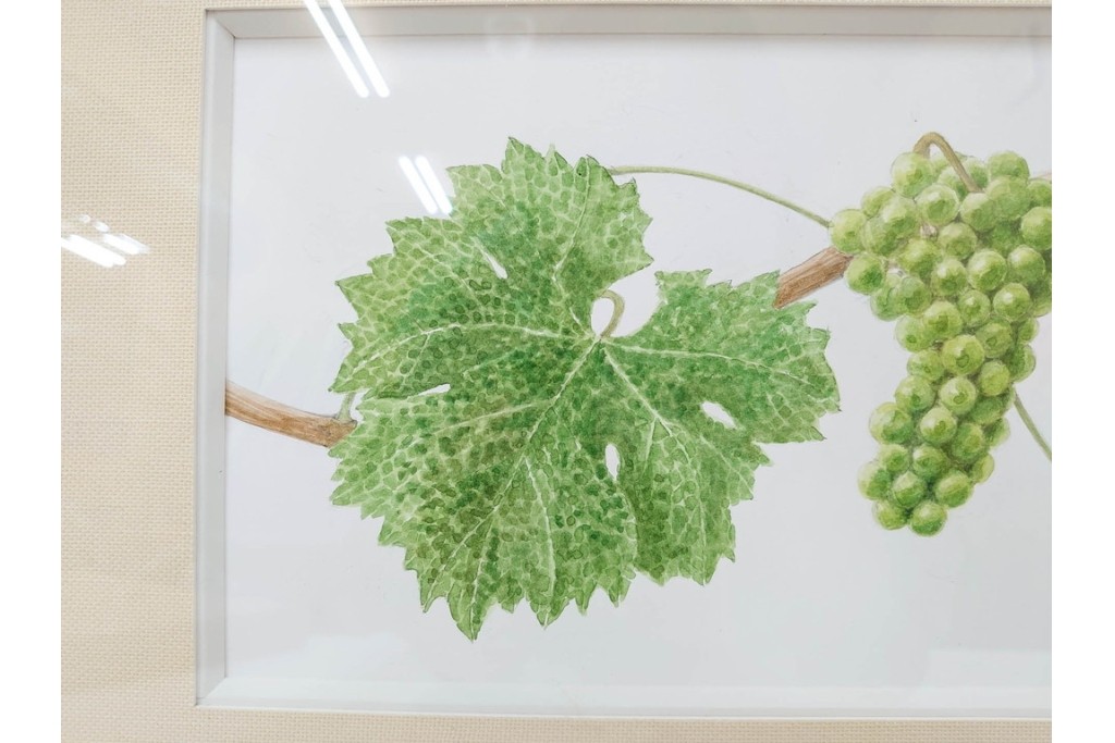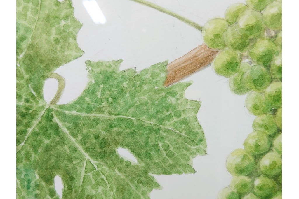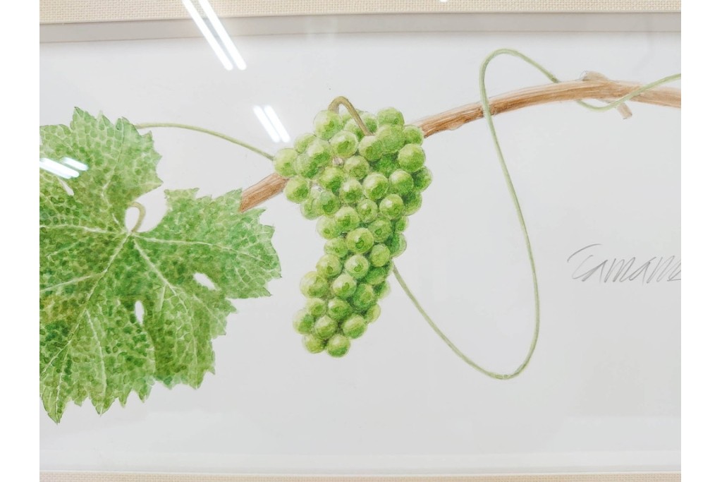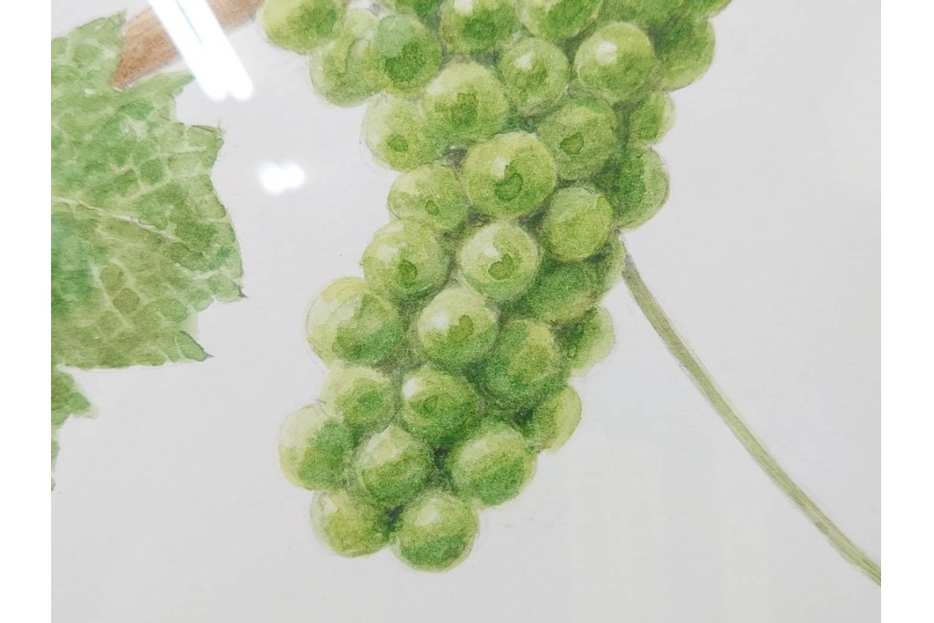 「ソーヴィニヨンブラン 2013 ヴィンテージ」を題材に、みずみずしい白ぶどうの表情が丁寧に描かれています。