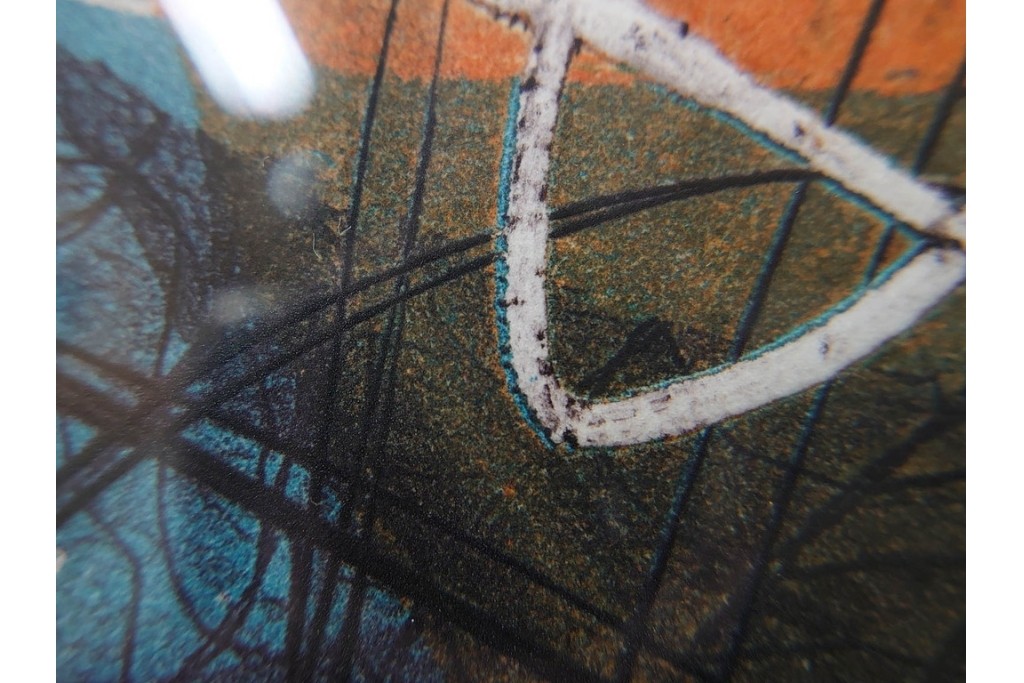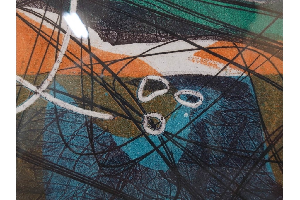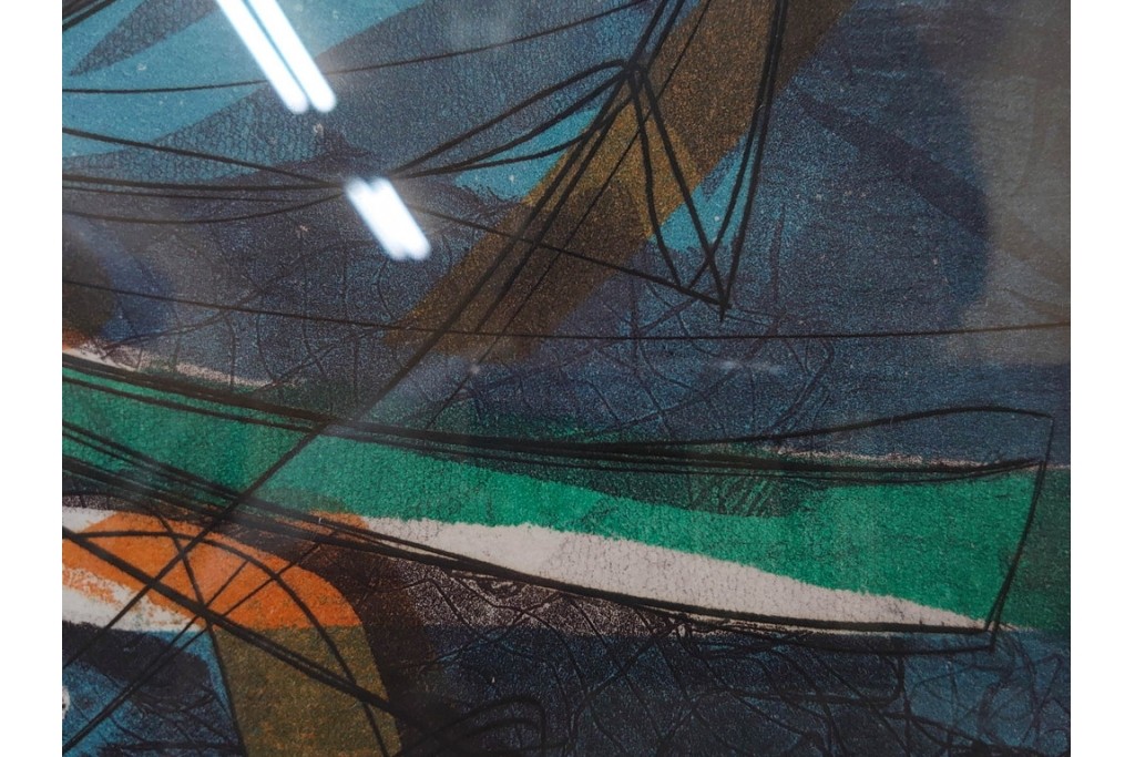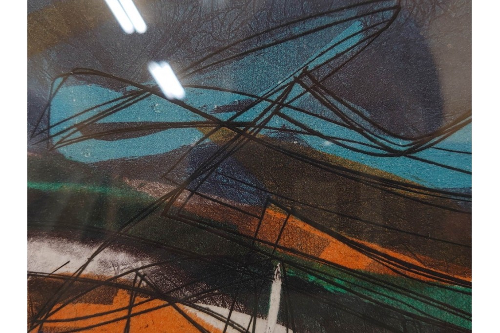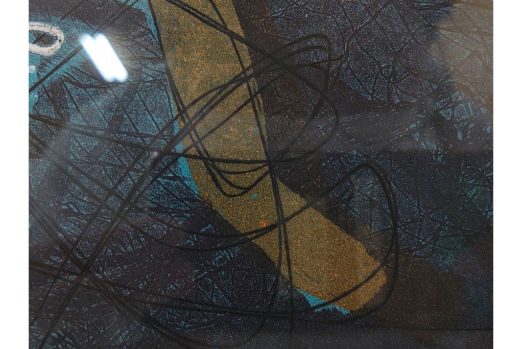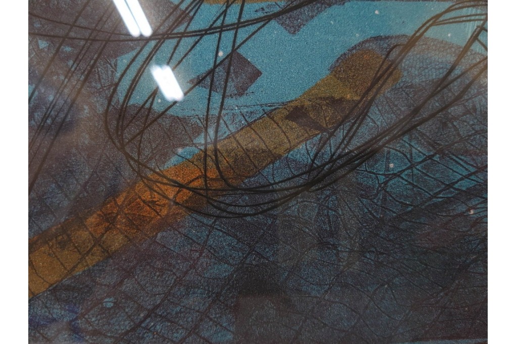 重なり合う線と色面が生み出す動きのある構図が印象的で、深いブルーと鮮やかなアクセントカラーが美しく調和しています。