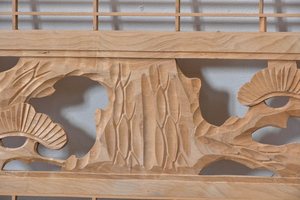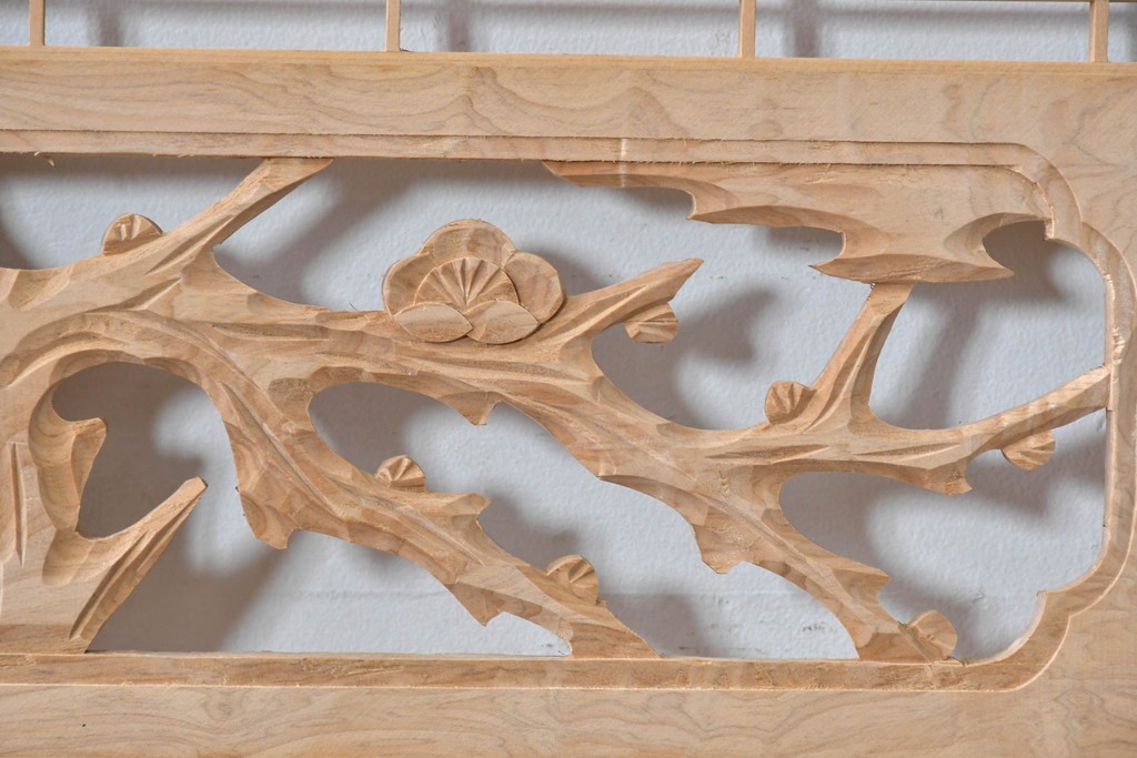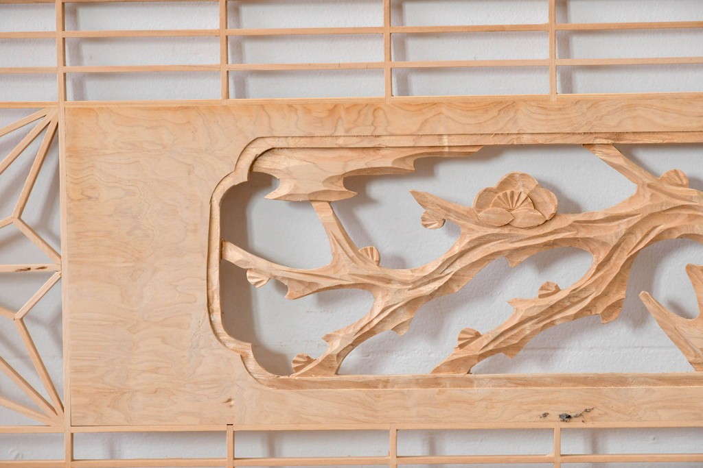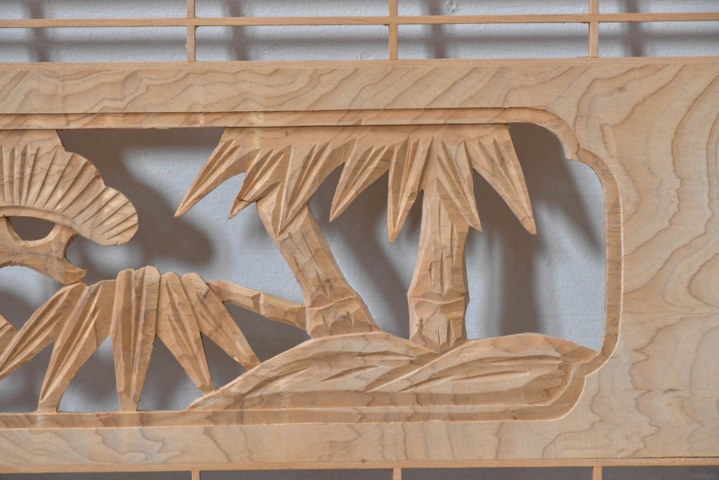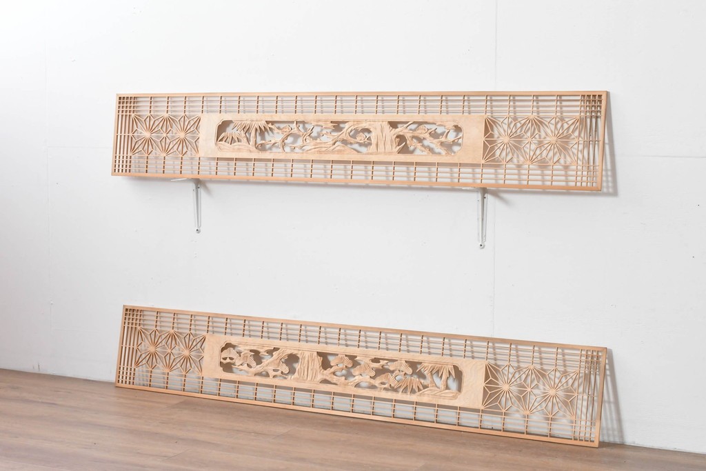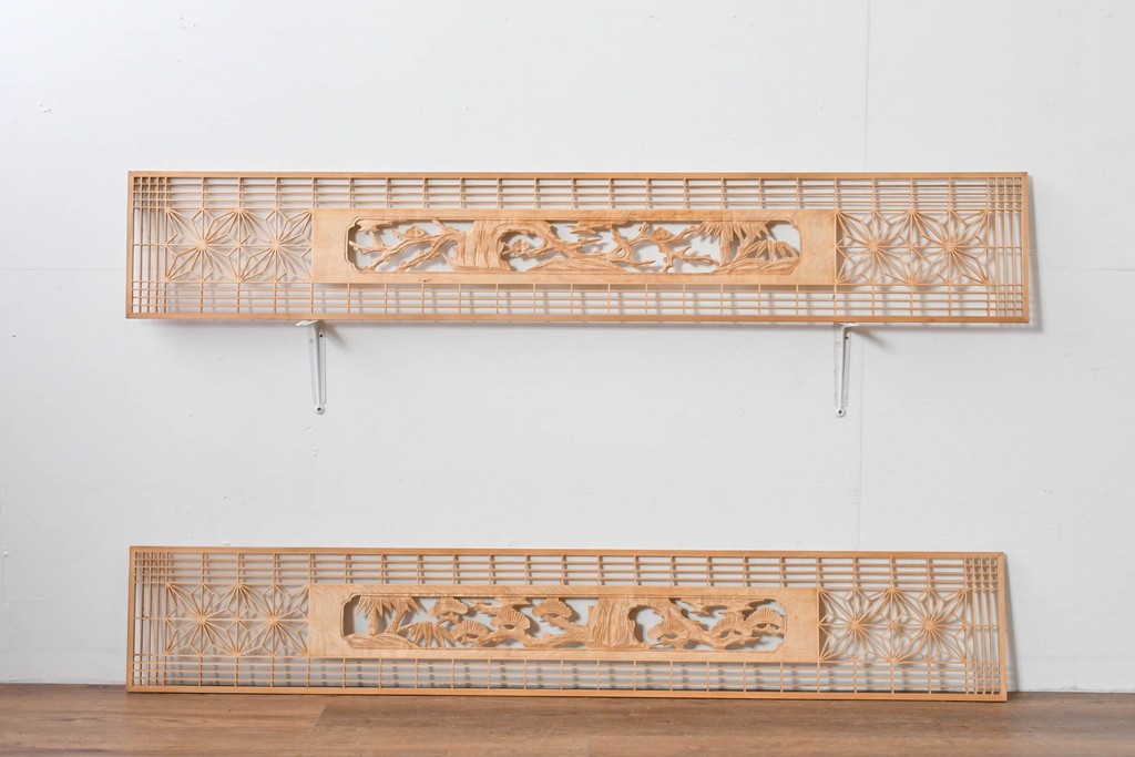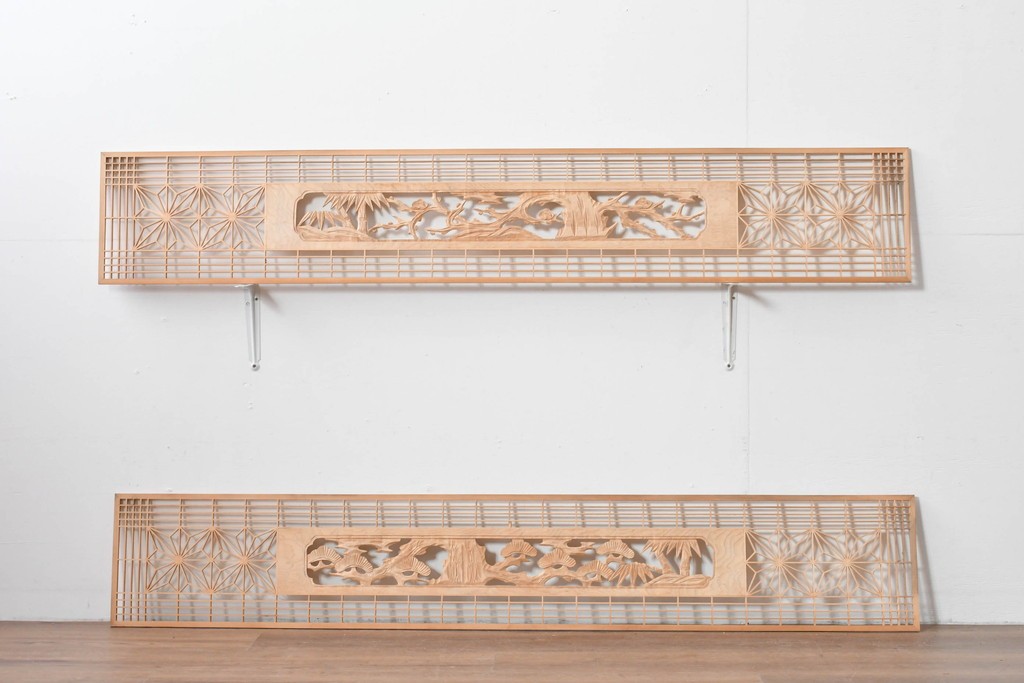 ラフジュ工房> ドア・建具> 組子建具 > ヴィンテージ建具 昭和後期 彫刻入り 松竹梅図の意匠と組子細工が調和する欄間2枚セット (R-085093)