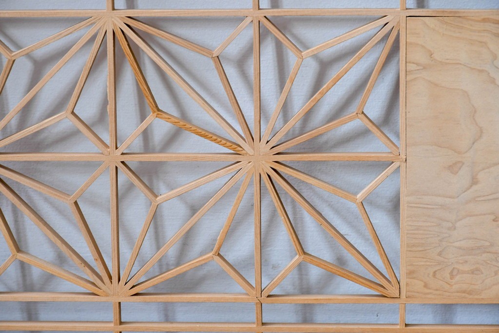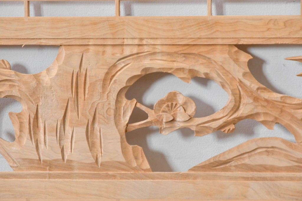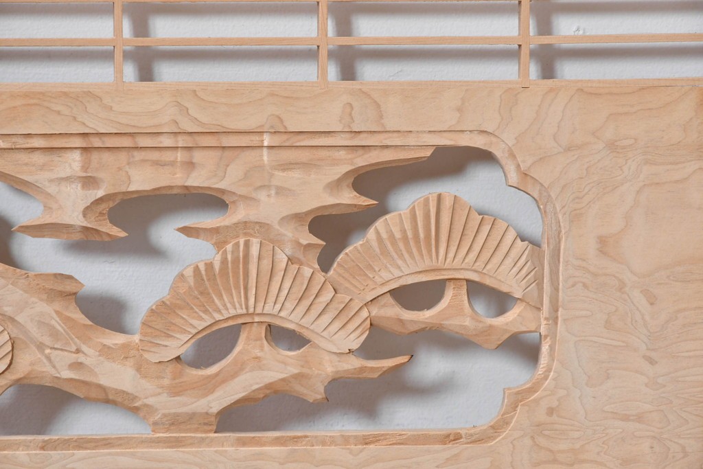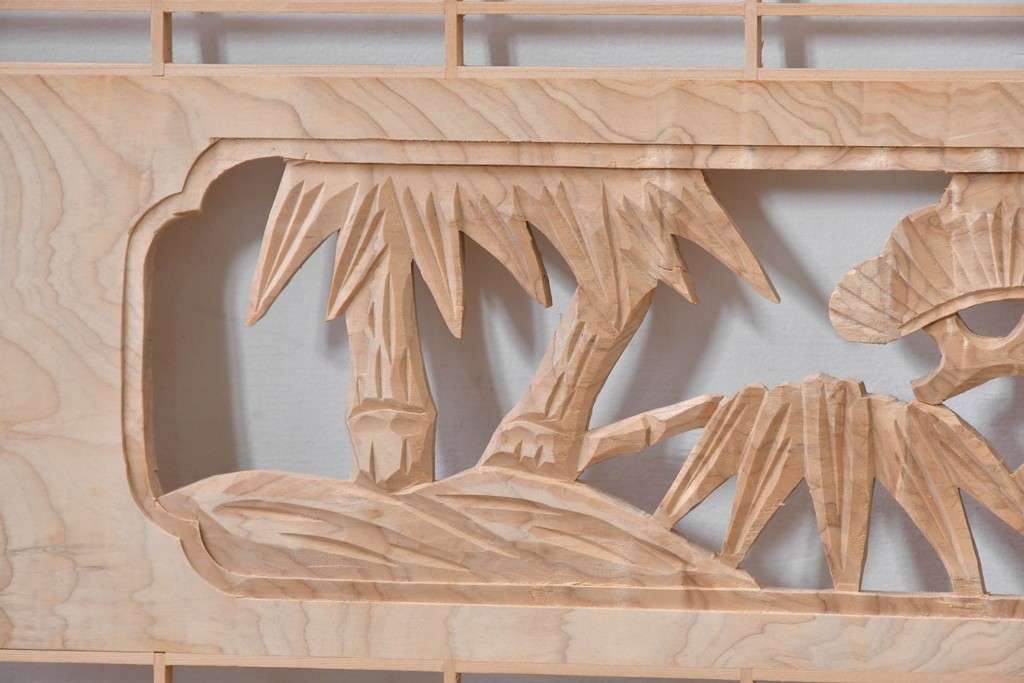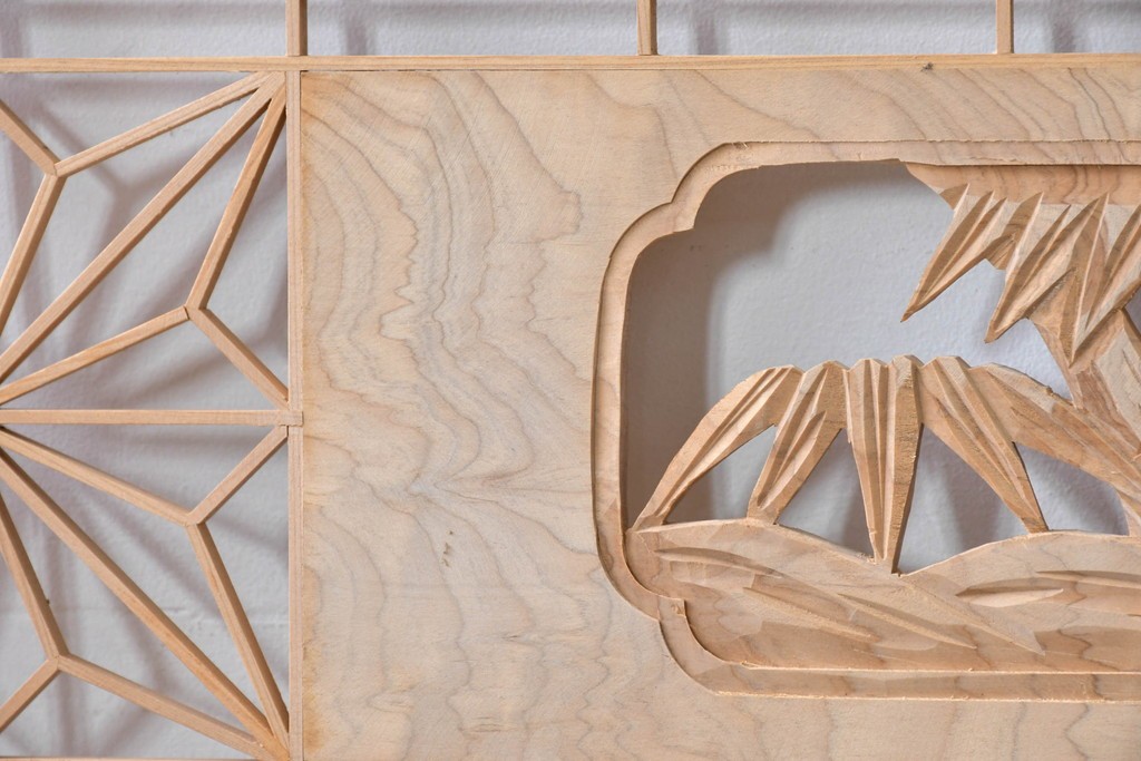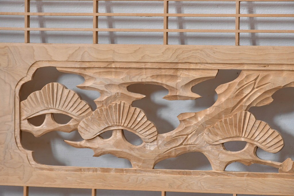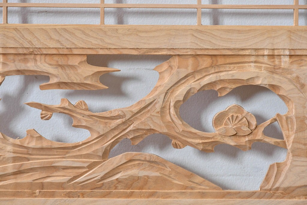 ラフジュ工房> ドア・建具> 組子建具 > ヴィンテージ建具 昭和後期 彫刻入り 松竹梅図の意匠と組子細工が調和する欄間2枚セット (R-085093)