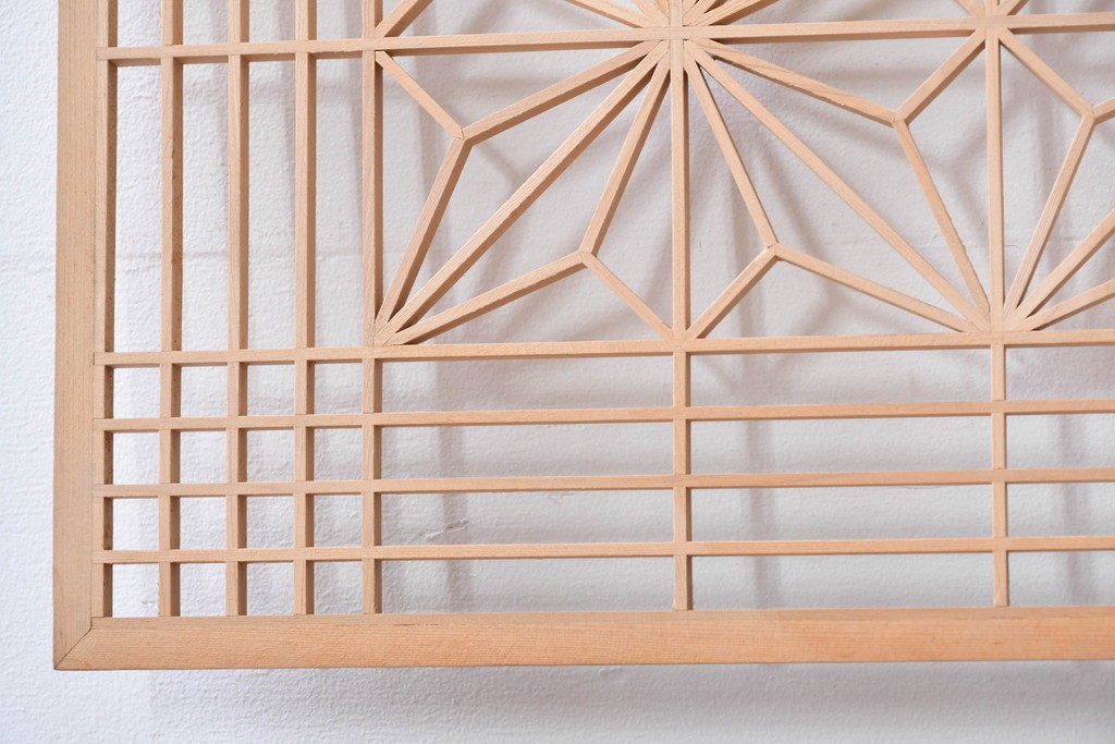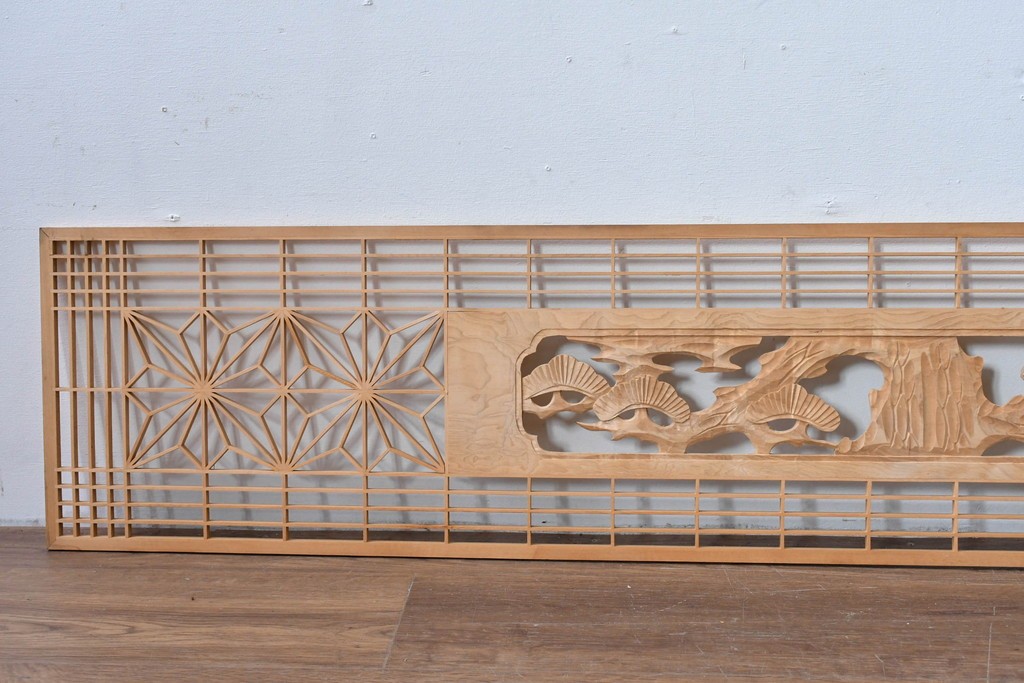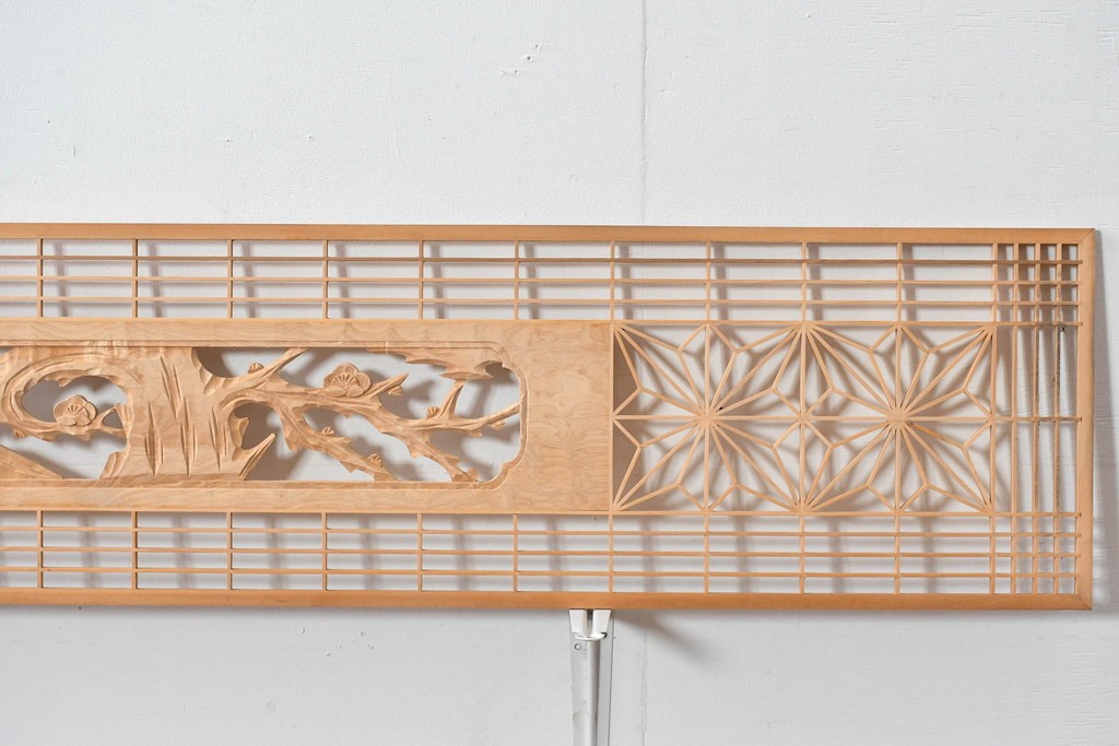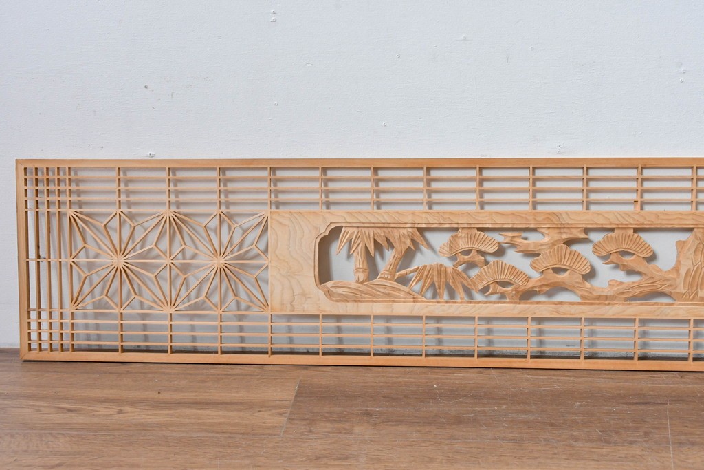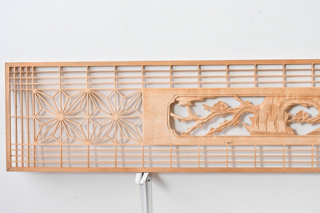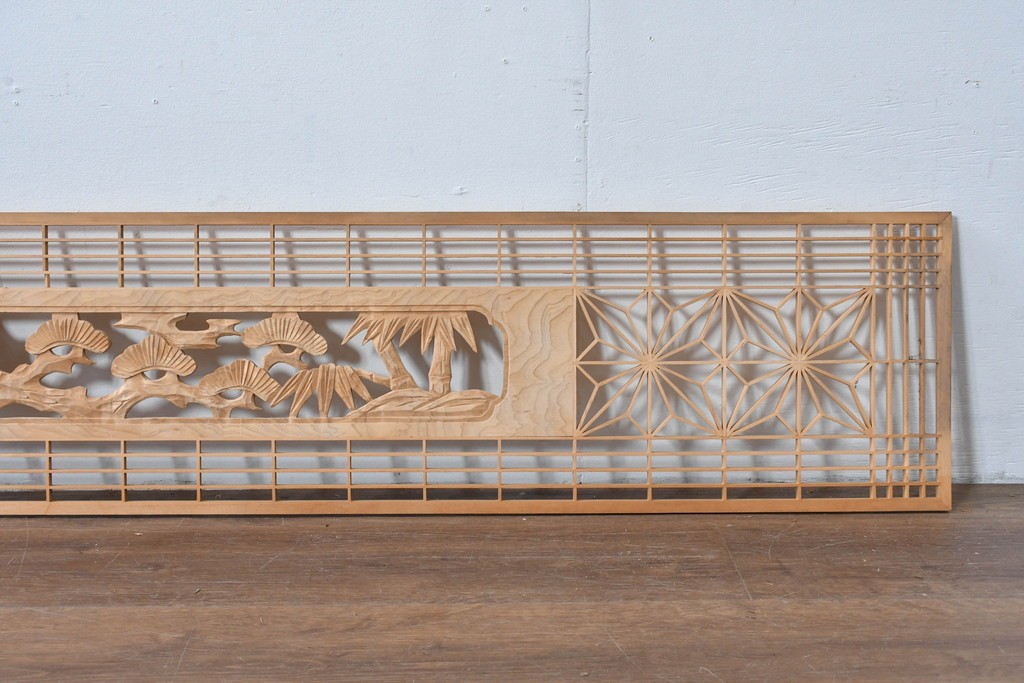 ヴィンテージ建具 昭和後期 彫刻入り 松竹梅図の意匠と組子細工が調和する欄間2枚セット (R-085093)
