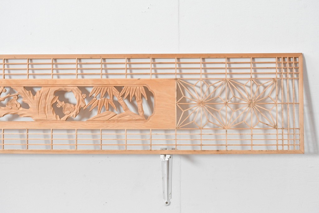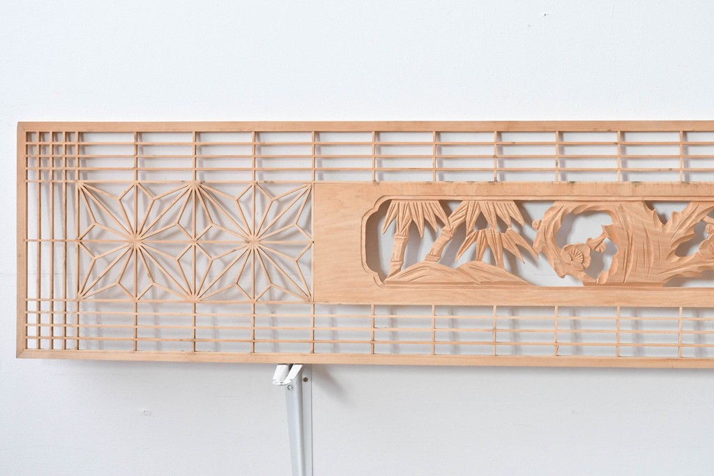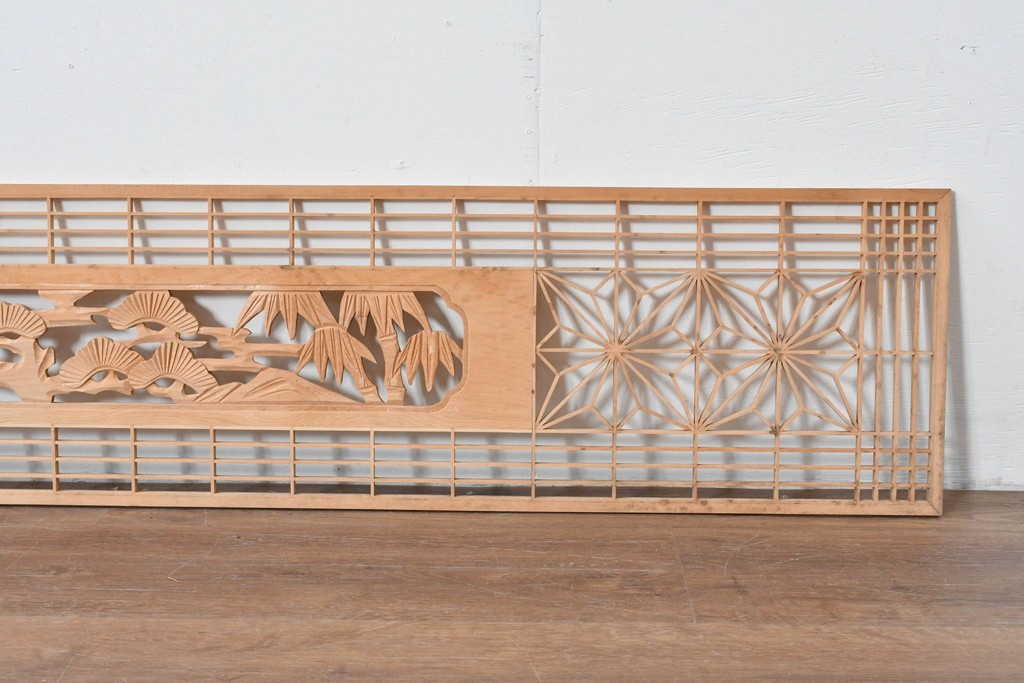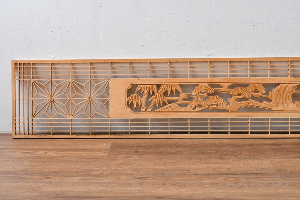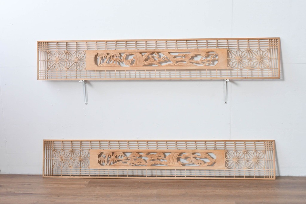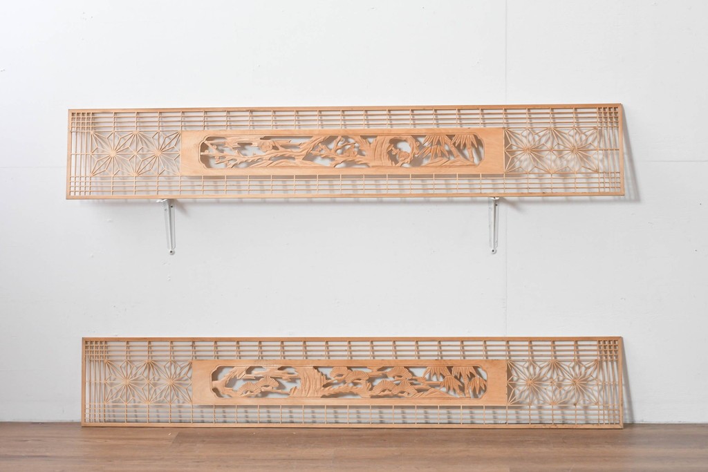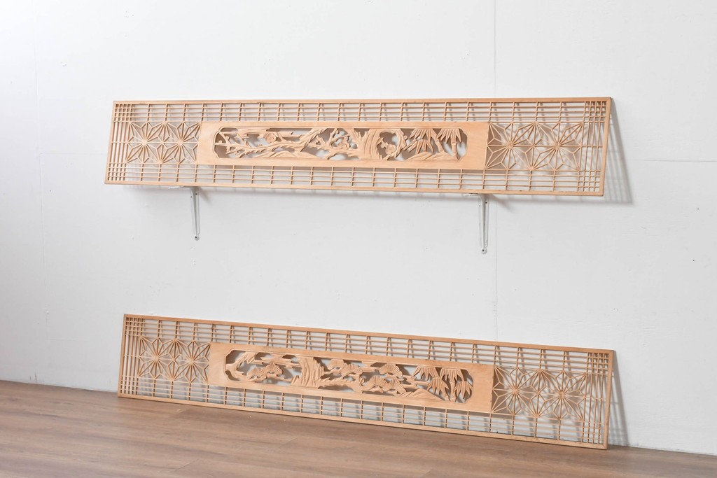 ヴィンテージ建具 昭和後期 彫刻入り 端整な組子に松竹梅を刻んだ欄間2枚セット (R-085096)