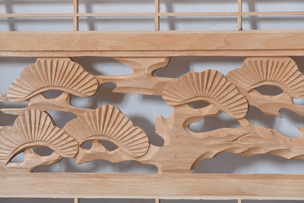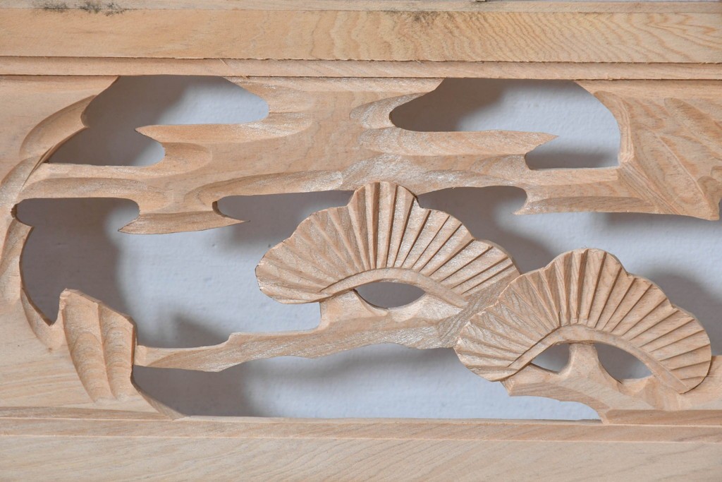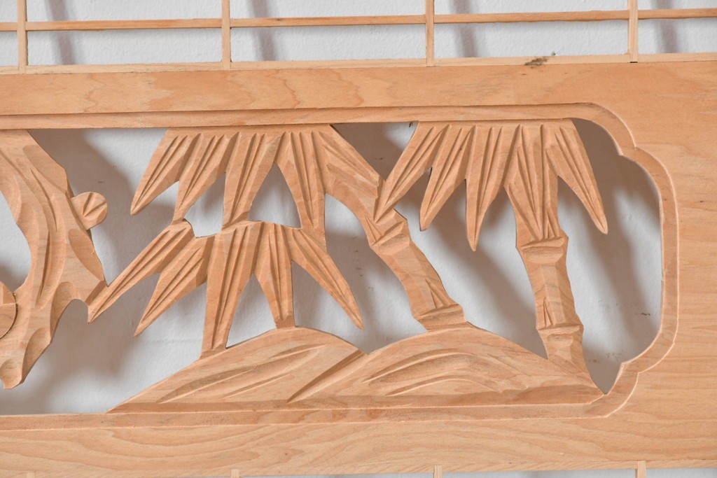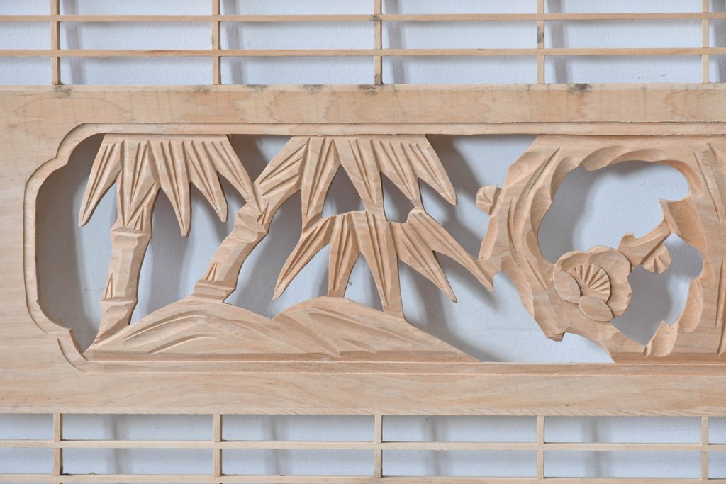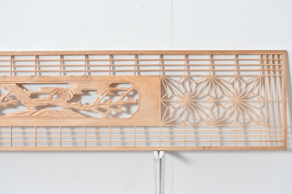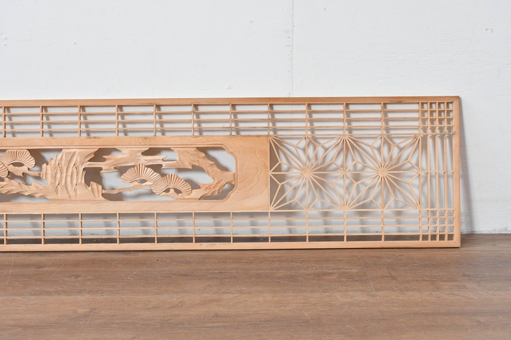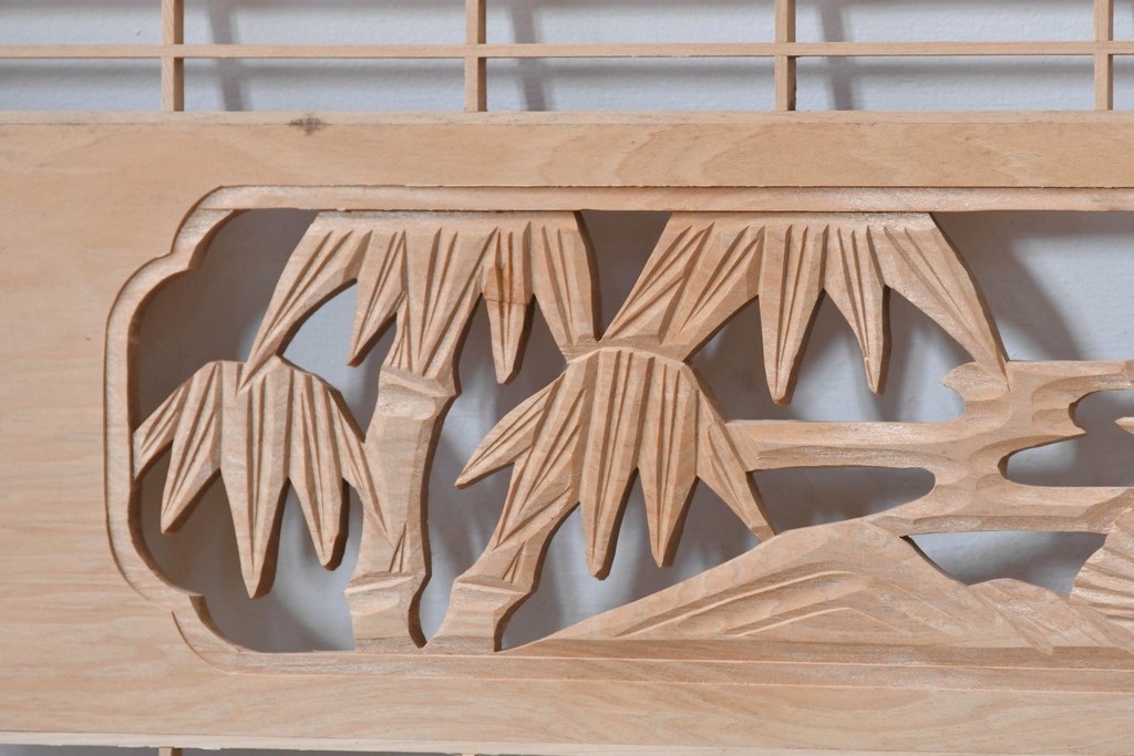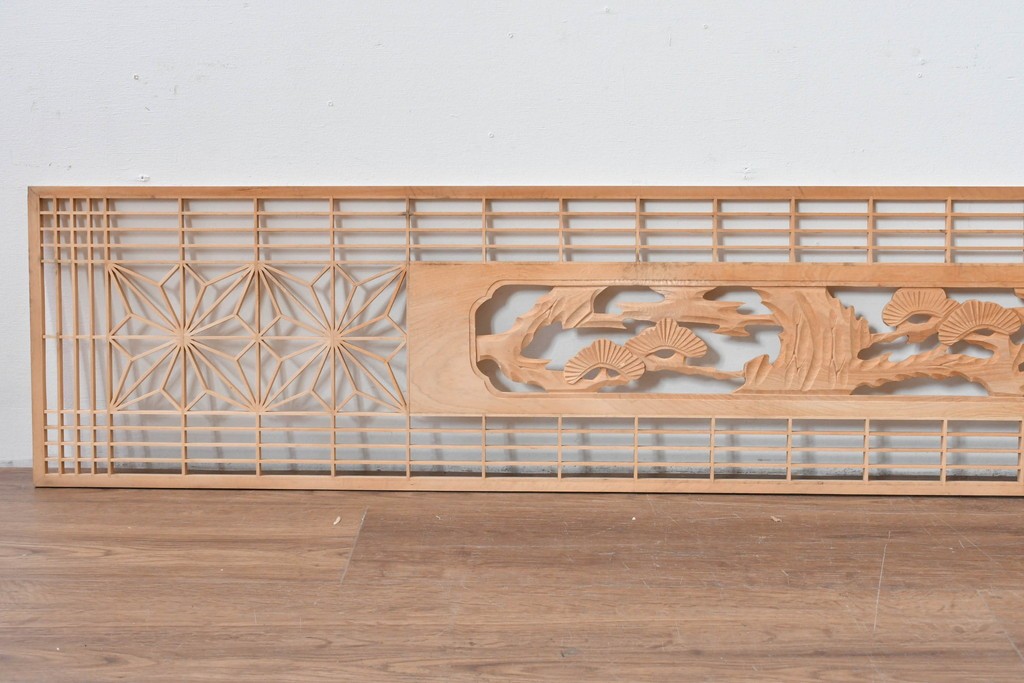 ヴィンテージ建具 昭和後期 彫刻入り 端整な組子に松竹梅を刻んだ欄間2枚セット (R-085096)