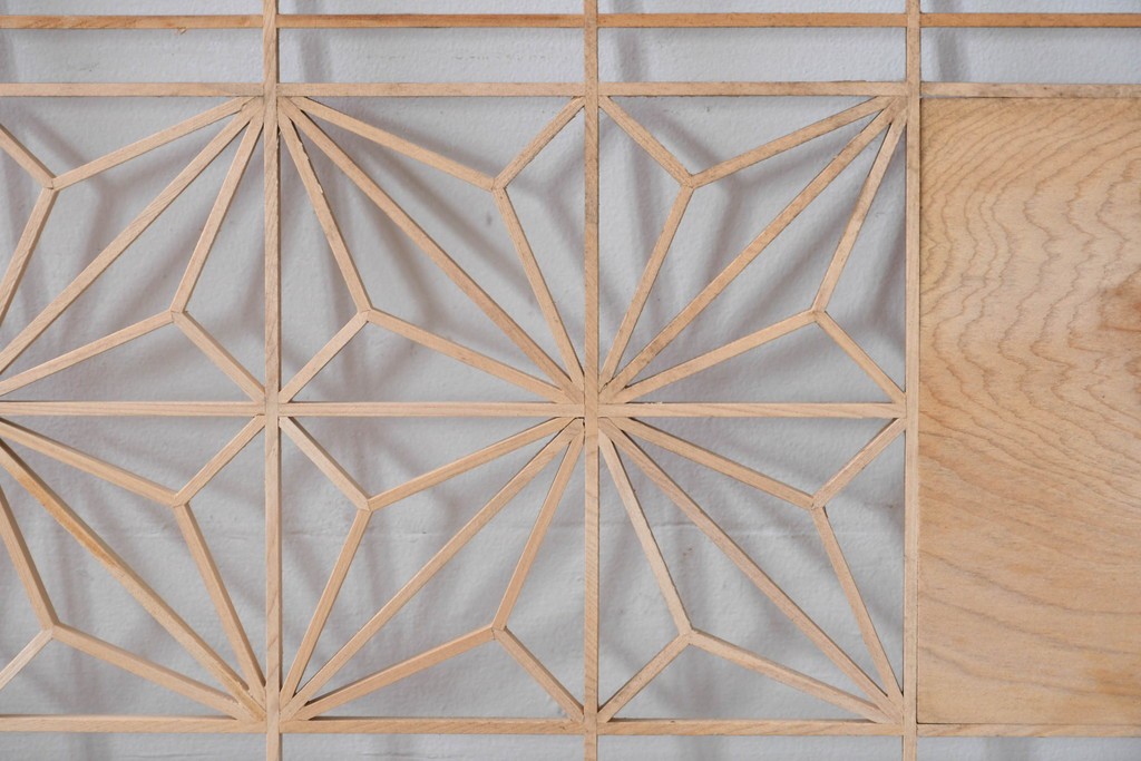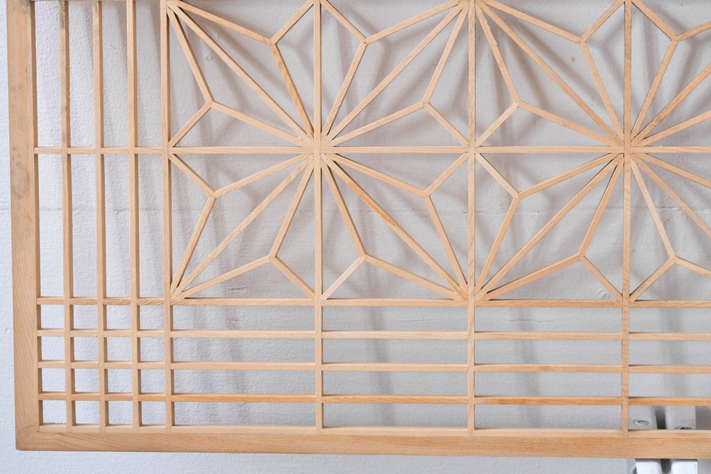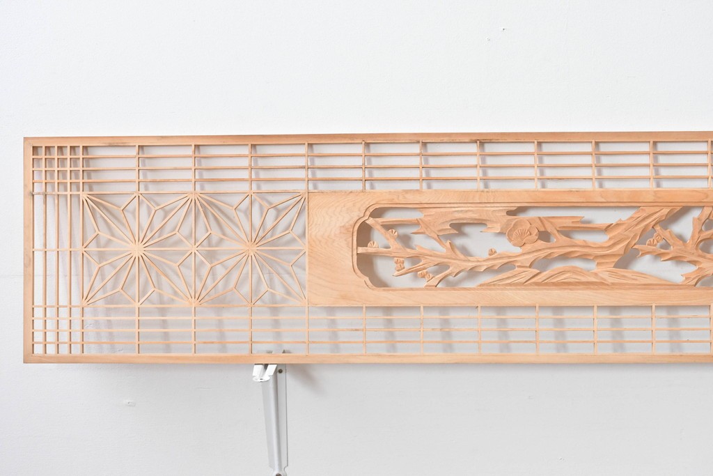 ラフジュ工房> ドア・建具> 組子建具 > ヴィンテージ建具 昭和後期 彫刻入り 端整な組子に松竹梅を刻んだ欄間2枚セット (R-085096)