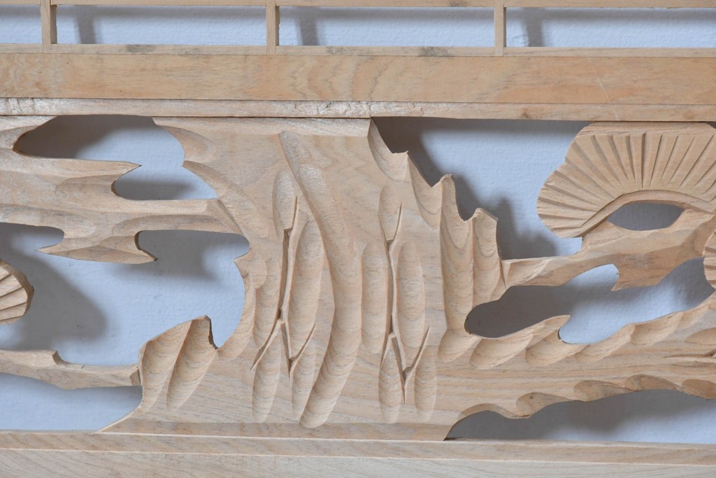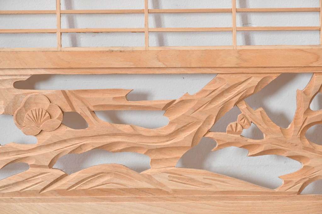 ラフジュ工房> ドア・建具> 明り取り・欄間 > ヴィンテージ建具 昭和後期 彫刻入り 端整な組子に松竹梅を刻んだ欄間2枚セット (R-085096)
