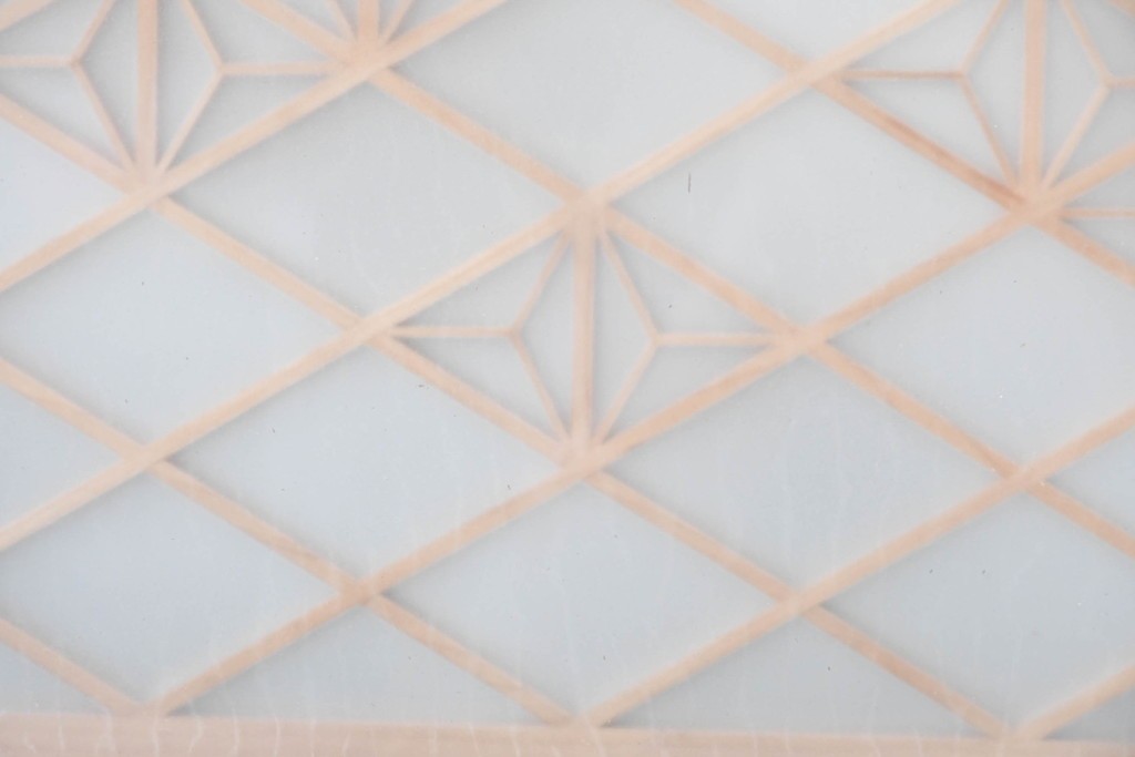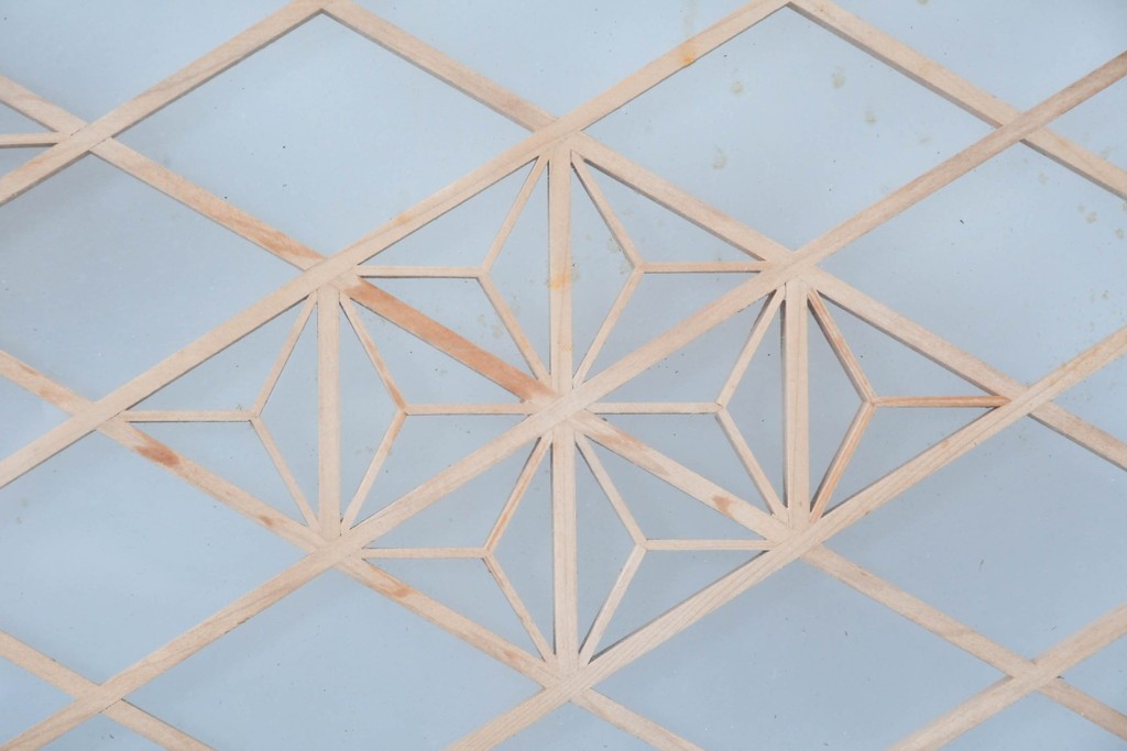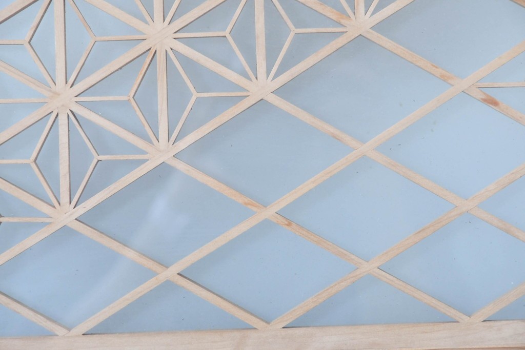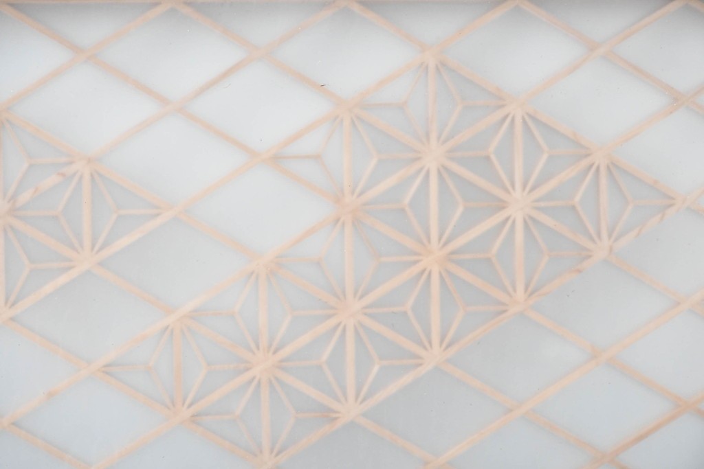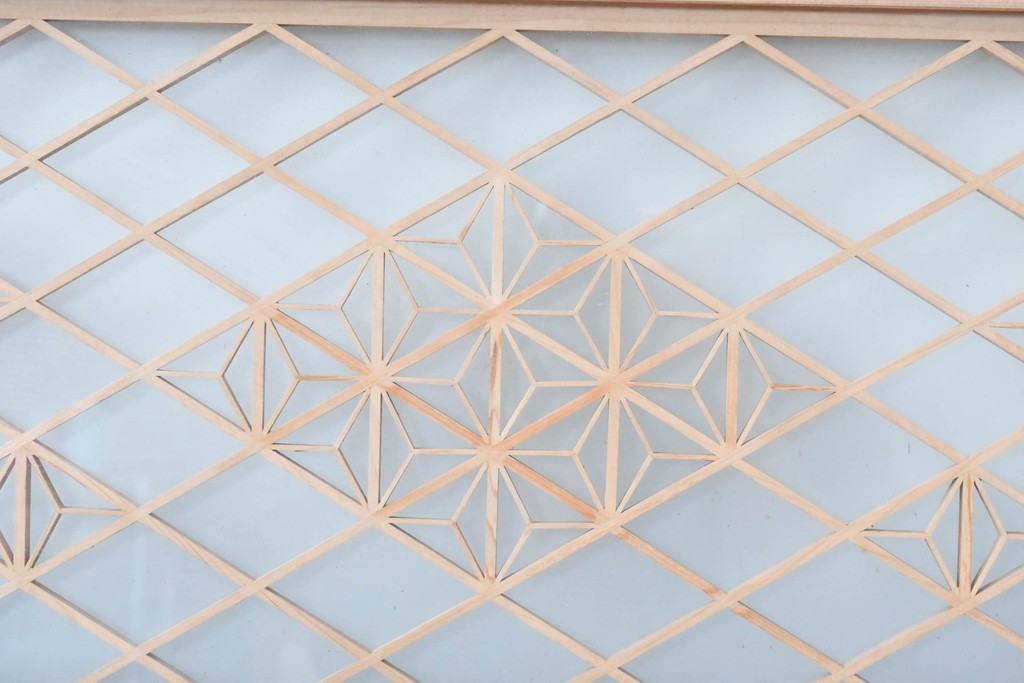 伝統的な木組み技法を用い、規則的な文様が丁寧に形作られています。